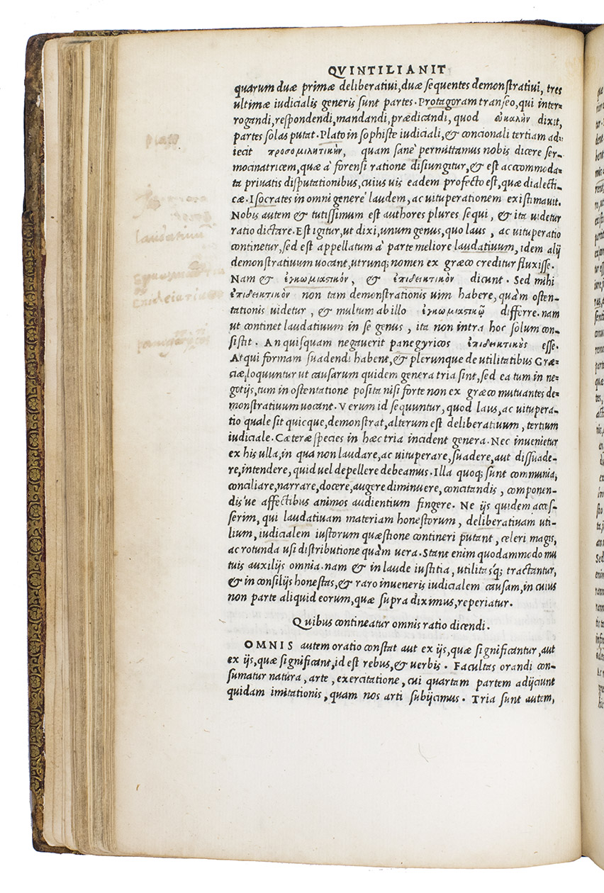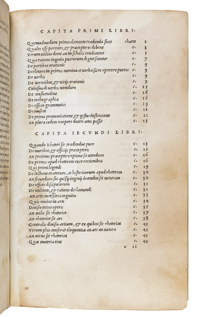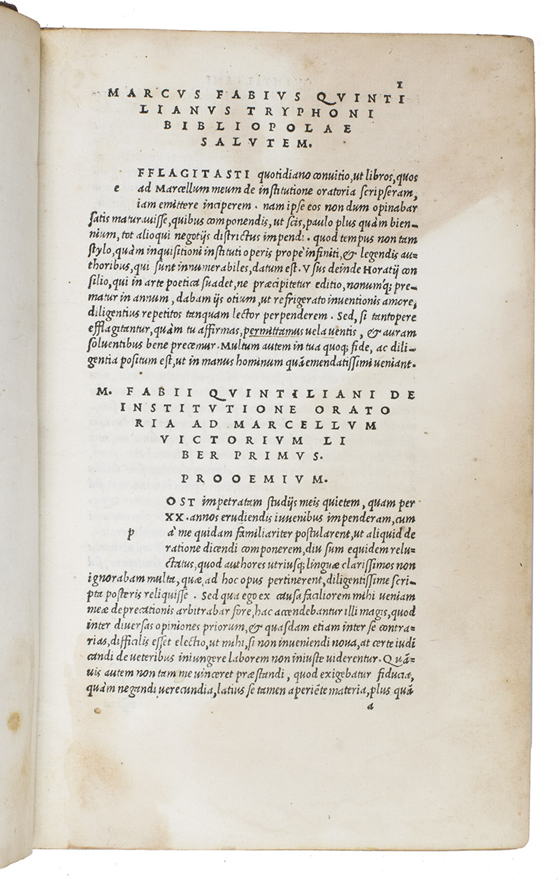 The first Aldine edition (the only one produced by Aldus Manutius himself) of the complete text of Quintilian's De oratoria, on the teaching of speaking and writing. It covers not only the theory and practice of rhetoric, but also the foundational education and development of the orator himself. For Quintilian, the ideal orator or rhetorician was skilled in speaking and also a moral man. The Institutiones can therefore be described as a treatise on education, a manual of rhetoric, a reader's guide to the best authors and a handbook of the moral duties of the orator. Although much of what he writes is similar to Cicero, Quintilian emphasizes teaching. He was recognized by his contemporaries and strongly influenced the schools that the Romans spread throughout the Empire until the fifth century. The present edition is well printed and set entirely in one size of italic type, a style Aldus introduced in 1501.