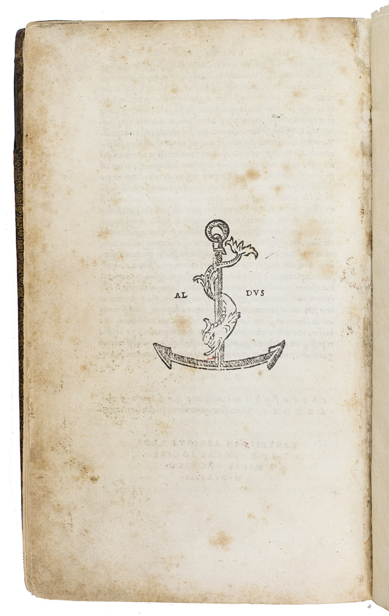 (Colophon: Venice, "aedibus Aldi et Andreae soceri" [= Aldus Manutius & Andre Torresani d'Asola], August 1514). 4to. With Aldus's famous woodcut anchor device on the title-page, repeated on the back of the last text page. Gold-tooled red morocco (ca. 1700), rebacked and given a black morocco spine label in the 19th century. [4], 230 ll.