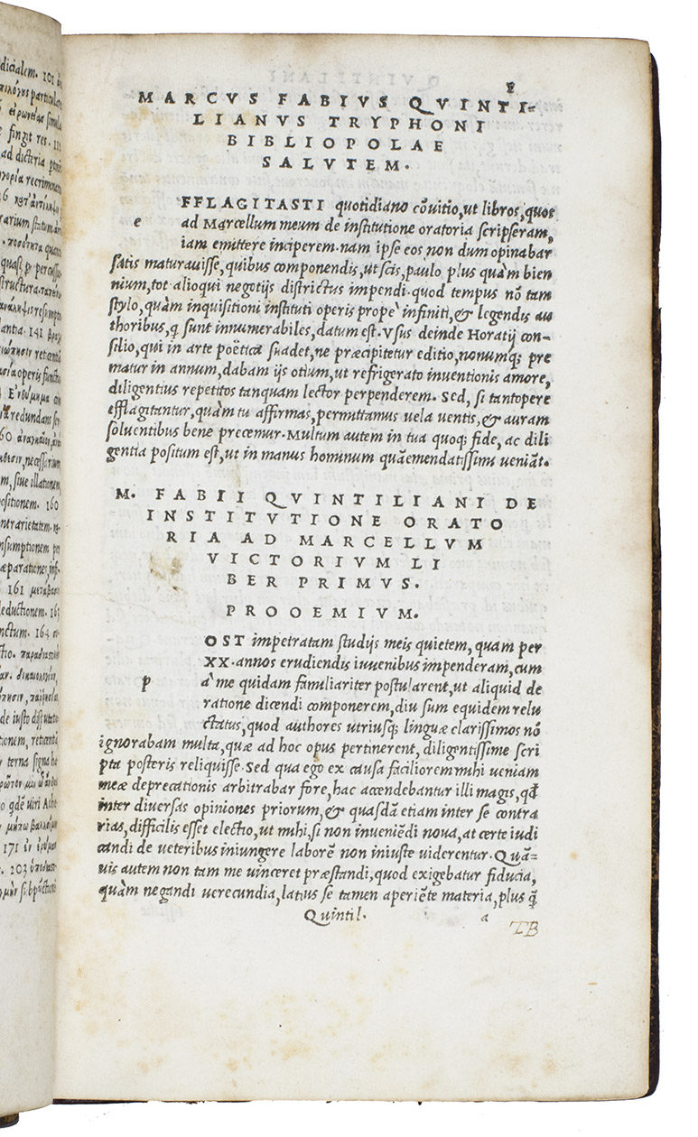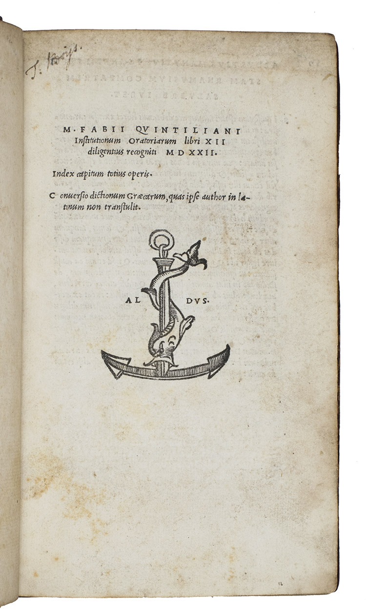 Second Aldine edition, describing itself as revised, but almost a page-for-page reprint of Aldus's 1515 edition, of the complete text of Quintilian's De oratoria, on the teaching of speaking and writing. Quintilian (Spain ca. 35 - 95 AD) gave up teaching and presenting pleas in 88 AD and spent his retirement writing his Institutiones Oratoriae, his only extant work. It covers not only the theory and practice of rhetoric, but also the foundational education and development of the orator himself. For Quintilian, the ideal orator or rhetorician was skilled in speaking and also a moral man. The Institutiones can therefore be described as a treatise on education, a manual of rhetoric, a reader's guide to the best authors and a handbook of the moral duties of the orator.