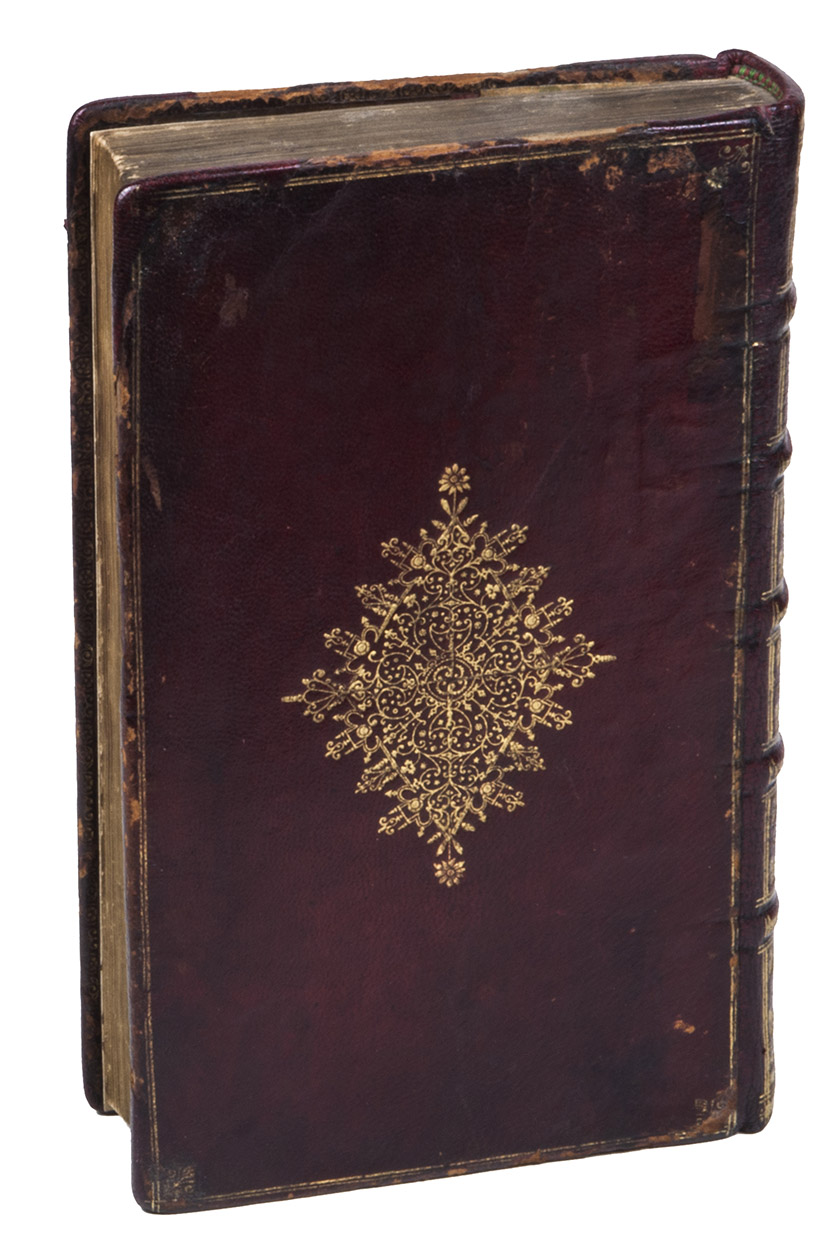 (Colophon: Venice "In Aedibus Aldi, et Andreae soceri" [= André d'Asola & sons], January 1521 [= 1522]). Narrow 4to in 8s (21 x 13 cm). With Aldus's anchor and dolphin publisher's device on the first and last pages. Set entirely in a single size of Aldine italic, with some headings, running heads, etc., set in its (upright) capitals. Gold-tooled red morocco (ca. 1700), each board with delicate centre-piece a petit fers, rebacked in gold-tooled red morocco. [4], 230 ll.