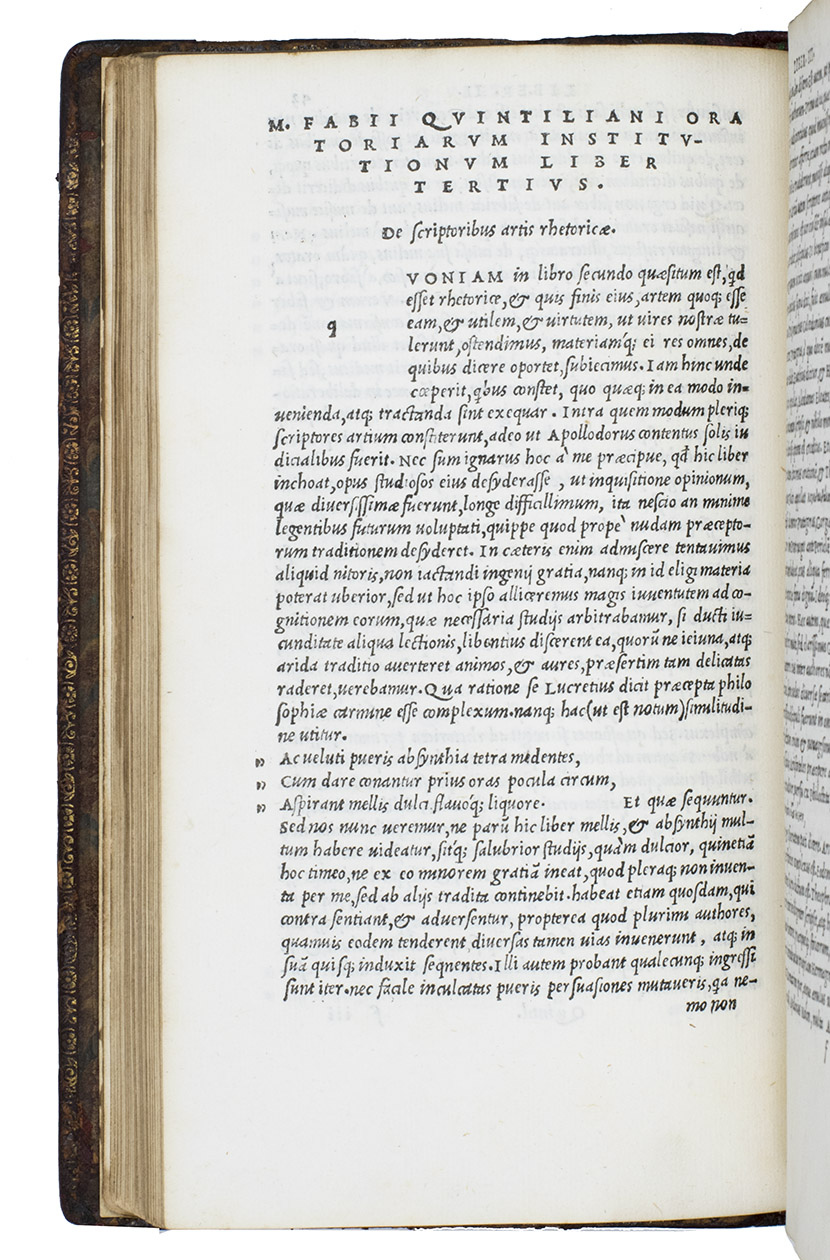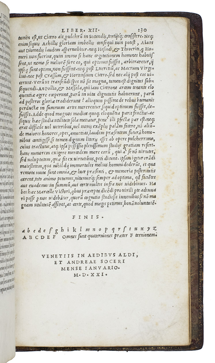 After a brief revival in 12th century France, Humanists at the end of the 14th century renewed interest in Quintilian, especially after 1416, when Poggio found a complete manuscript in the monastery at St. Gall. The present book is beautifully printed and set in italic type, a style Aldus introduced in 1501. Andrea Navagero (1483-1527), one of the young poets from the Paduan circle, edited the text in close collaboration with Aldus himself. He also edited the Aldine Virgil, Cicero, Lucretius and Terence from 1514 to 1517, emerging as one of the ablest Latin editors of his time. As librarian of the Marciana in Venice, he also played a large role in the re-organization of its long-neglected manuscripts.