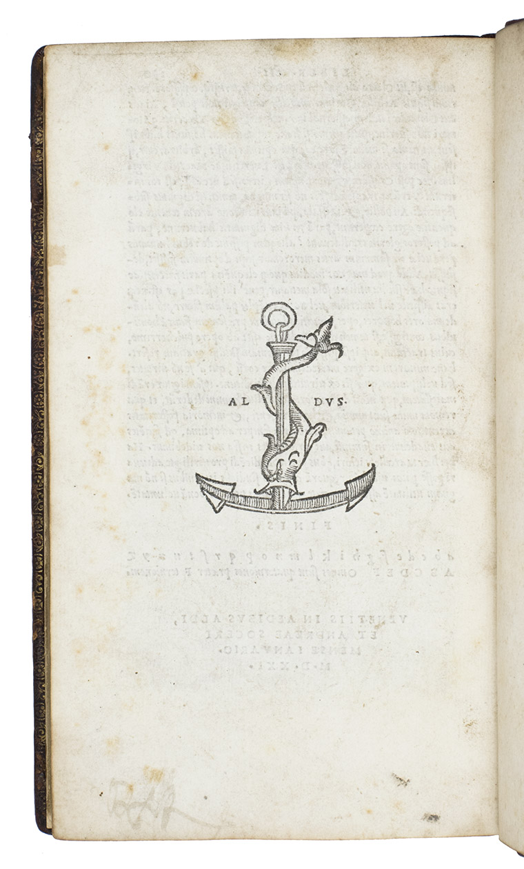 With the armorial book-plate of Joseph Romilly and owner's name J. Boys on first 3 pages and endleaves, another owner's name on an end leaf partly erased: B...d...s 173[?]8. First four leaves slightly soiled, but still in very good condition. Binding skillfully restored, and re-backed. Adams Q-56; BMC STC Italian, p. 546; Lowry, The world of Aldus Manutius (1979), pp. 204, 233; Renouard, Alde, p. 93, no. 14; UCLA 208; USTC 851768.