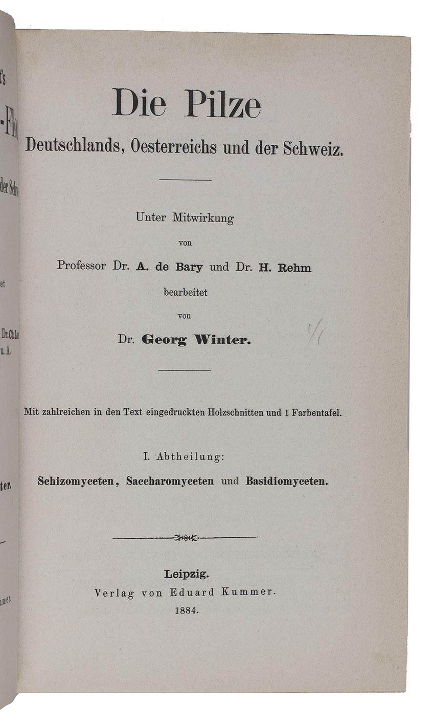 Reprint of the second edition of an extensive "flora" of the fungi from Germany, Austria and Switzerland, compiled by Georg Winter and others, being the first volume of a larger work on German Cryptogamae edited by Ludwig Rabenhorst (1806-1881). Listed are 2689 fungi, with brief comments on their appearance and habitat.