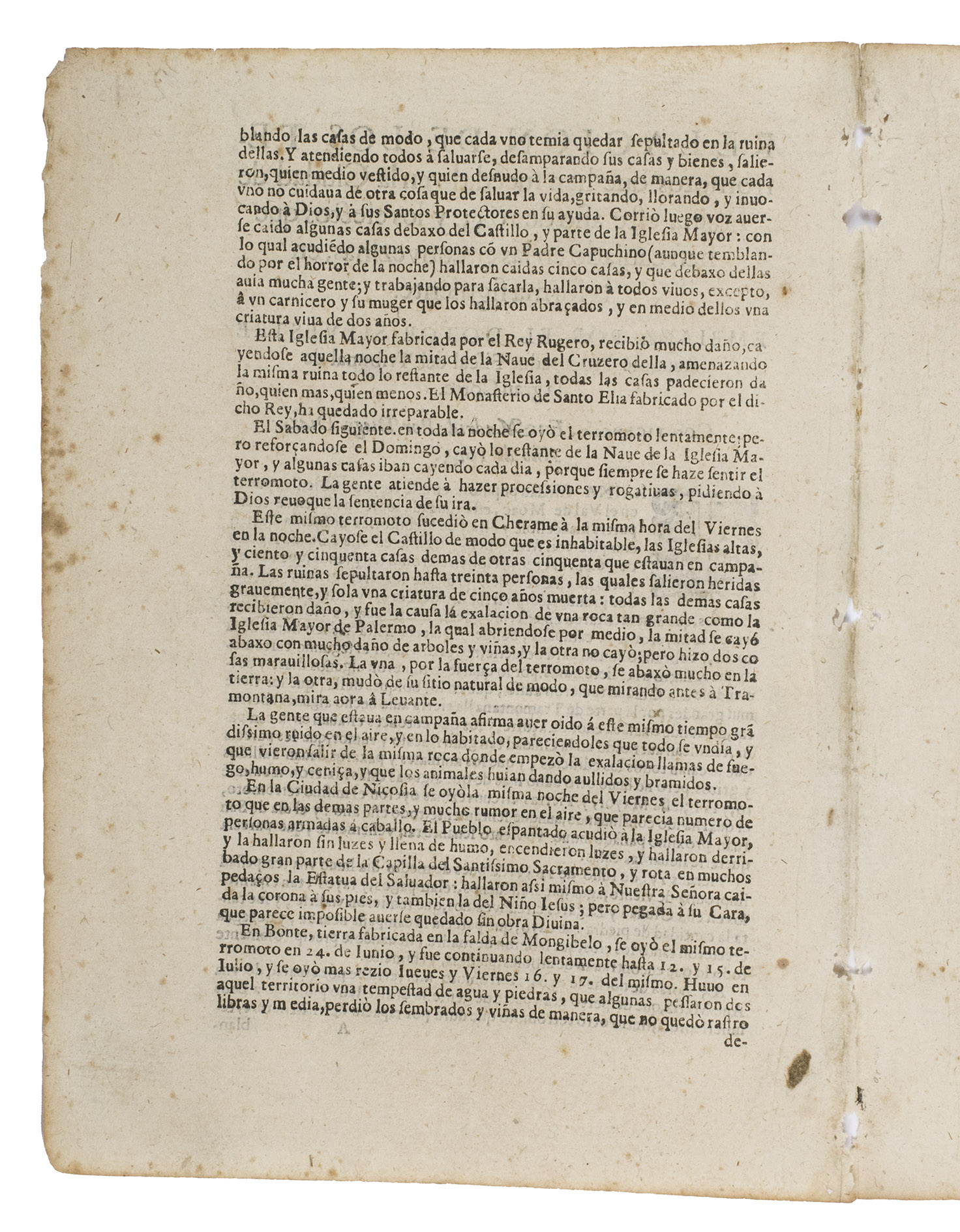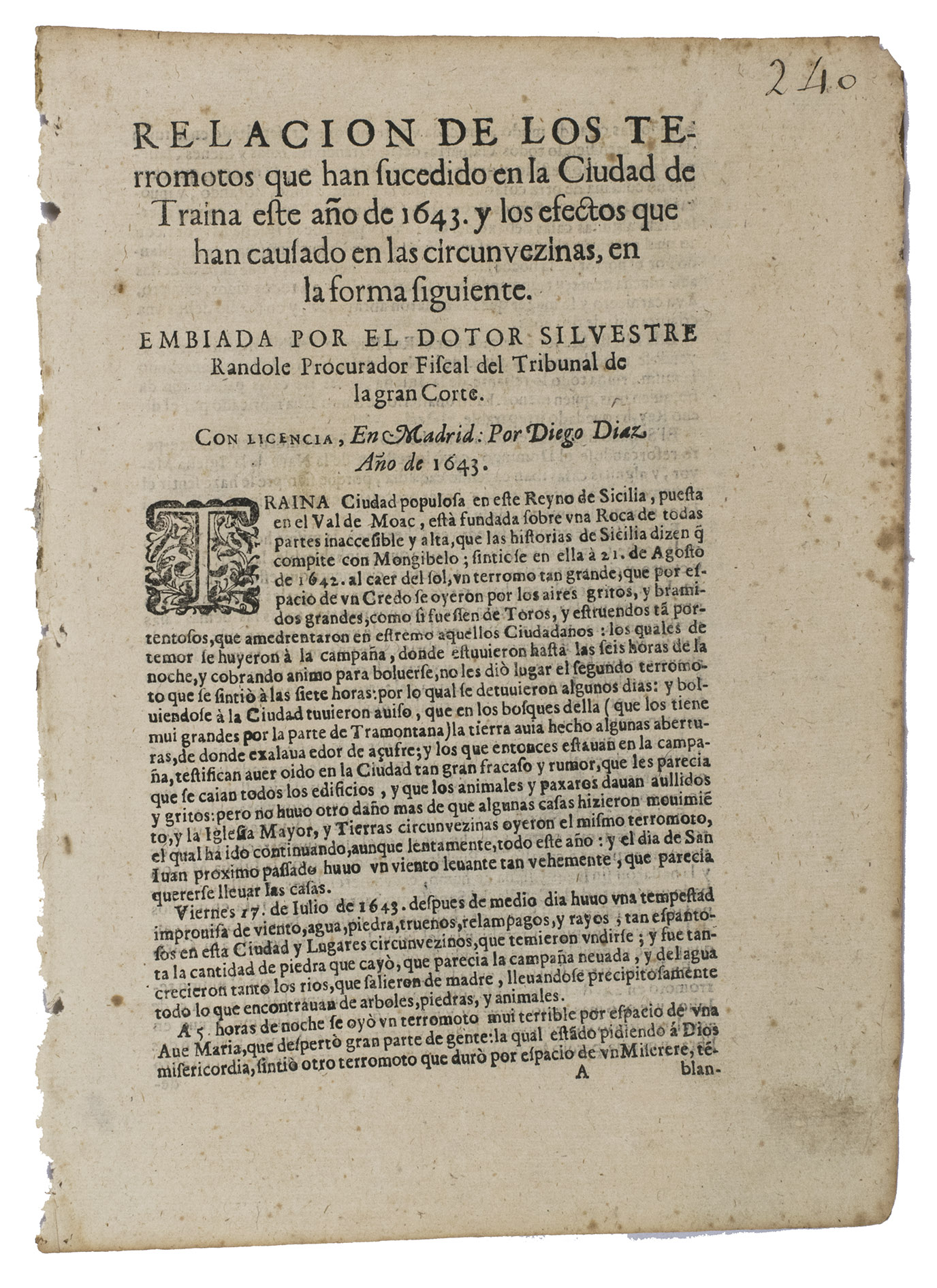Relacion de los terremotos que han sucedido en la ciudad de Traina este año de 1643, y los efectos que han causado en las circunvezinas.
