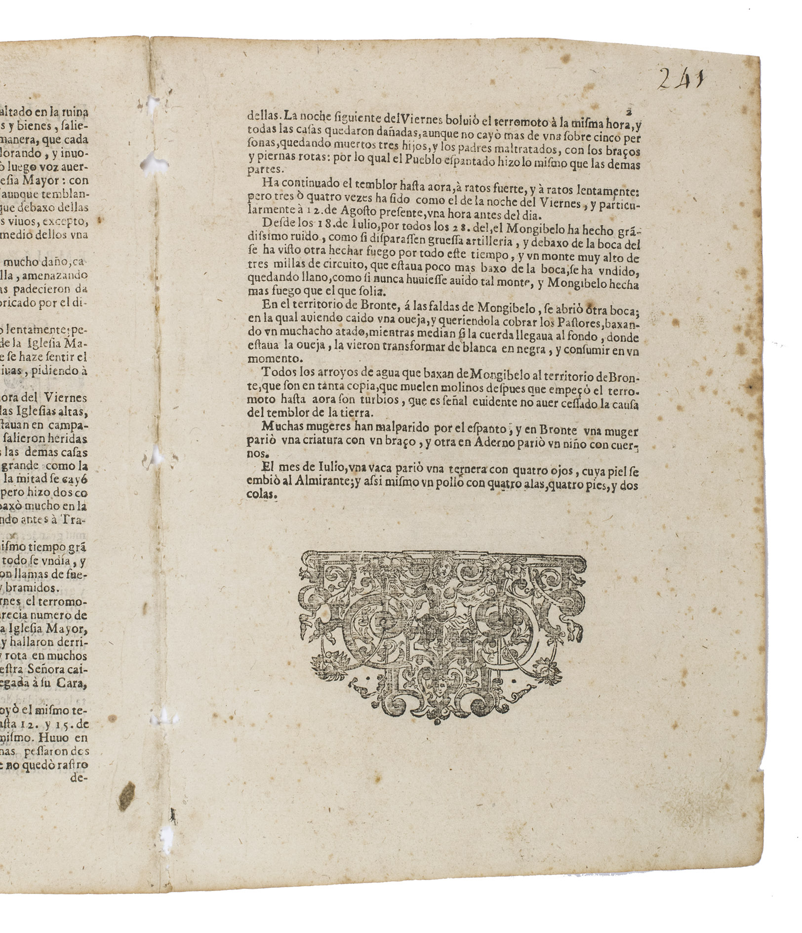 First edition of this rare relation of the earthquake that shook the city of Traina (Sicily), in July 1643; the author narrates with careful attention to detail the events leading and following the disaster -mentioning the natural phenomena prior to actual earthquake, and the destruction caused. Amongst the consequences, the author notes several women with miscarriages, and animal freaks being born in the aftermath.