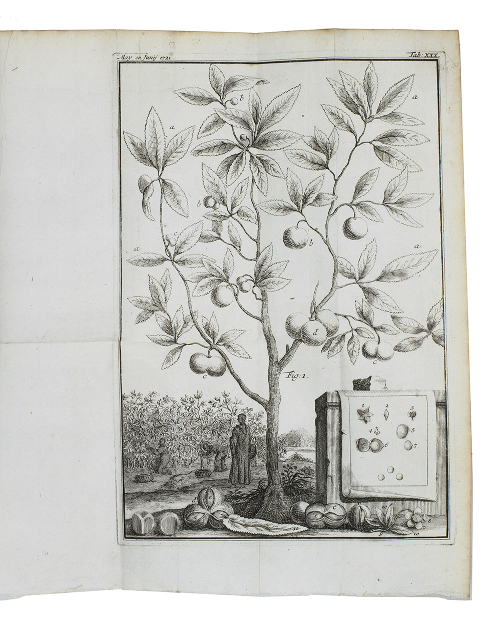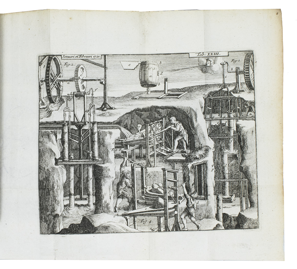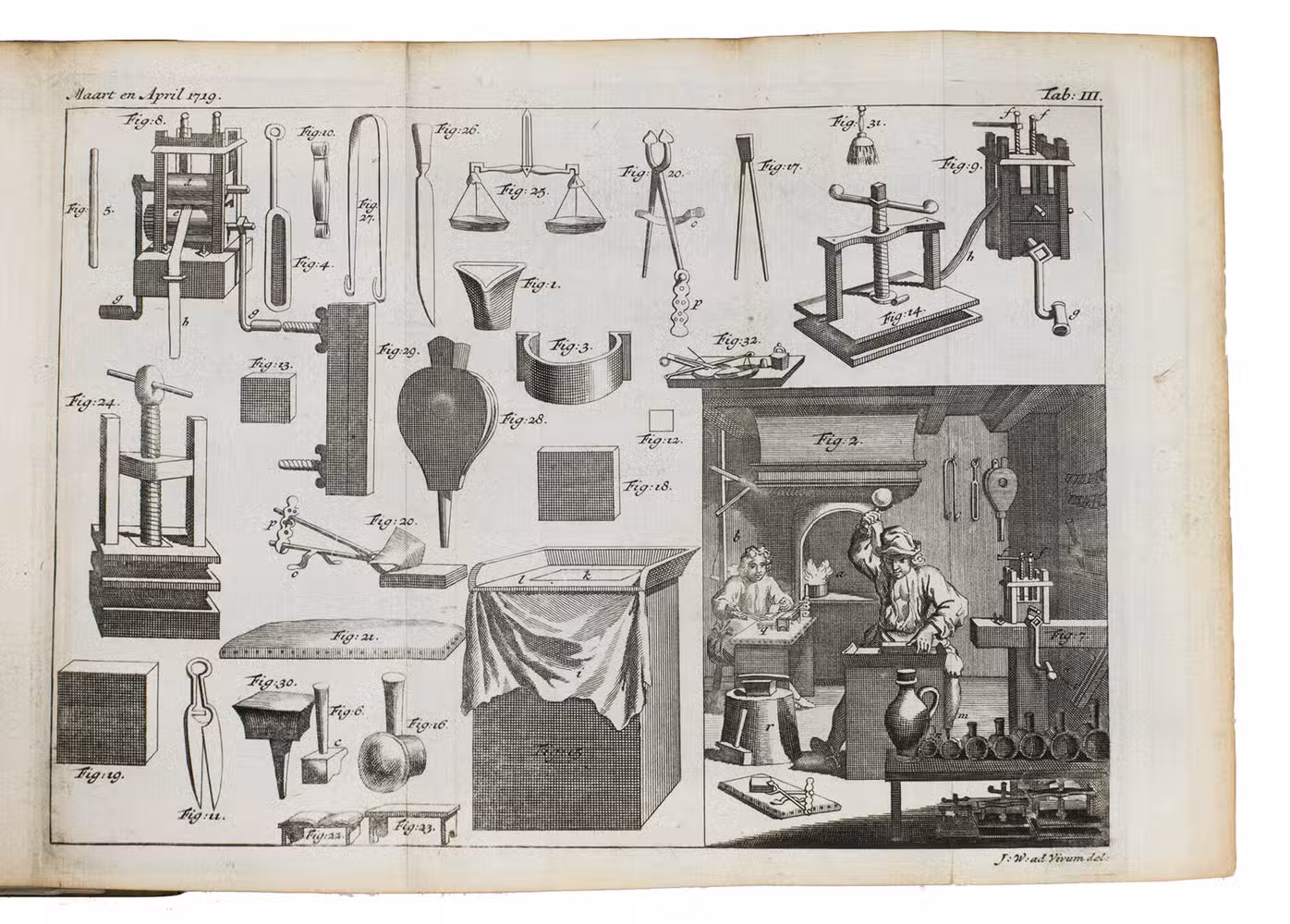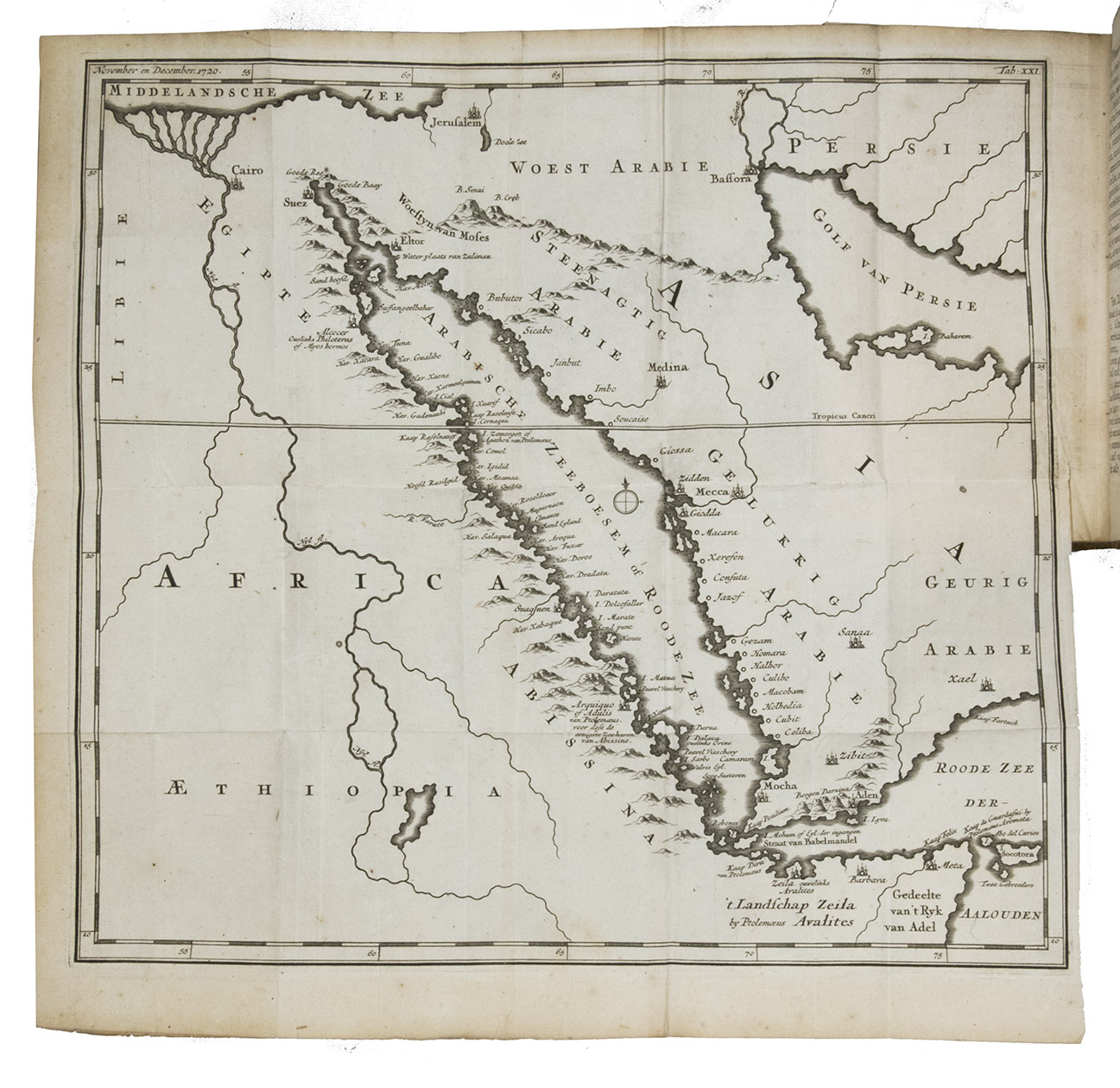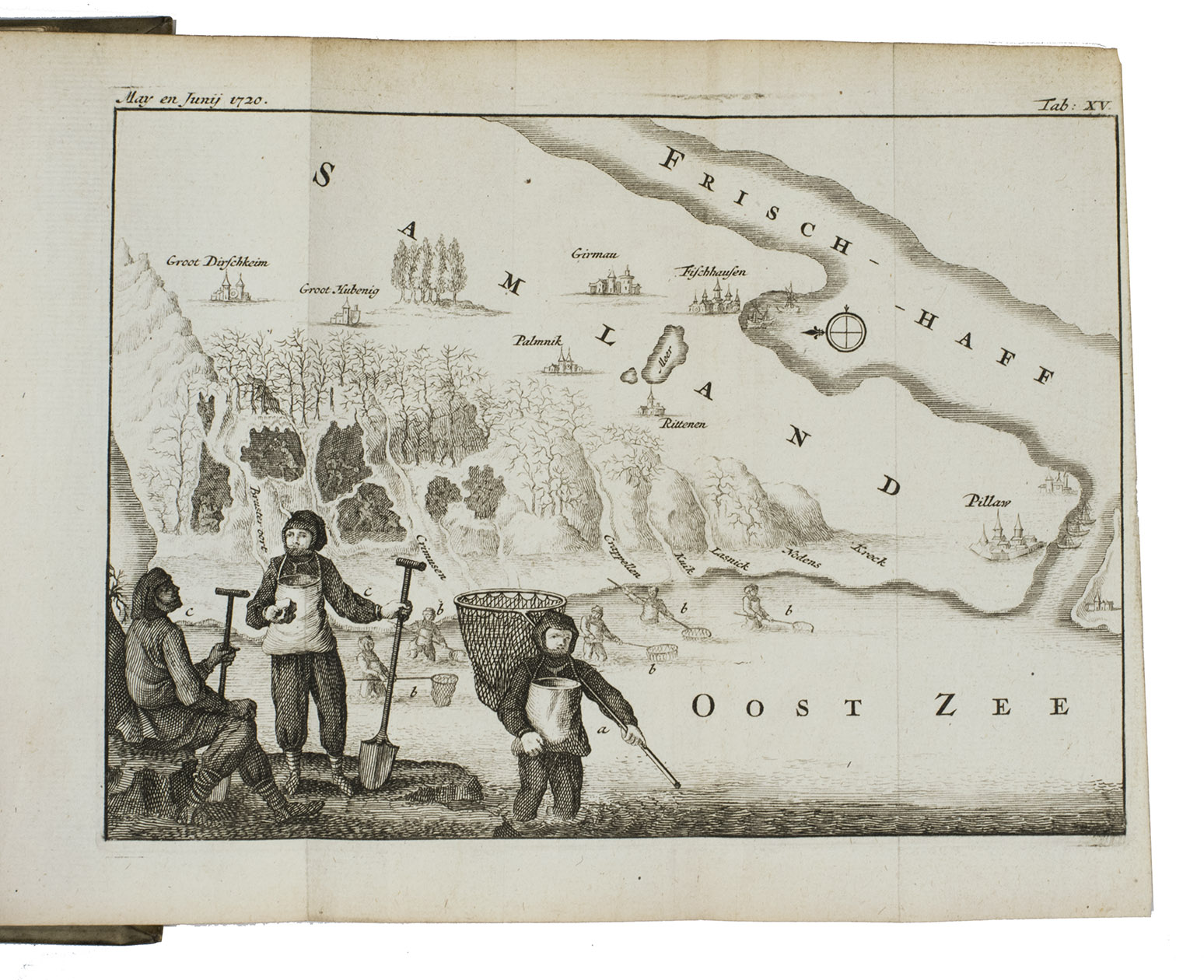 Several folding engraved plates illustrate all kinds of machines, crafts and natural history specimens. One folding plate depicts a workshop where gold wire is made (the only plate that is signed: Jan Wandelaar), multiple plates show mining technology. Other plates show sugar cane, several shells, plants and insects. A long part describes and illustrates the production of sugar. Some of the other subjects discussed include cacao, tea, quinine, indigo, astronomy, geology, amber, coral, minerals, horticulture and much more. The 4 folding maps show the Caucasus, the Baltic Sea, the Arabian Peninsula (including Bahrain) and the Holy Land.