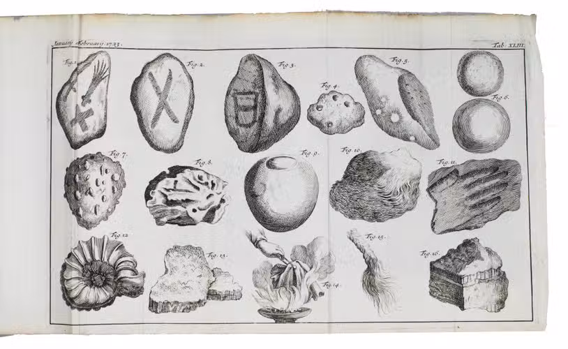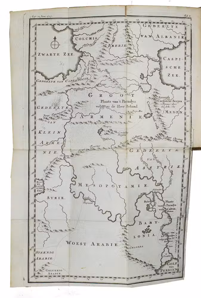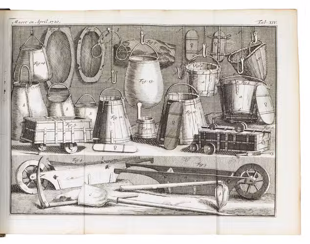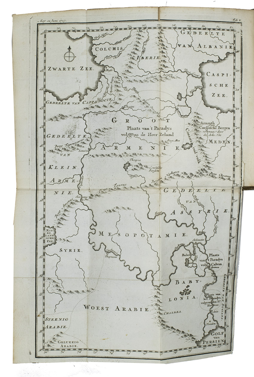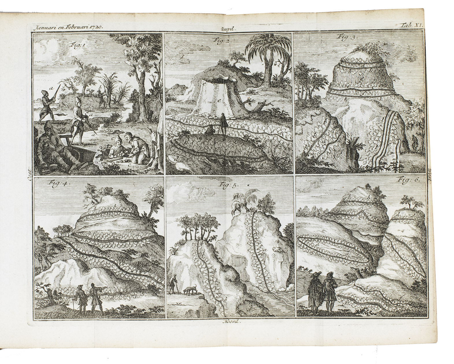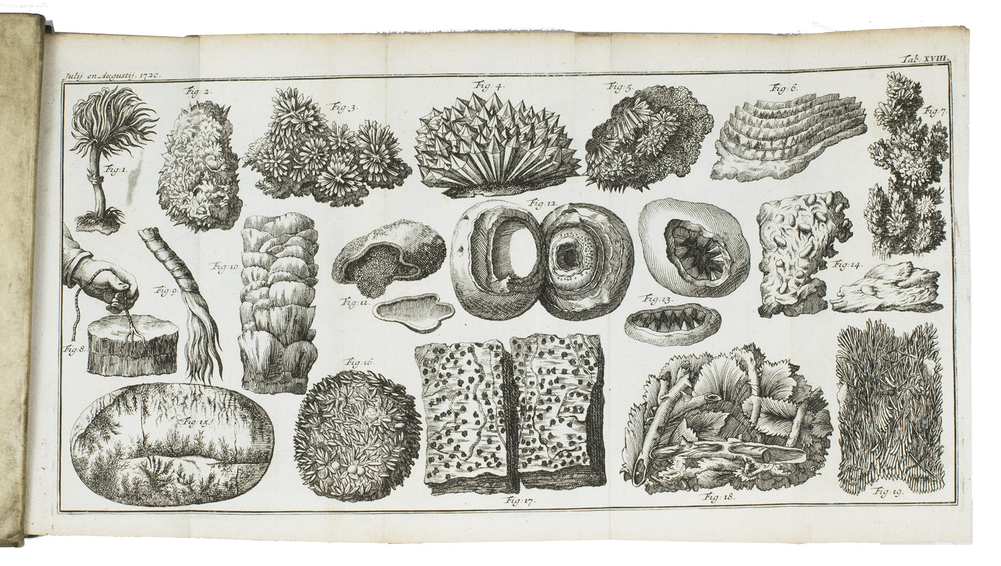 Several folding engraved plates illustrate all kinds of machines, crafts and natural history specimens. One folding plate depicts a workshop where gold wire is made (the only plate that is signed: Jan Wandelaar), multiple plates show mining technology. Other plates show sugar cane, several shells, plants and insects. A long part describes and illustrates the production of sugar. Some of the other subjects discussed include cacao, tea, quinine, indigo, astronomy, geology, amber, coral, minerals, horticulture and much more. The 4 folding maps show the Caucasus, the Baltic Sea, the Arabian Peninsula (including Bahrain) and the Holy Land.