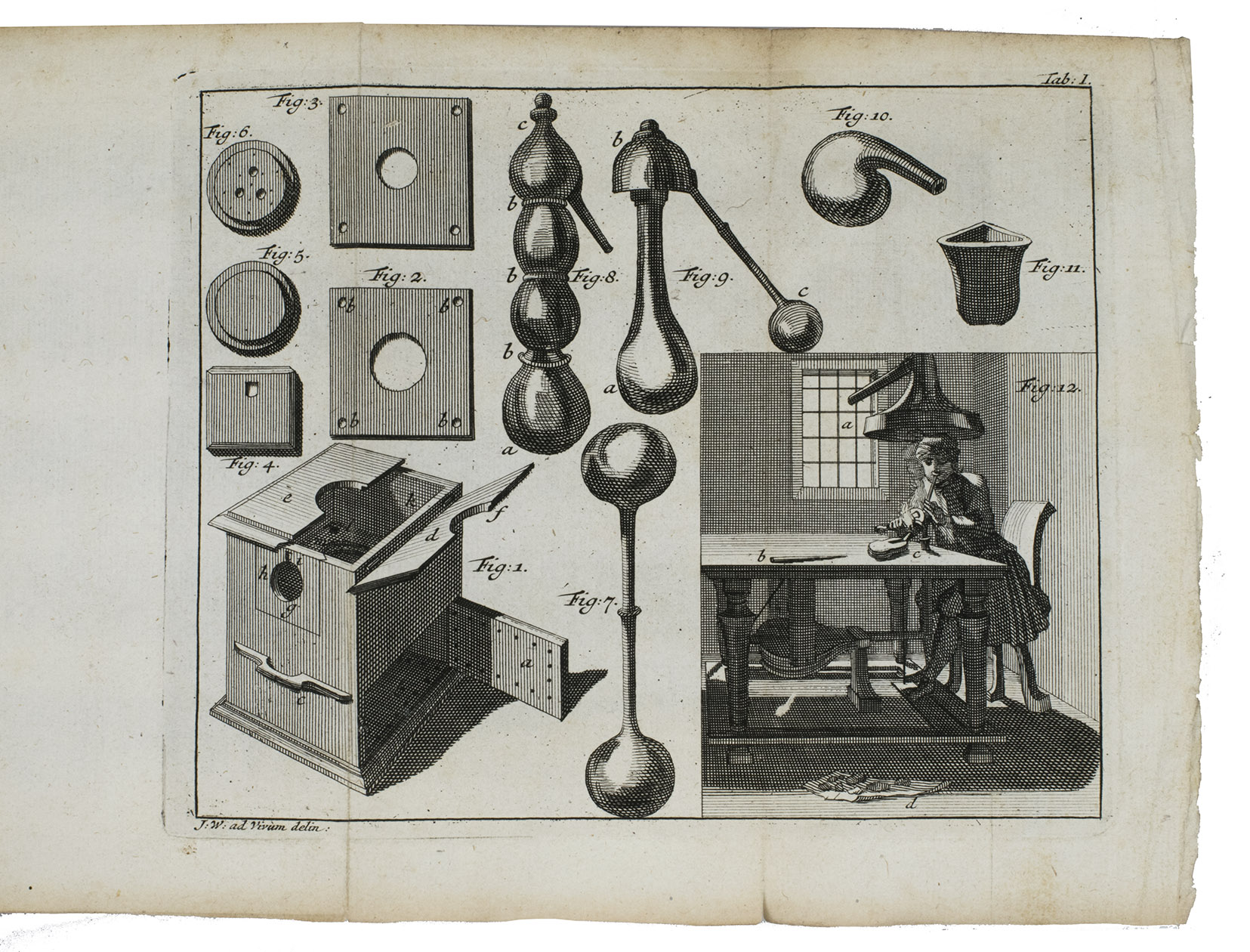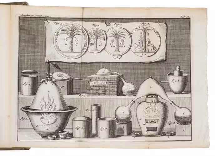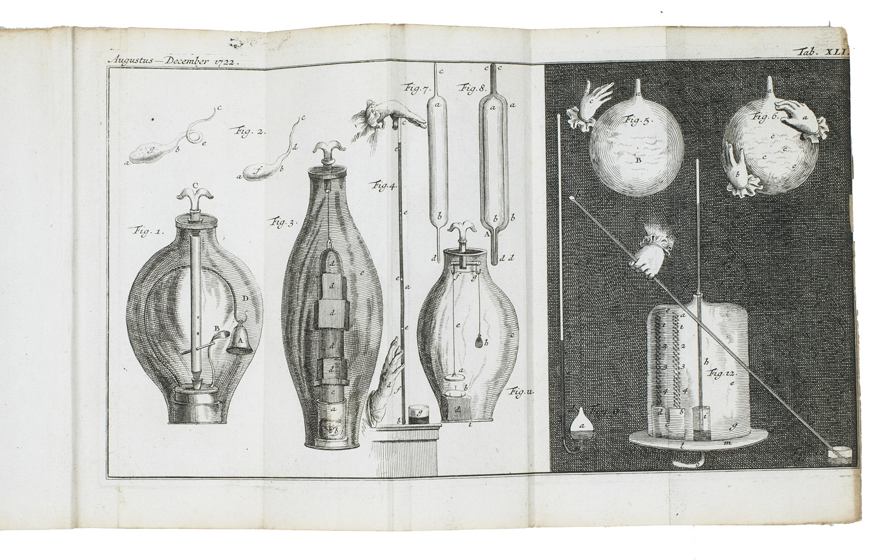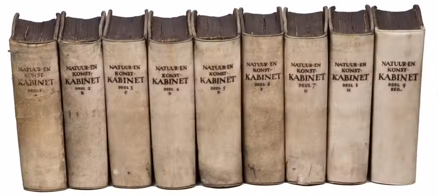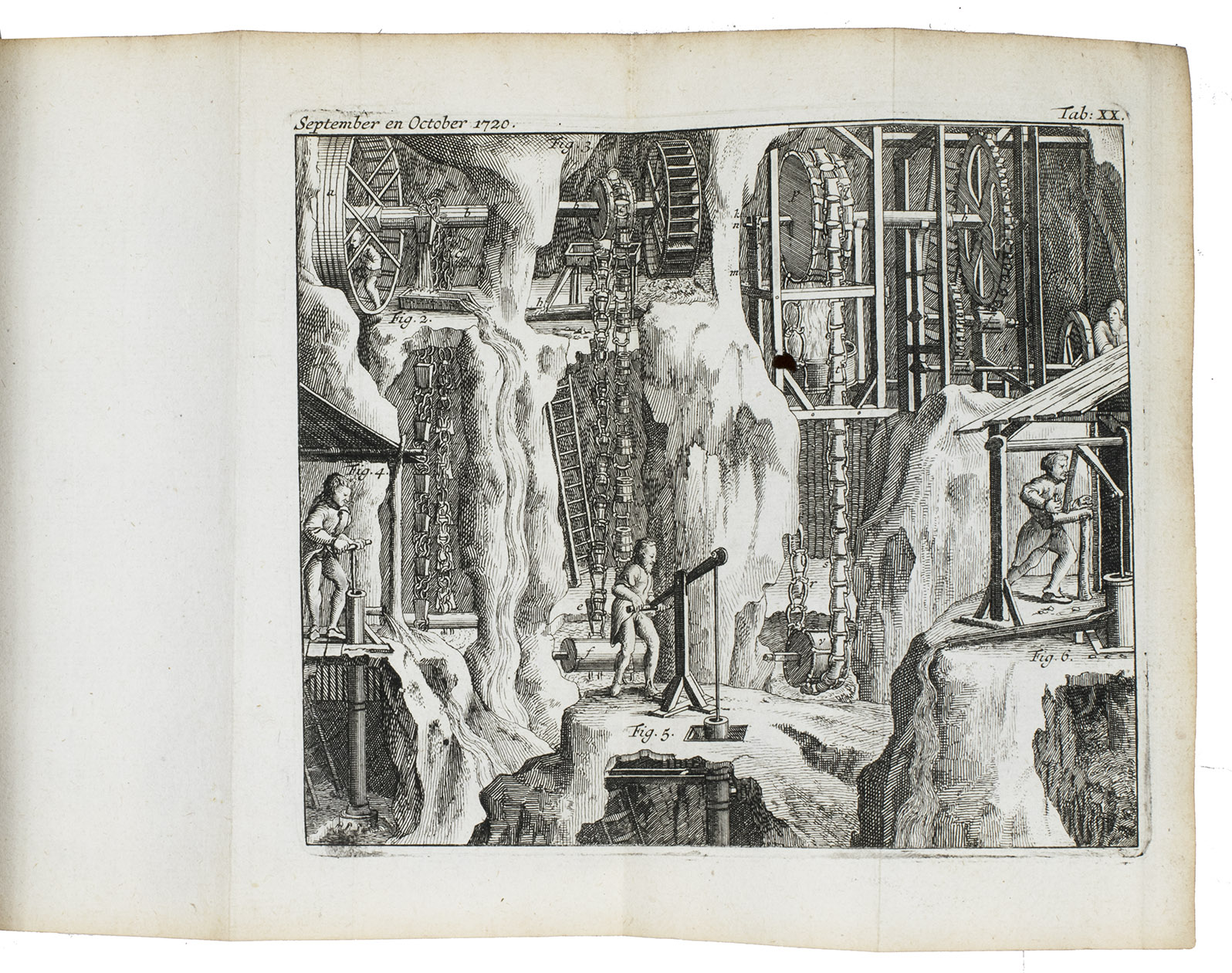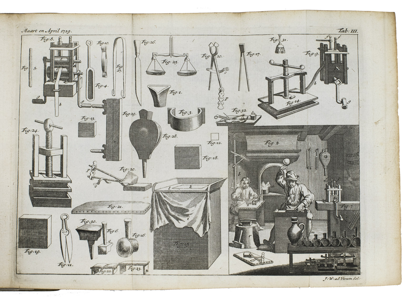 Complete set of a rare and interesting 9-volume scientific periodical devoted to the latest developments in all sciences, including their practical applications in the various crafts and professions. It appeared in bimonthly parts that were combined in 8 volumes and an index, totalling 21 parts. The Dutch physician Willem van Ranouw (1670-1723) initiated the project to make a selection of the most interesting and important recent foreign scientific texts available for Dutch craftsmen, who would benefit from the practical application of new scientific discoveries. Ranouw translated these texts himself and sometimes added some of his own writing.