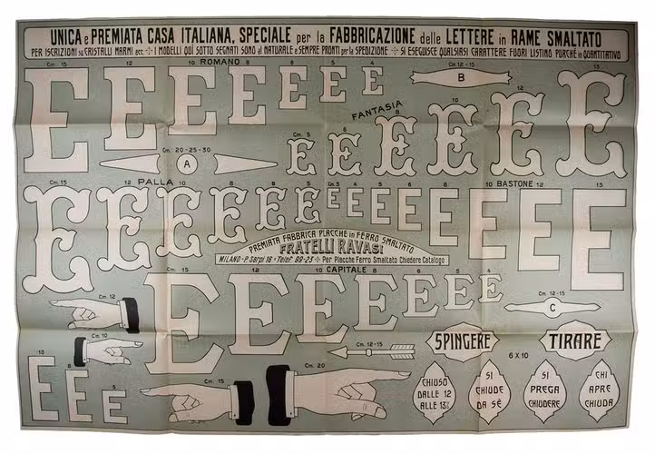 Of special interest is the very large poster showing in full size specimens of the capital E of 5 different styles, each in 6 to 8 sizes (labelled Romano [clarendon], Fantasia [tuscan], Palla [tuscan-like], Bastone [sans-serif, with 3 alternative forms] and Capitale [with roman and clarendon characteristics], 3 to 15 cm), as well as pointing hands, panels and other decorations. The catalogue itself illustrates the signboards, plates, etc., ranging from simple house numbers to a crowned and mantled Milan coat of arms with a chain border.
