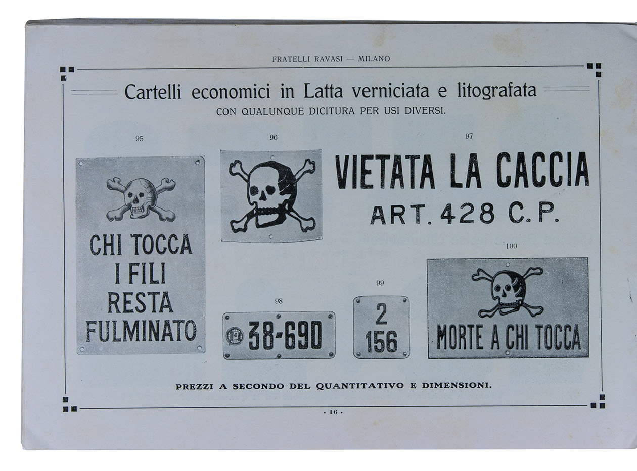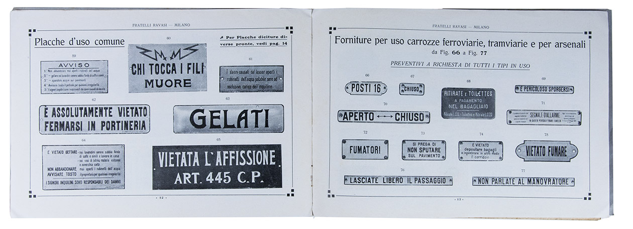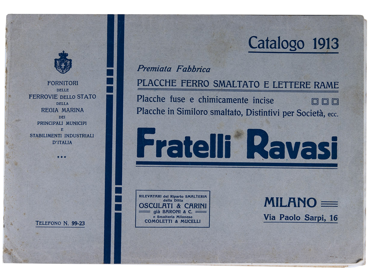 Extremely rare illustrated catalogue of enameled metal signboards, plates and large copper letters intended for signs, name and number plates, a clock fave, etc. The catalogue was issued by the brothers Luigi and Giovanni Ravasi, described on the wrapper-title as the suppliers of the Italian State Railways and the Royal Navy. They offer enameled plates, etc. on iron, zink and copper. No other copies of the present catalogue, nor copies of other catalogues of the firm could be located or found recorded in the literature.