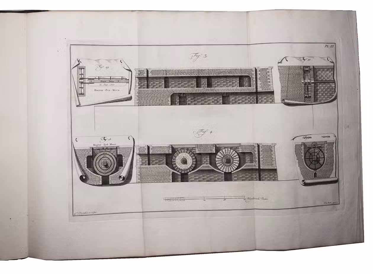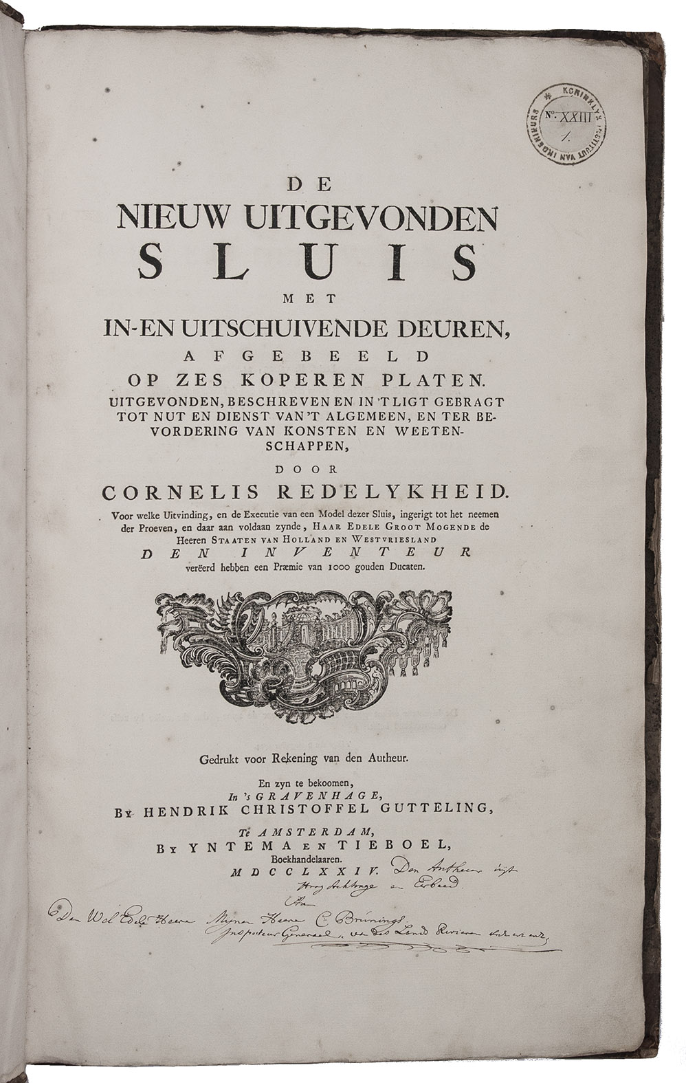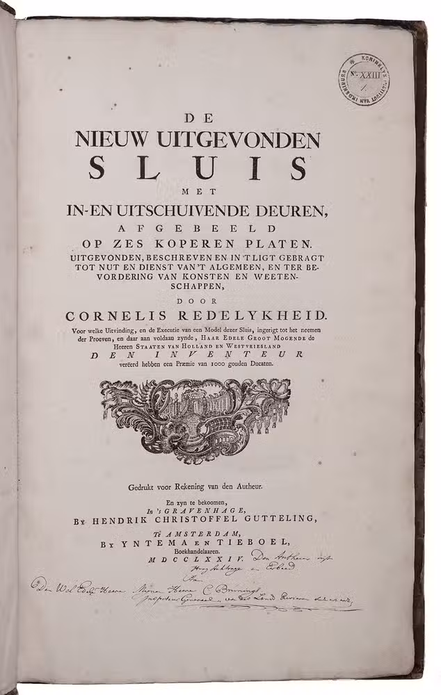 Redelykheid was already working on his sluice with sliding gates in 1772 and a model was built, one fourth its intended size. The model was inspected and tested by the hydraulic engineer Christiaan Brunings (1736-1805), then inspector general of rivers & waterways, who later founded the Dutch water management department now known as "Rijkswaterstaat". Brunings wrote an extensive and positive rapport on the sluice, which led Redelykheid to be awarded with 1,000 gold ducats by the States of Holland. The award enabled the inventor to publish the present two works at his own expense, both including a preface by Brunings. As a grateful gesture Redelykheid presented the present copy to Brunings, with an inscription on each of the two title pages.