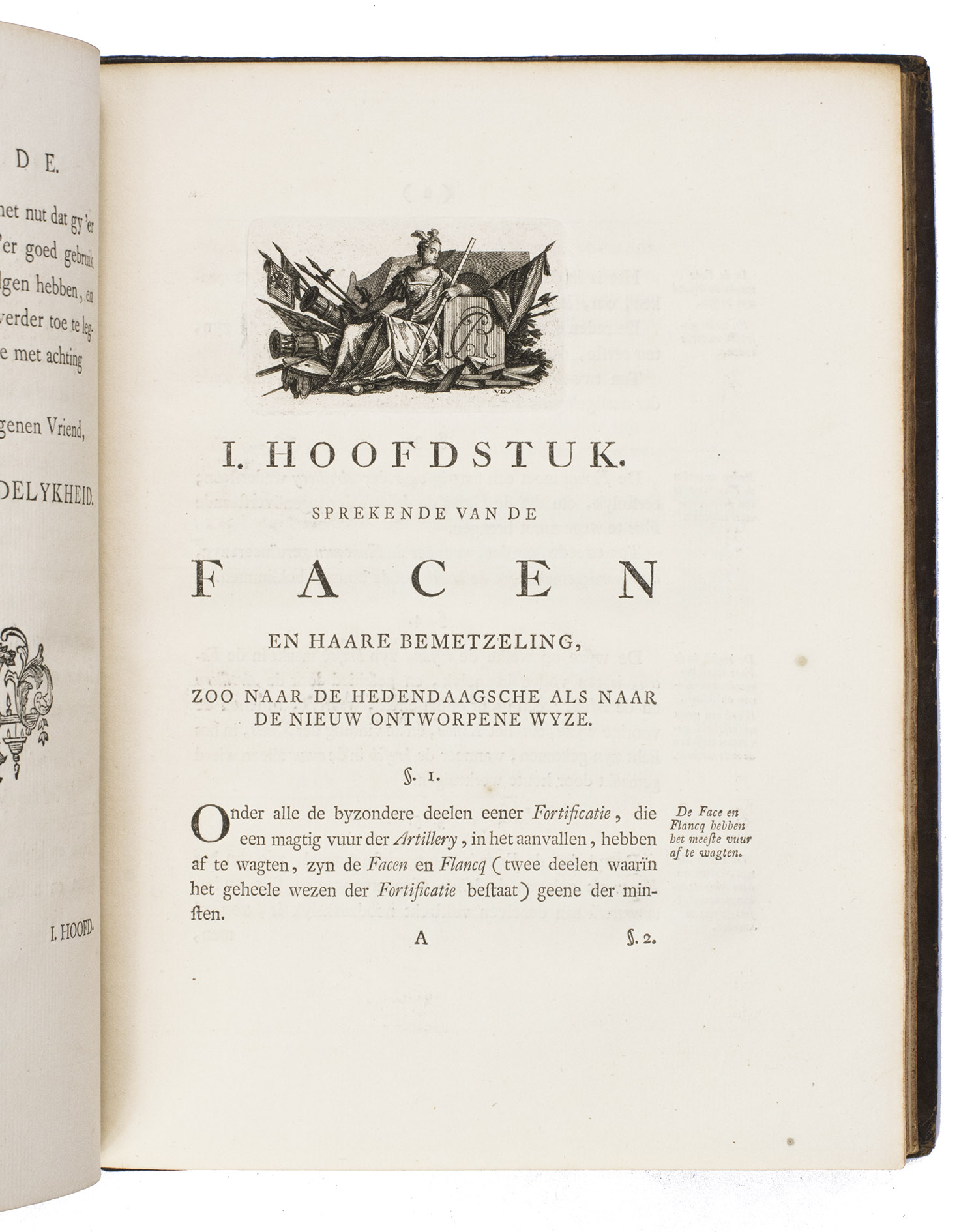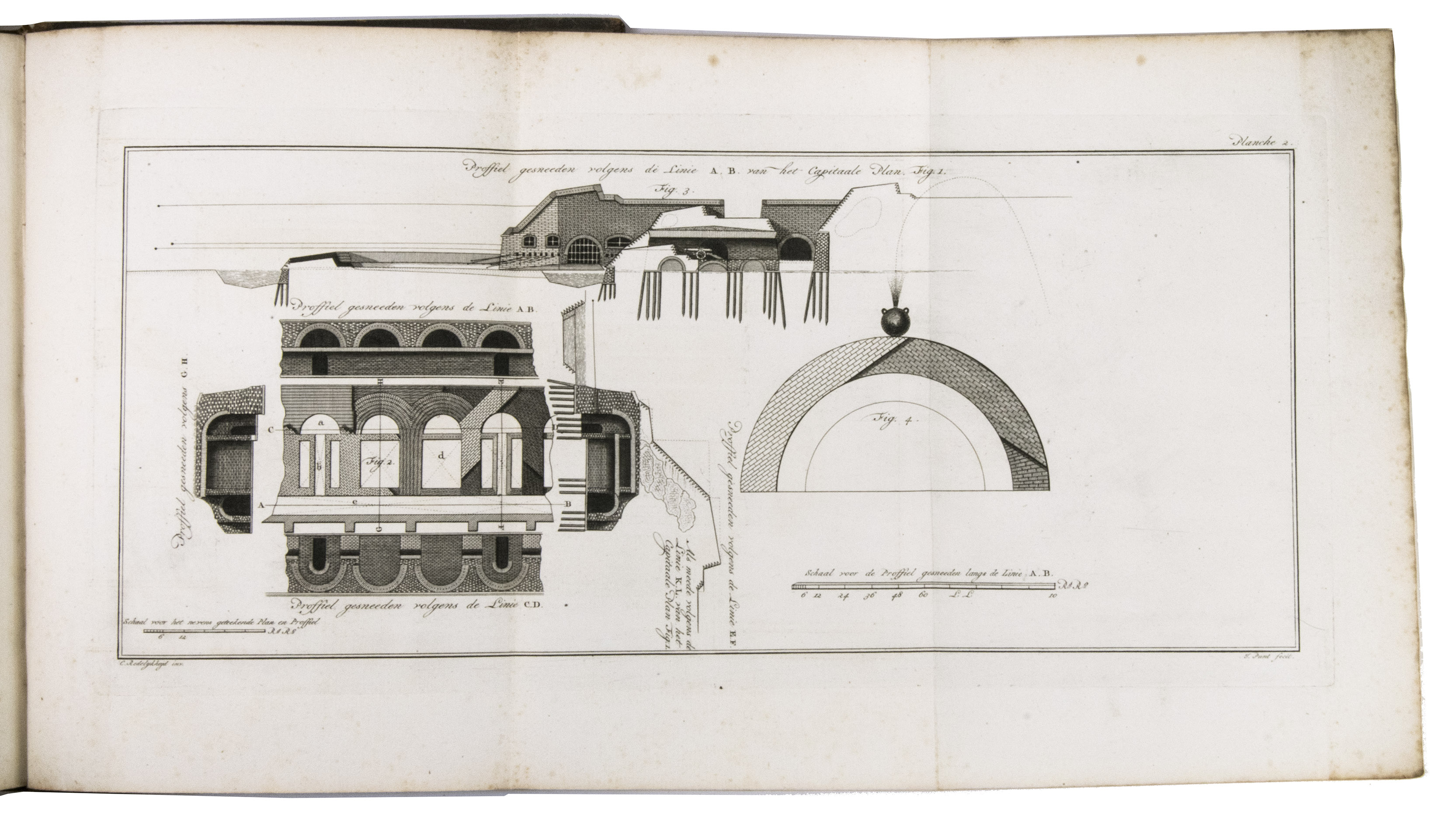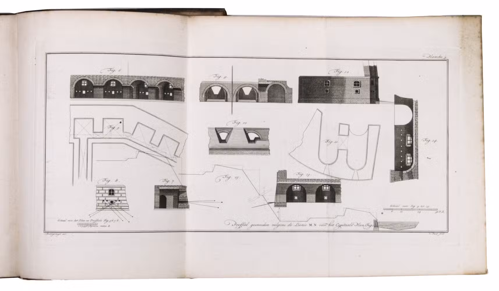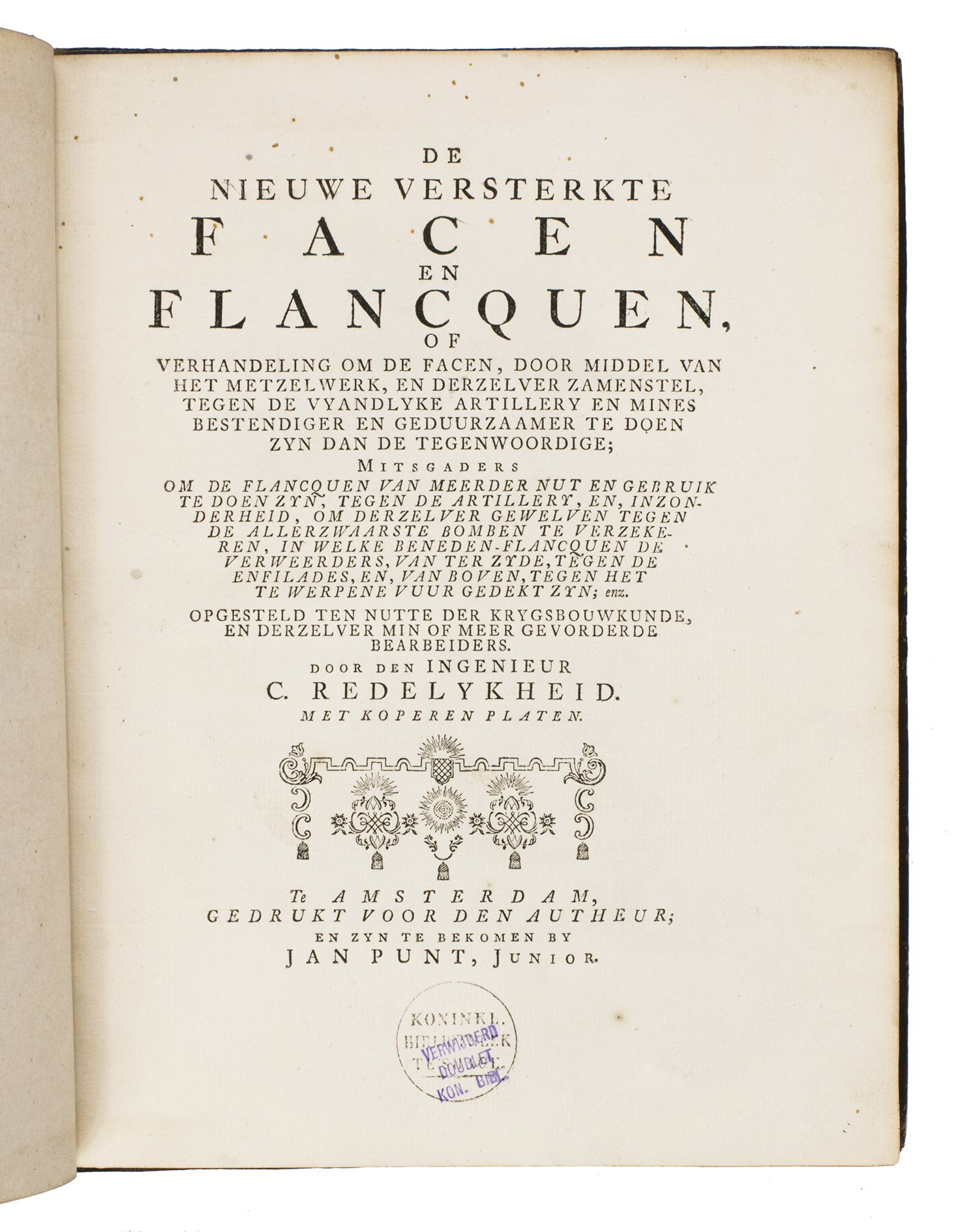 Rare first and only edition, luxuriously executed and printed for the author, of a treatise on fortification by the Dutch engineer Cornelis Redelykheid (1728-1787). It centres on methods to improve the masonry and composition of strongholds against hostile artillery and mines, and on fortifying vaults against the most powerful bombs. The large engraved plates with measured drawings include a large fortification plan and several cross-sections, profiles and elevations, many showing vaults. Although the imprint is undated, the author's dedication is dated from Amsterdam, 1759. The present book seems not to have been a normal commercial production but a private publication of the author, probably printed in a small number of copies.