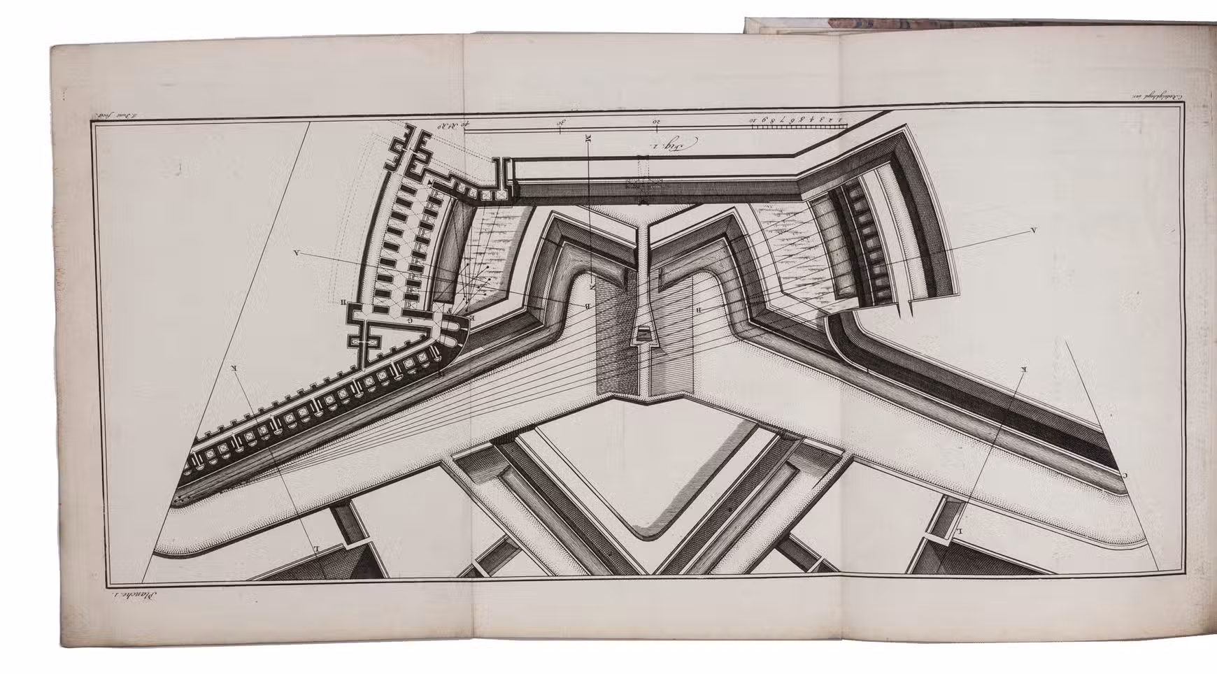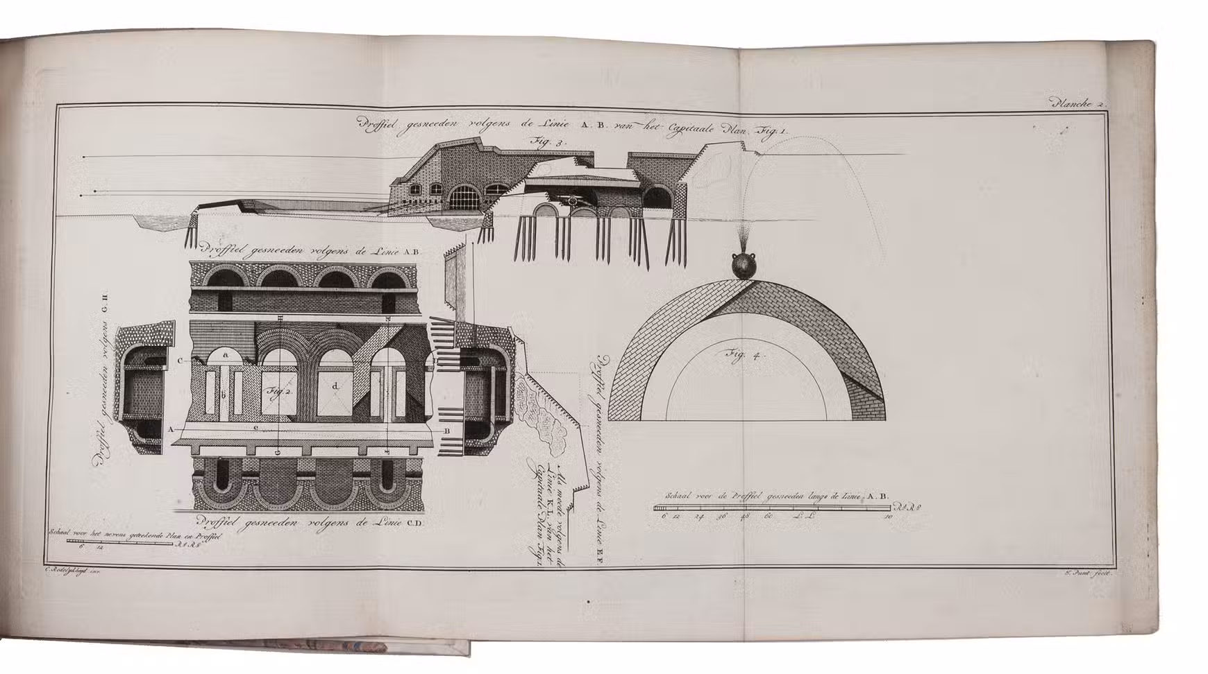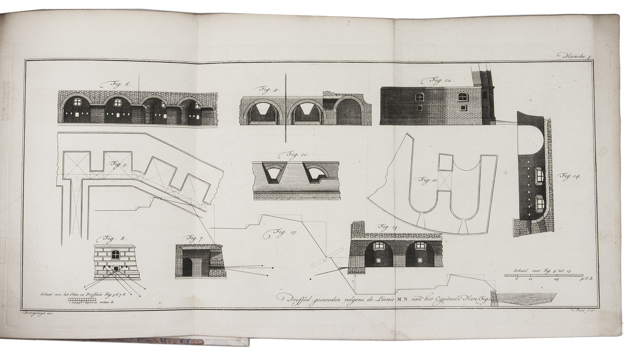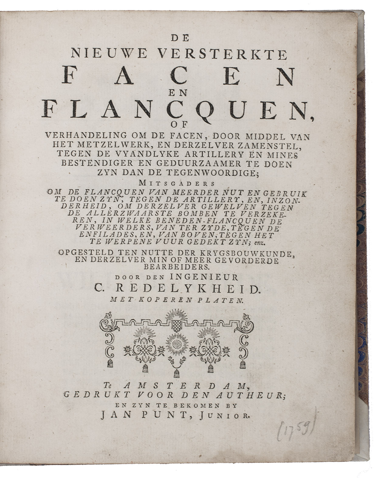 Rare first and only edition of a treatise on fortification by the Dutch engineer Cornelis Redelykheid (1728-1787). It centres on methods to improve the masonry and composition of strongholds against hostile artillery and mines, and on fortifying vaults against the most powerful bombs. The large engraved plates with measured drawings include a large fortification plan and several cross-sections, profiles and elevations, many showing vaults. Although the imprint is undated, the author's dedication is dated from Amsterdam, 1759. Cornelis Redelykheid (1728-post 1787), son of a Rotterdam mason, worked in his father's shop as a young man. He became a capable hydraulic, mechanical and fortification engineer, working for the province of Holland from 1761. The present book seems not to have been a normal commercial production but a private publication of the author, probably printed in a small number of copies.