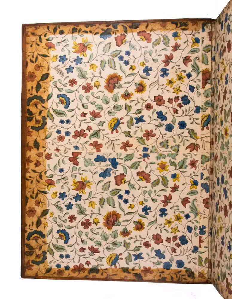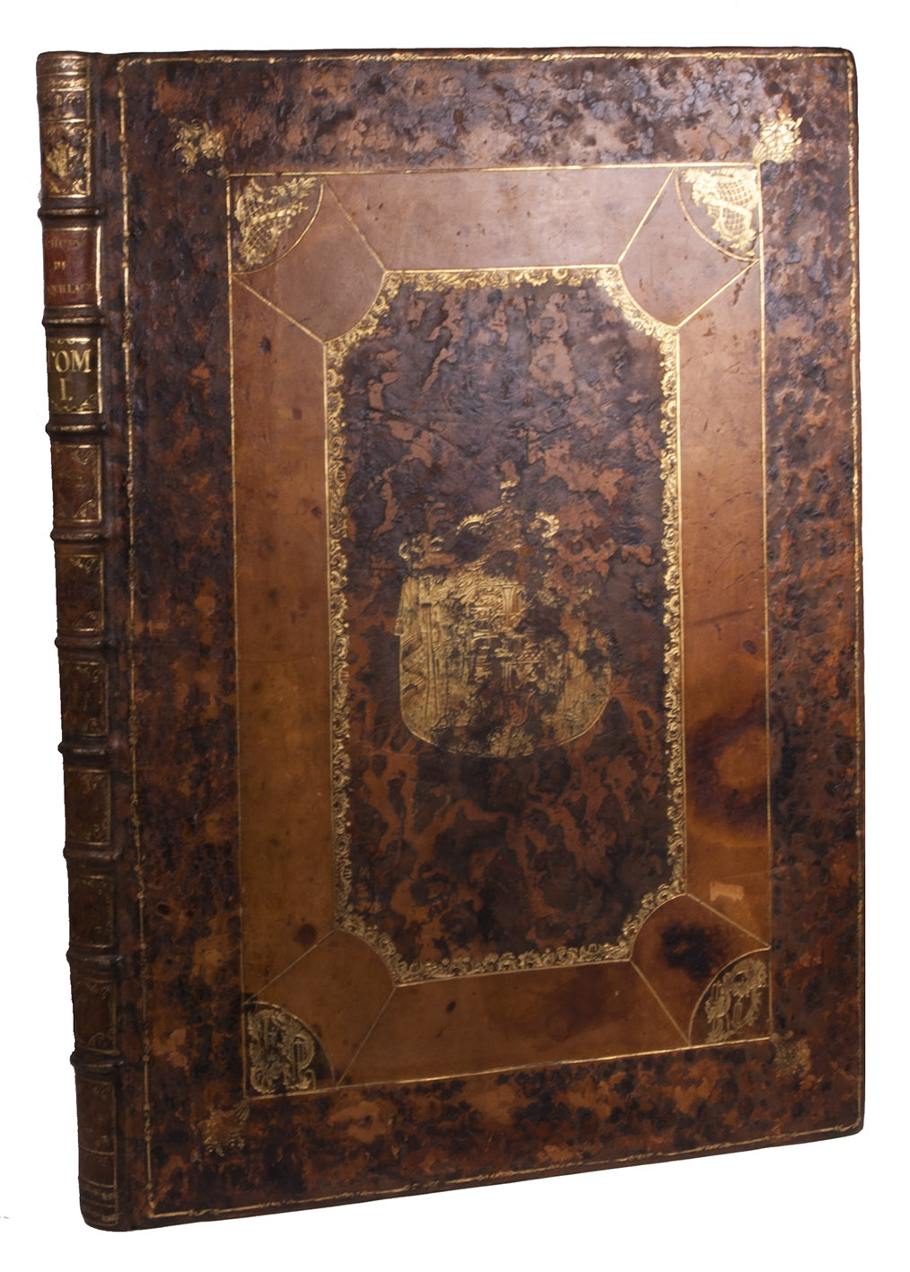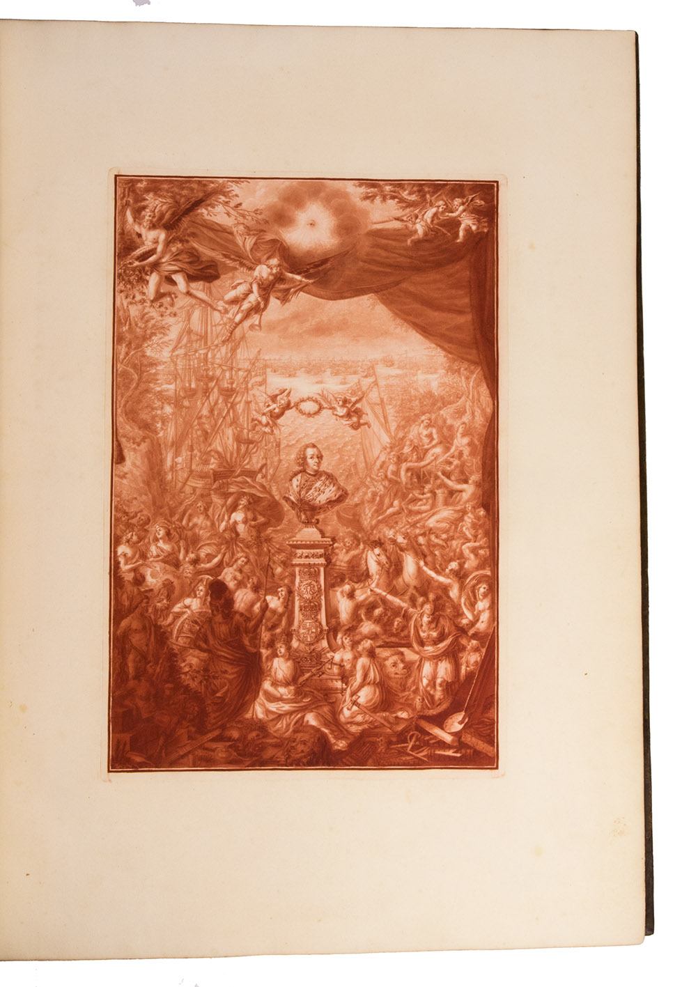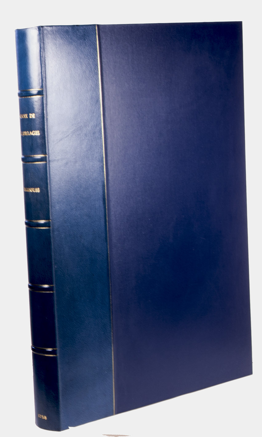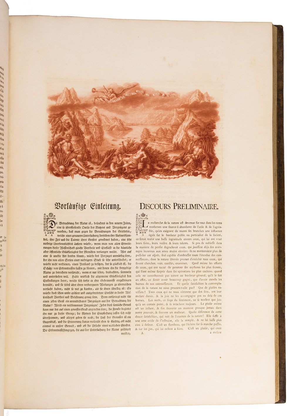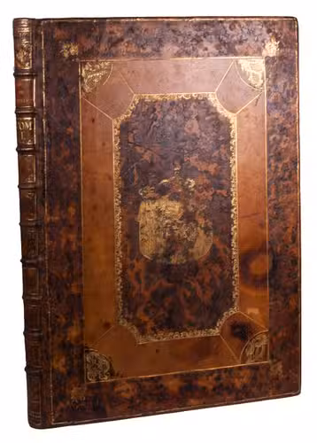 The frontispiece and the two vignettes are printed in red, showing that this copy was intended for presentation (the ordinary copies have these engravings in blue). King Frederik V of Denmark had these presentation copies bound with his arms on the boards and spine around the time of publication. Although intended for presentation by King Frederik V ca. 1758, the present copy appears to have remained with the royal family for fifty years until Frederik VI, who bore the same arms, presented it to the Empress Joséphine. The back of each title-page bears the "Huzard de l'Institut" stamp of the Paris book collector, professor of veterinary medicine and member of the Institut de France, Jean-Baptiste Huzard (1755-1838), who tells its earlier history in a note tipped onto an end leaf.
