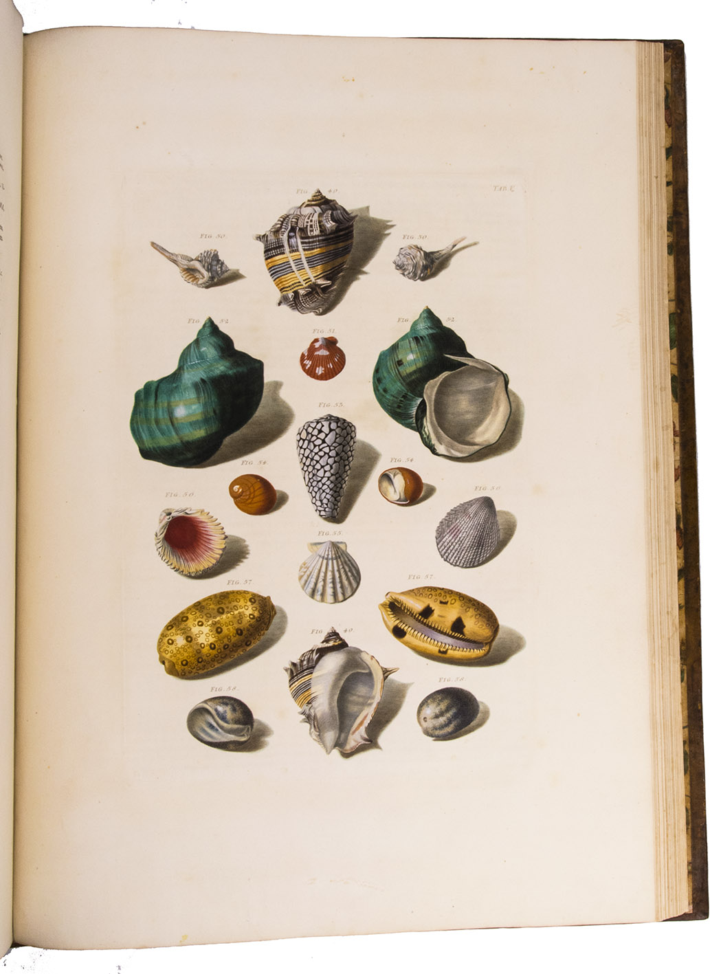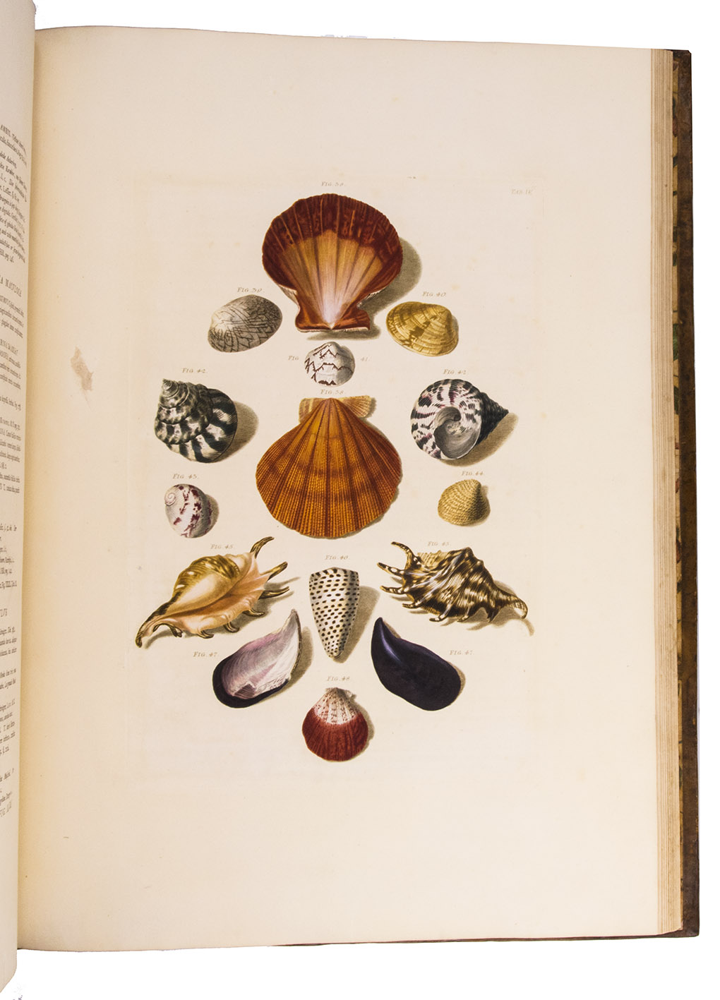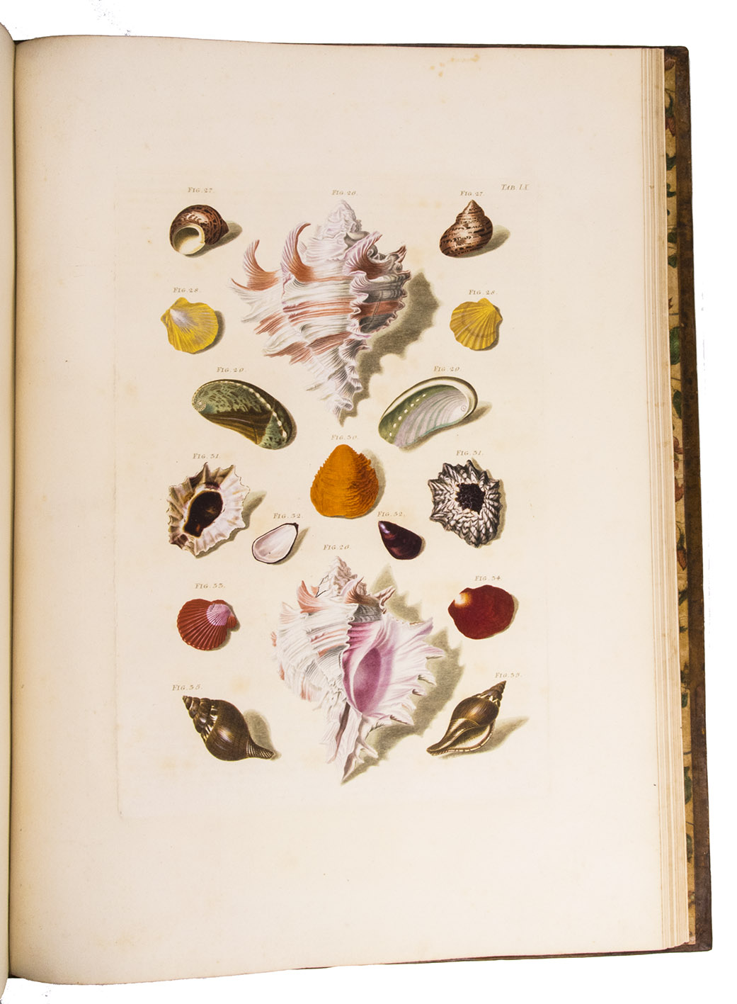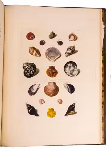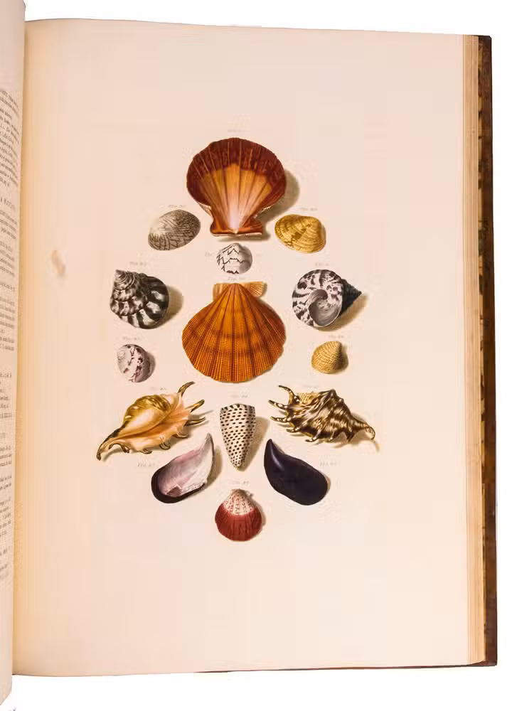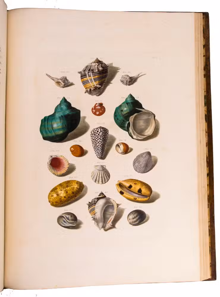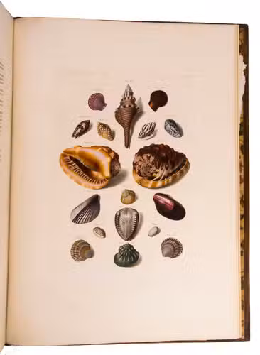 Magnificent and luxurious shell book with 12 enormous plates showing about 205 finely engraved and beautifully and subtly hand-coloured images of 145 shells of snails, mussels and other shellfish (gastropods and bivalves) painted and engraved by Franz Michael Regenfuss from originals in a large number of royal, private and public collections. Regenfuss's wife Margaretha Helena Ludwig executed most of the colouring, with some figures by Gabriel Müller and Johan Maurits Leyh. It too is executed beautifully and accurately. The book is especially rich in Asian shells ("most" according to Van Benthem Jutting) but also includes West Indian, South African and European examples. They are nearly all marine species, but there is at least one land snail. Van Benthem Jutting notes that the book "appears but very seldom in booksellers' catalogues".