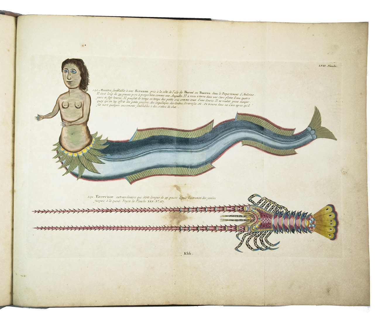 Renard's famous but rare work, noted for the spectacular imagery of colourful but also bizarre tropical fishes, crabs and lobsters from the Indo-Pacific, being the first colour-plated fish book, here in its rare second edition. The book contains 100 plates with 460 originally and extraordinary hand-coloured copper engravings, divided over two volumes with their own half-title ('Histoire naturelle des plus rare curiositez de la mer des Indes'), of 415 fishes, 41 crustaceans, two stick insects, a dugong and even a mermaid, all living in the Indian Ocean between the East Indies. Sometimes the descriptions specifically refer to fishes of some islands in the East Indies, as Ambon, the Moluccas or Buton, but they also contain references to the "fishes of the Antilles, Brazil" (Sabin) and Mauritius. The illustrations in the first volume seems to be quite realistic, in contrast to those in the second volume, which are sometimes quite surreal, which is even more emphasized by the short anecdotical and highly entertaining descriptions.