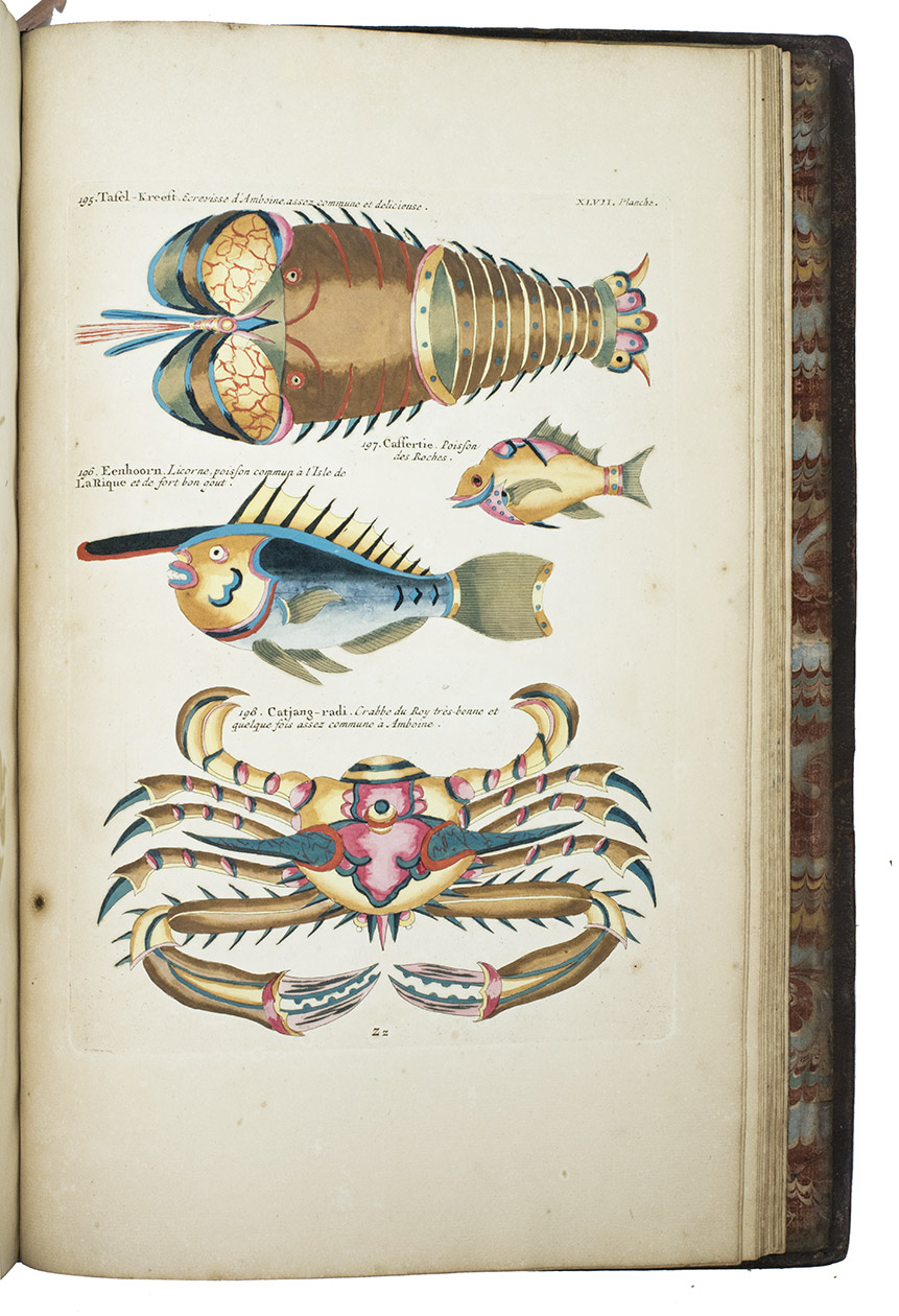 Amsterdam, Reinier & Josua Ottens, 1754. 2 volumes bound as 1. Folio. Title-page in red and black, a divisional-title for each volume and 100 engraved plates, vividly hand-coloured as published, showing 460 fishes and other marine animals. Contemporary calf, richly-gold tooled spine and bords, green morocco spine label with title in gold, decorated edges, marbled endpapers. Preserved in a professionally made black cloth box. [7] ll., 43 plates; [1] leaf, LVII plates, [4] ll.