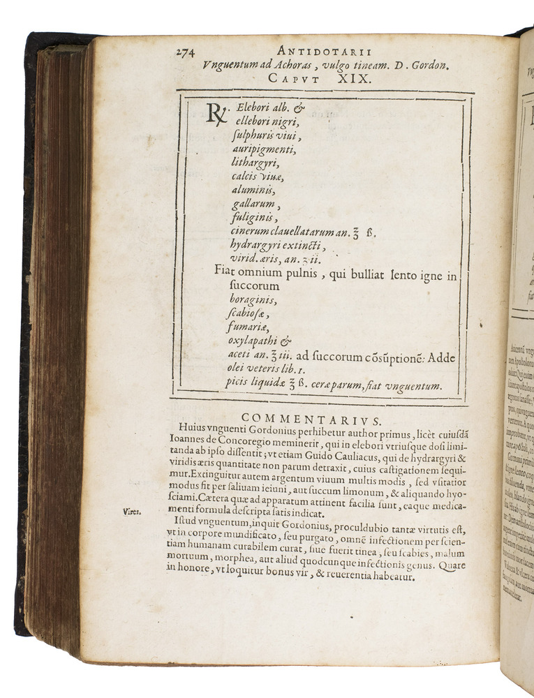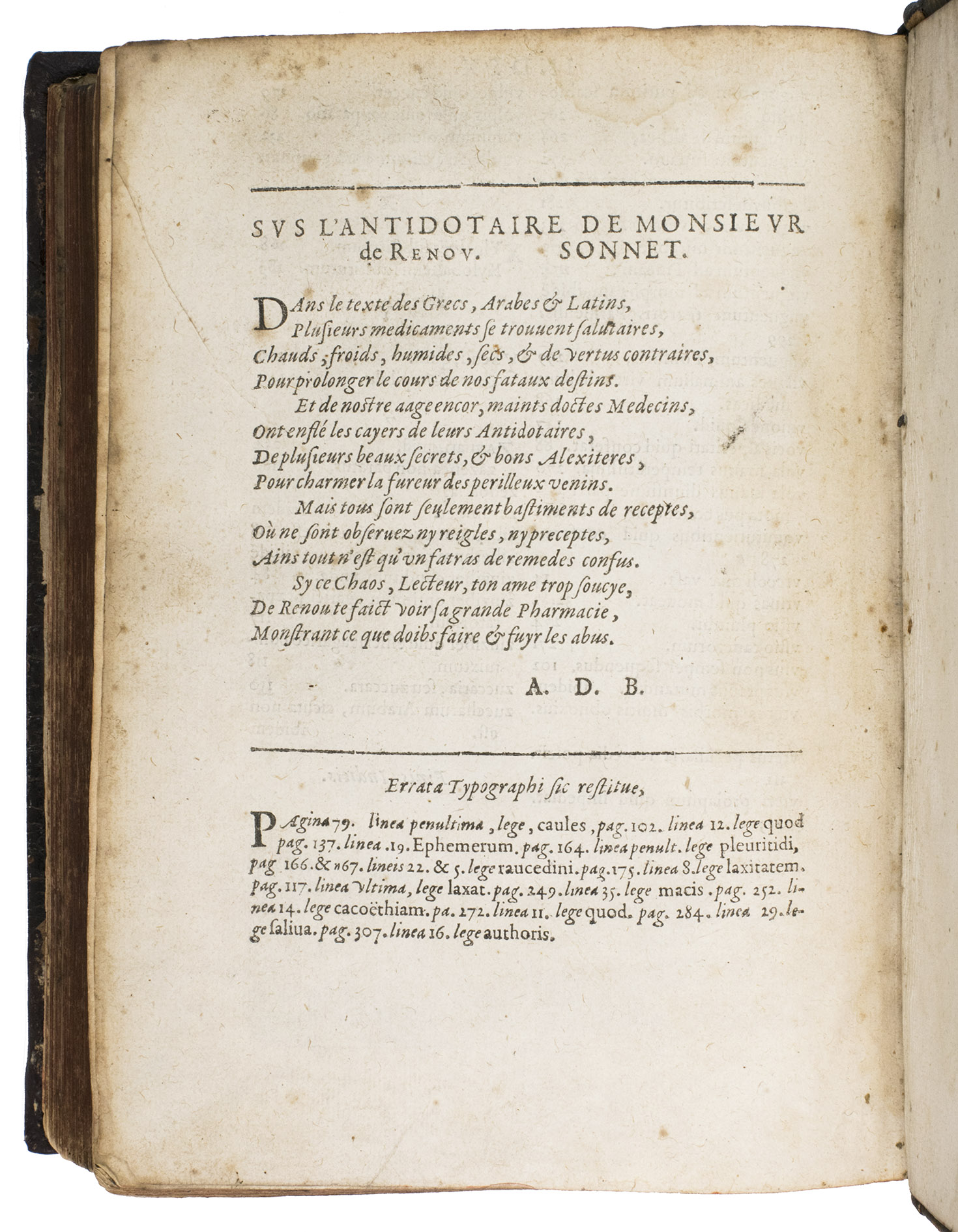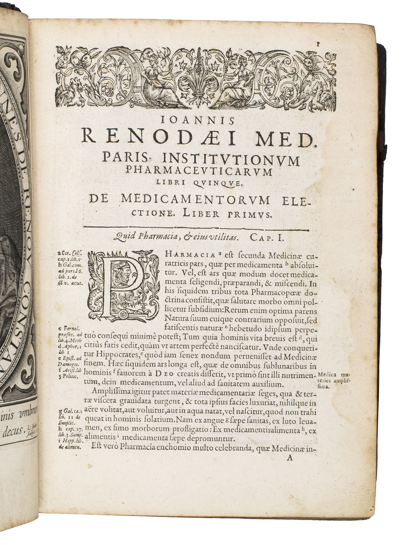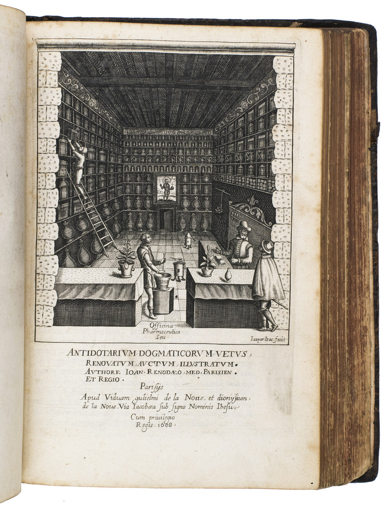 First edition of a comprehensive and influential medical work, written by the Parisian physician Jean de Renou (1568-1620). "Of particular influence on the practice of French pharmacy were the writings of Jean de Renou (1608), providing a formulary, a textbook, and a guide to the preservation of drugs, the use of pharmaceutical equipment and to the rules of professional ethics" (Sonnedecker). The work is divided into two parts, each with its own engraved part-title. The first part starts with some general chapters on the principles of pharmacology and what a proper apothecary is like. Several chapters follow on different types of medicines, their characteristics, how to compound them and when to prescribe them. Three large chapters cover the different ingredients and their medicinal powers, distinguishing between plants, minerals and parts of animals. Whereas the first part is more introductory and informative, the second part is more like a pharmacopoeia. It gives many recipes for medicines, with comments on the diseases or ailments they're supposed to cure.
