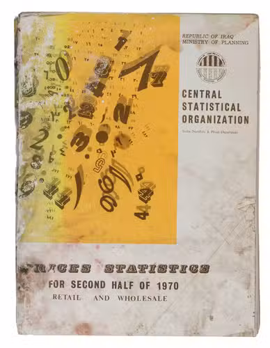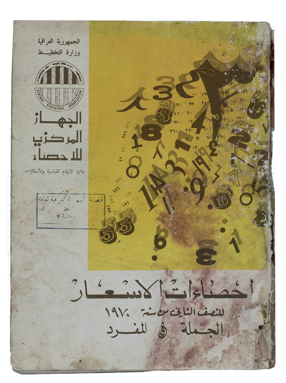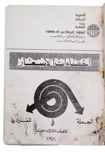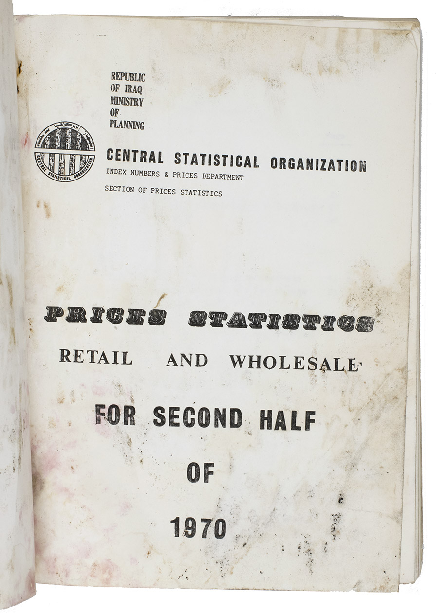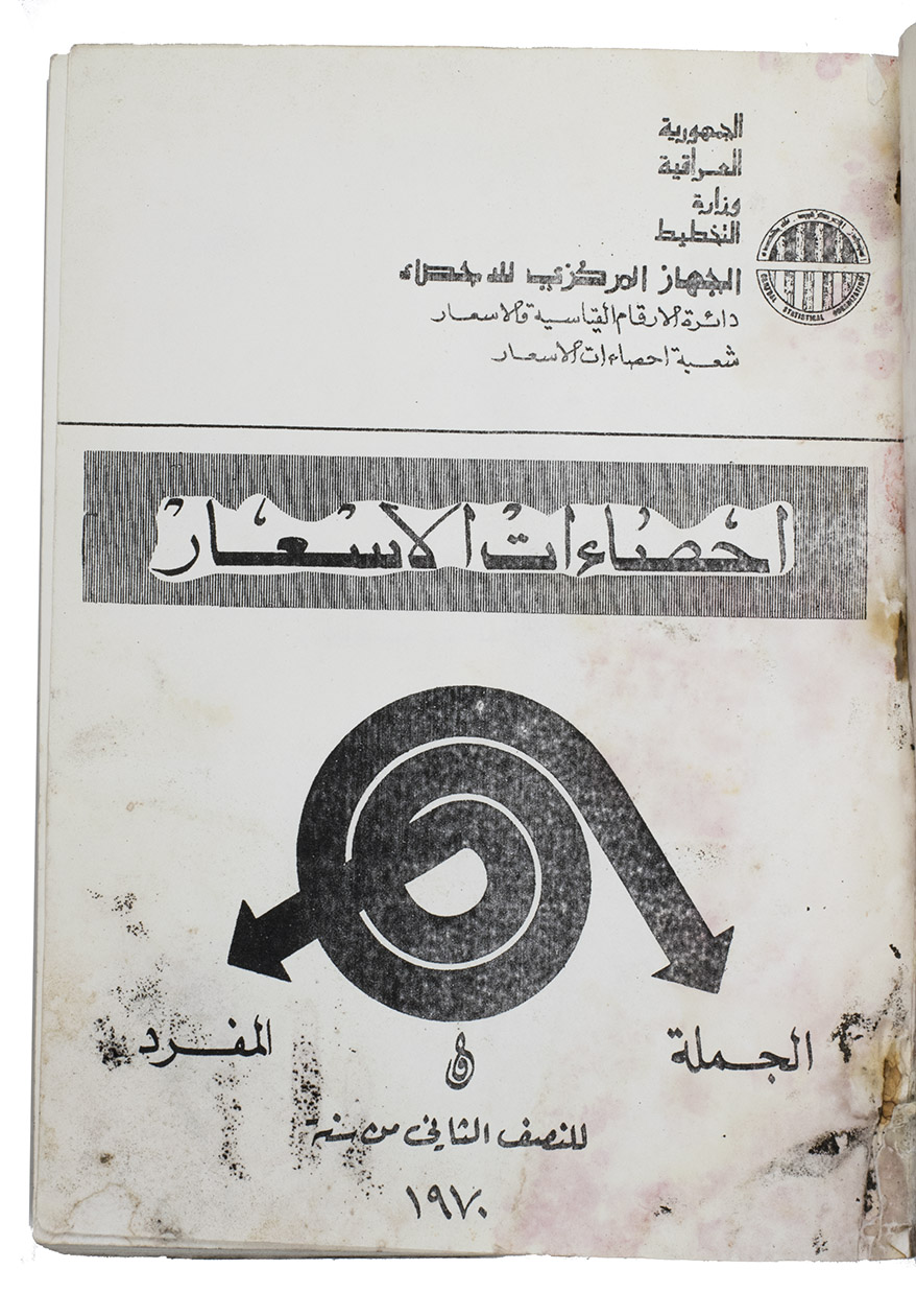 Iraq, Central Statistical Organization, [1970?]. Folio (28.5 x 21 cm). With multiple graphs on 8 leaves, most of them in the text. The main price-information is arranged in tables, all tables and other introductory information are printed on 1 side of the leaves (from right to left on the recto side of the leaves, excluding the information in English which has from that perspective been printed on the verso side of the leaves). Original printed publisher's wrappers. (The majority of the work reads from right to left, thus:) [5], 83, VI-I, [4] ll.