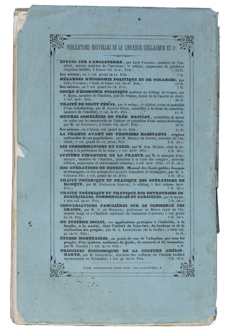 Paris, Guillaumin et Cie (back of half-title: Henri Plon), 1856. 8vo. Original publisher's light blue printed paper wrappers. [4], 244, 4 pp.