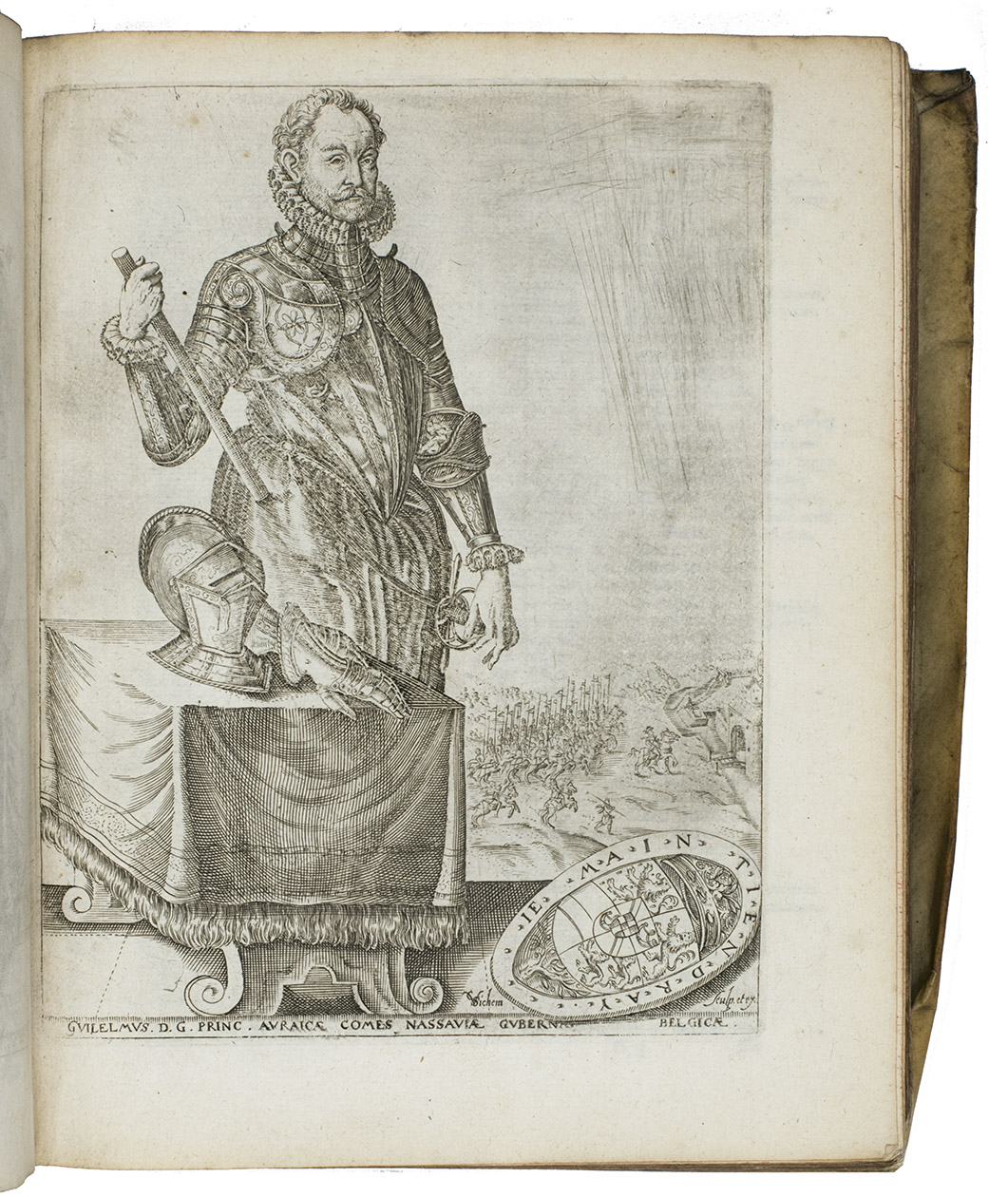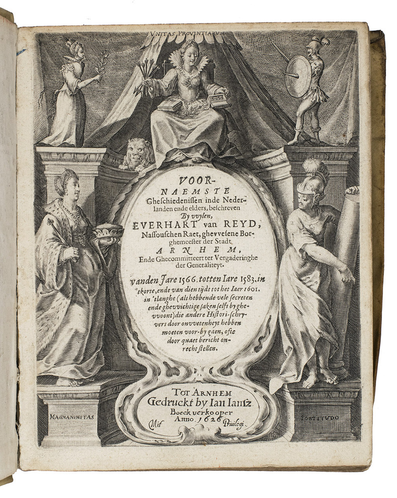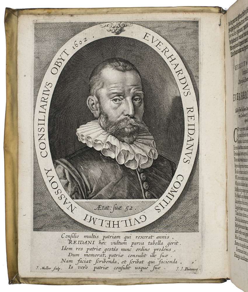 Extensive historical treatise on the first years of the Eighty Years War between Spain and the Low Countries by Everhart van Reyd, with beautifully engraved portraits of important historical figures like Philip II, king of Spain, Ferdinand Alvarez, duke of Alva, William, prince of Orange, and Maurice, prince of Orange. Some of the portraits were also used in E. van Meteren's Niederländische Historien (Antwerp, 1611), and also in the Dutch editions of the same work (Amst., 1647, 1652, 1663). The first portrait, by J. Muller, with a Latin verse of J.J. Pontanus underneath, shows the author at the age of 52.