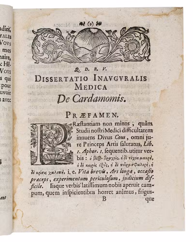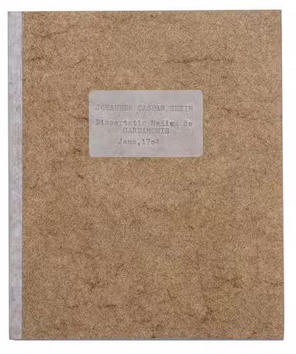 Rare first and only edition of a Latin doctoral dissertation for the University of Jena on the medical use of cardamom (Elettaria cardamomum). The author (Rhein working under his professor Krause) describes the countries of origin, horticultural care of the plant, harvest and the medical procedures to turn cardamom into a pharmaceutical remedy in the Middle East, the Arabian peninsula and India. It identifies first and foremost the neurological uses of cardamom, and presents a number of recipes and methods involving cardamom in the treatment of epilepsy and memory loss. It also elaborates on the possibility to use the plant to treat paralysis. It further stipulates that the herb has a positive effect on guttural functions and the digestive system in case of constipation and flatulence. The specific smell of cardamom, it concludes, can have an aphrodisiac effect on patients as well.