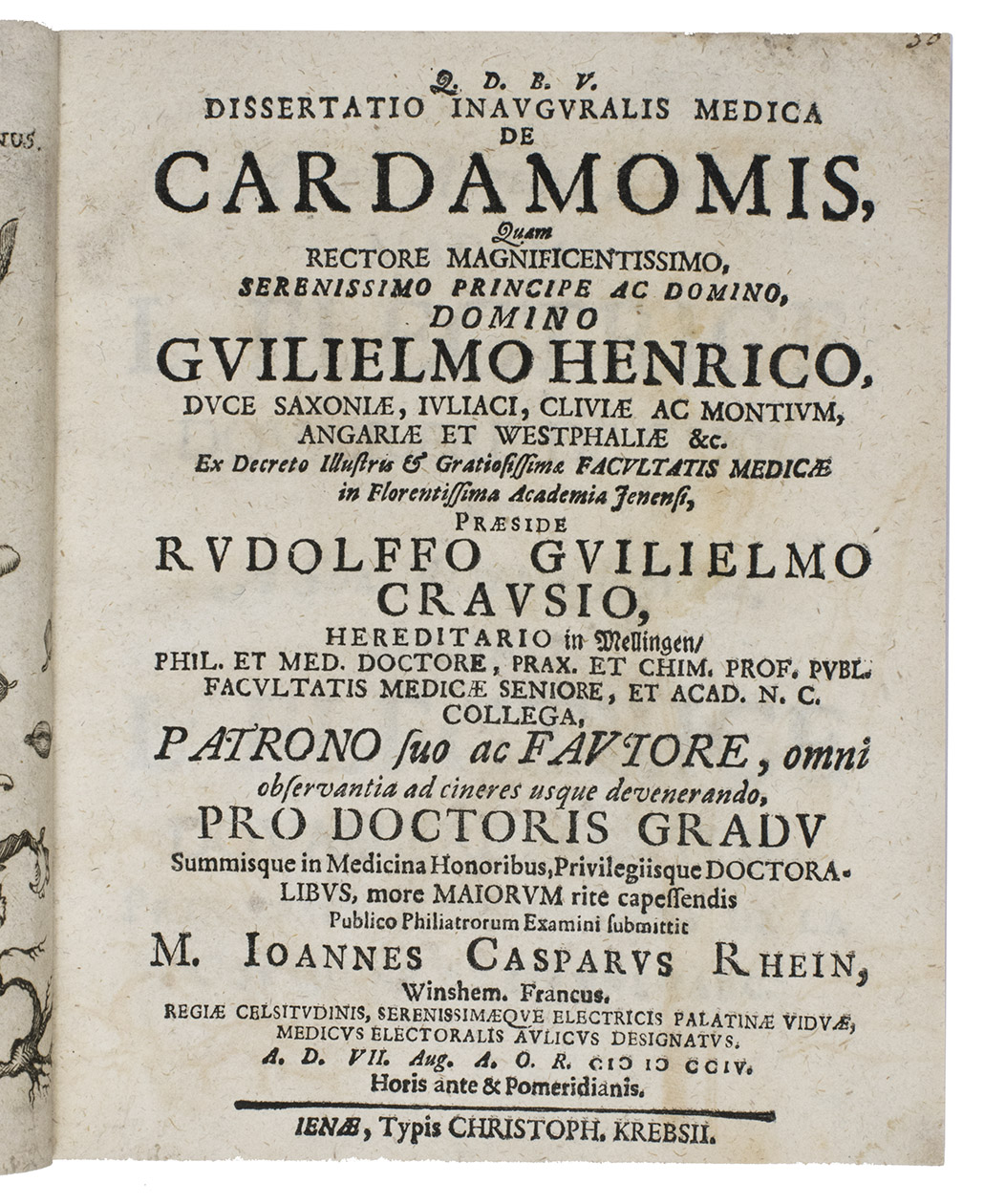Q. D. B. V. dissertation inauguralis medica De cardamomis, quam rectore magnificentissimo, serenissimo principe ac domino, domino Gvilielmo Henrico, dvce saxoniae, ivliaci, cliviae ac montivm, angariae et westphaliae &c. Ex decreto illustres & gratiotissima facvltatis medicae in florentissima academia jenensi, Praeside Rvdolfo Gvilielmo Cravsio.