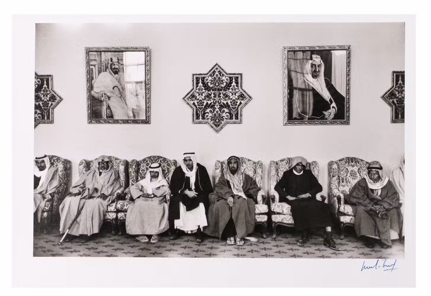 Beautifully captured image by Marc Riboud (1923-2016), an important and well-known French photographer. The photo shows a group of men waiting for their audience with King Faisal bin Abdulaziz Al Saud (1906-1975) at the royal palace in Riyadh. Hanging above them are the portraits of King Faisal and his father, King Abdulaziz al Saud (1876-1953), the founder of Saudi Arabia. The work is signed by Riboud.