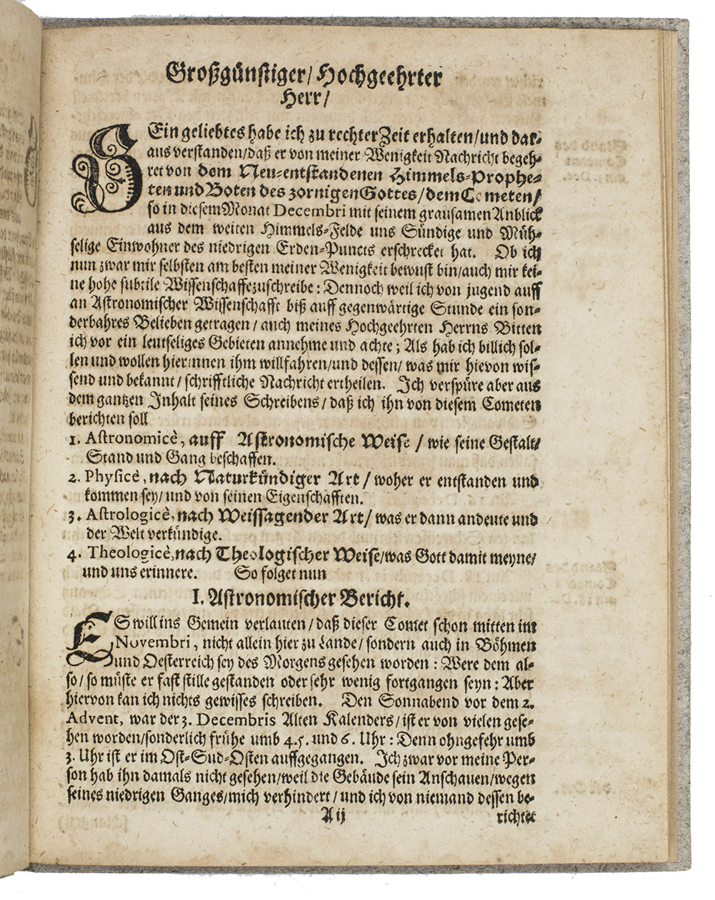 Leipzig, Ritzsch, 1665. 4to. With a woodcut illustration of a comet on the title-page. Modern grey boards. [12] ll.