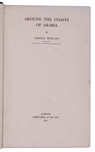 First edition, British issue, of a travelogue by the distinguished Lebanese Arab-American writer Ameen Rihani (1876-1940). This work is part of a trilogy: Around the Coasts of Arabia (1930), Arabian Peak and Desert: Travels in Al-Yaman (1930) and Ibn Sa'oud of Arabia: his people and his land (1928). Divided into 5 parts, in Around the Coasts of Arabia Rihani describes his time with King Husein in the Hijaz, the Idrisi in Asir, Aal Sabah, the sheiks of Kuwait, Aal Kalifah, the sheiks of Bahrein, and Aden and the protectorates. It is one of the most important sources for the historical background of the Idrisid Emirate of Asir.