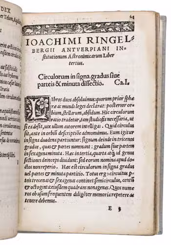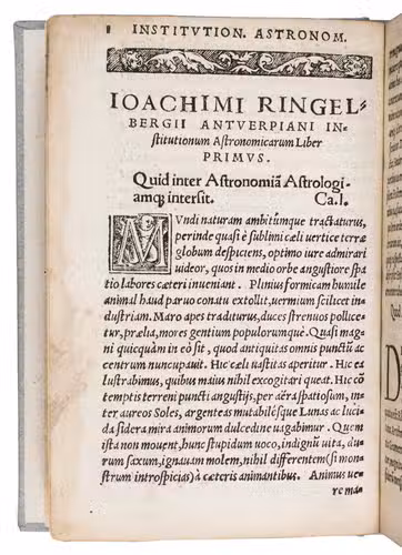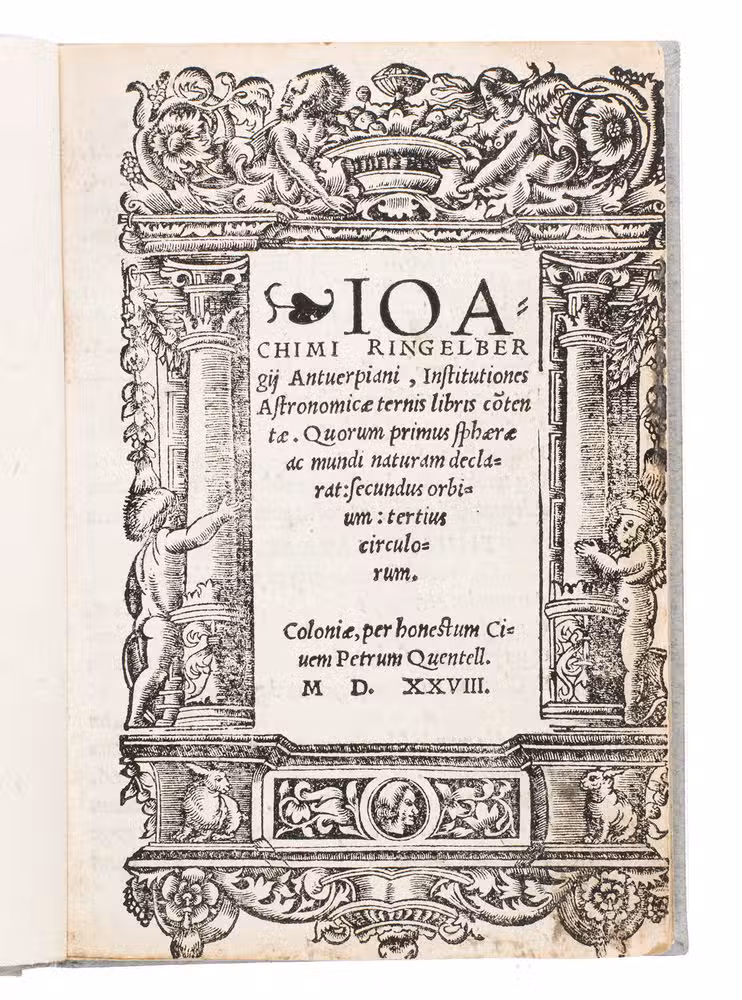 Rarest edition of an extremely rare treatise on astronomy by the Flemish humanist Joachim Sterck van Ringelberg (ca. 1499-1536), to whom the first use of the term Cyclopeadia (for encyclopeadia) is attributed. He studied at Louvain, followed by a student's "grand tour" through Germany, the Netherlands and France, where he met Erasmus and André Hyperius. Ringelberg was a successful teacher in Greek, astronomy, mathematics, and literature, and planned to write one thousand books, which he would call the "Chilias", but passed away when he had only written thirty. Although popular at the time, Ringelberg's books are now of the greatest rarity. The present edition is likely the first, but another was printed in Basel in the same year. The present, however, is more scarce.