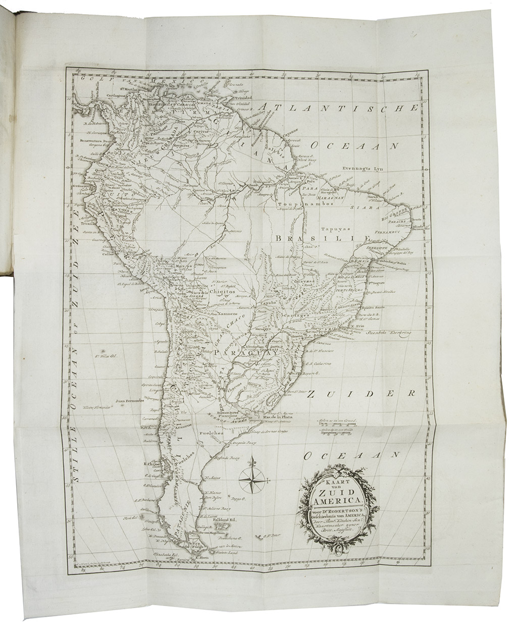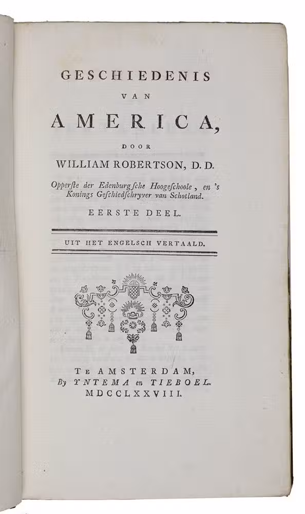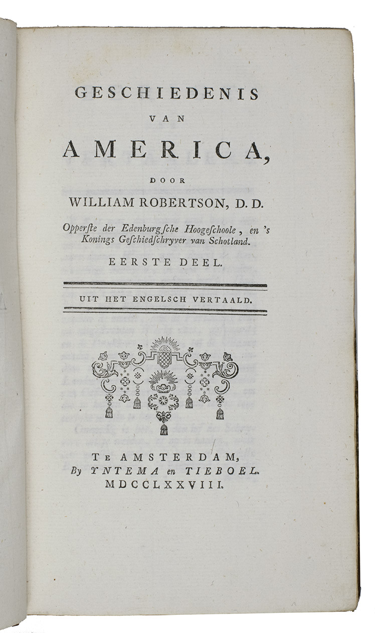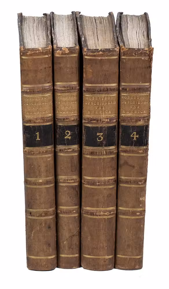 First edition of the Dutch translation by P. Loosjes of William Robertsons highly important history of the discovery of America, first published in 1777 as The history of America, an immensely popular anthropological account of American history that focuses on the explorations, the conquest of Mexico and Peru, and the anthropology of the indigenous American cultures. In these volumes Robertson wrote the first history of the discovery and Spanish conquest of America to be based on ample bibliographical information and documents in the Simancas archives. The bibliography (a catalogue of Spanish books and manuscripts) at the end of the last volume, pp. 303-322, is remarkable for the time (Borba de Moraes). The actions of Columbus and Cortez are especially well researched.