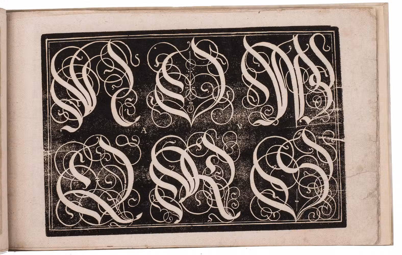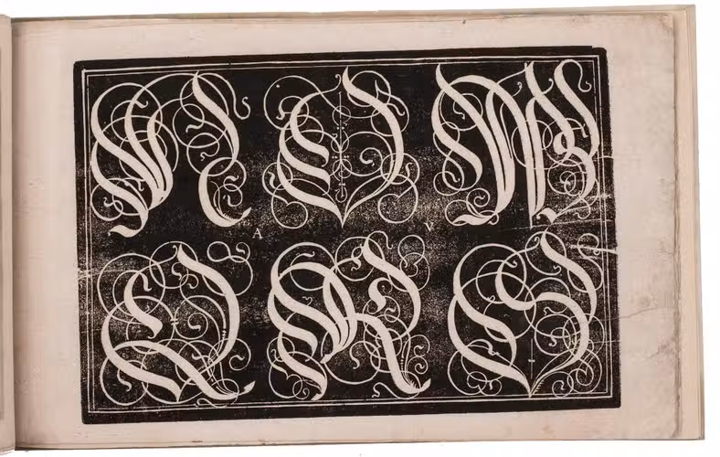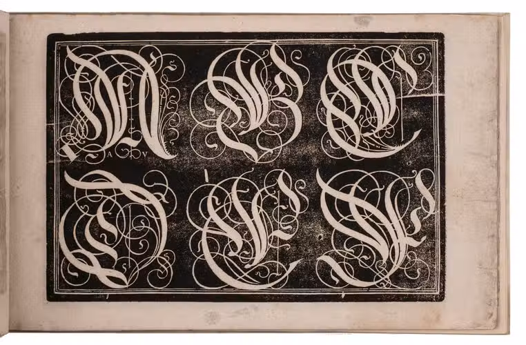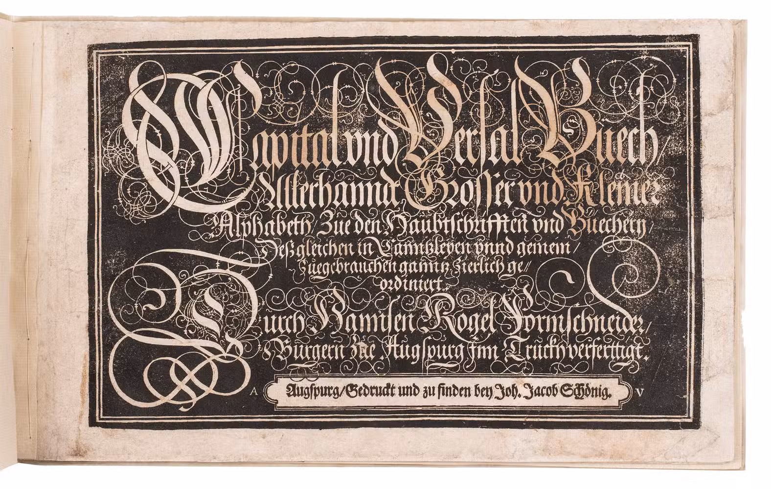 Sixth known copy of Johann Jacob Schönig's edition of a stunningly decorative Augsburg writing master's woodcut copybook, devoted primarily to decorated gothic capitals (versals), printed in the period 1680-1694 from the original woodblocks of the first edition of 1568. Hans Rogel the elder (1532-1592), writing master, school teacher, poet, wood-block cutter, engraver, printer and publisher at Augsburg cut the woodblocks and probably executed the lettering himself. All the lettering examples and the title-page are printed from large, richly calligraphic woodcuts with their lettering in white on black. Nine of the ten examples display versals (the missing leaf supplied in reproduction), including complete alphabets in three sizes. The final leaf displays alphabets of textura capitals, textura minuscules and roman capitals. As early as 1779 Paul von Stetten described Rogel's Capital und Versal Buech as "besonders fein geschnitten" and said that if Rogel executed the lettering himself he "ist er billig den zierlichsten Schreibmeistern beyzuzählen". He thought it good enough to be the work of Caspar Brinner (1565-1610), the greatest Augsburg writing master of the second half of the century, apparently not knowing Brinner was only about three years old in 1568.