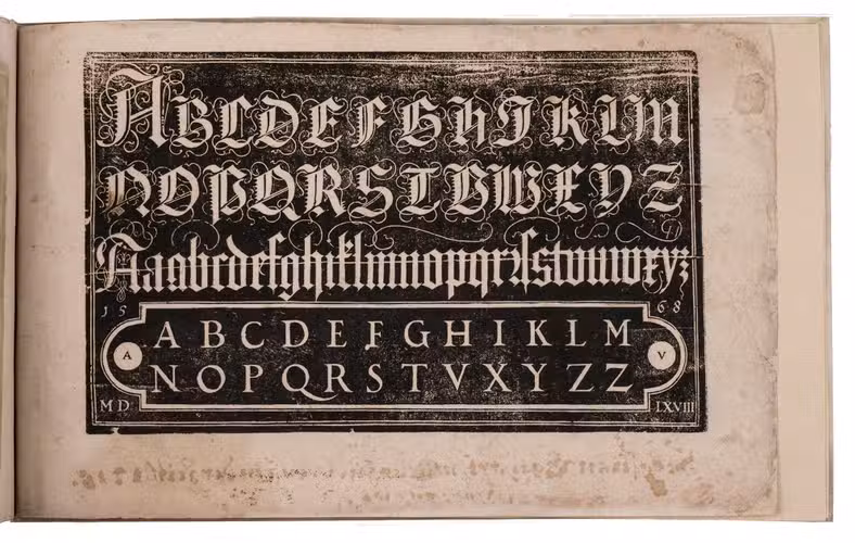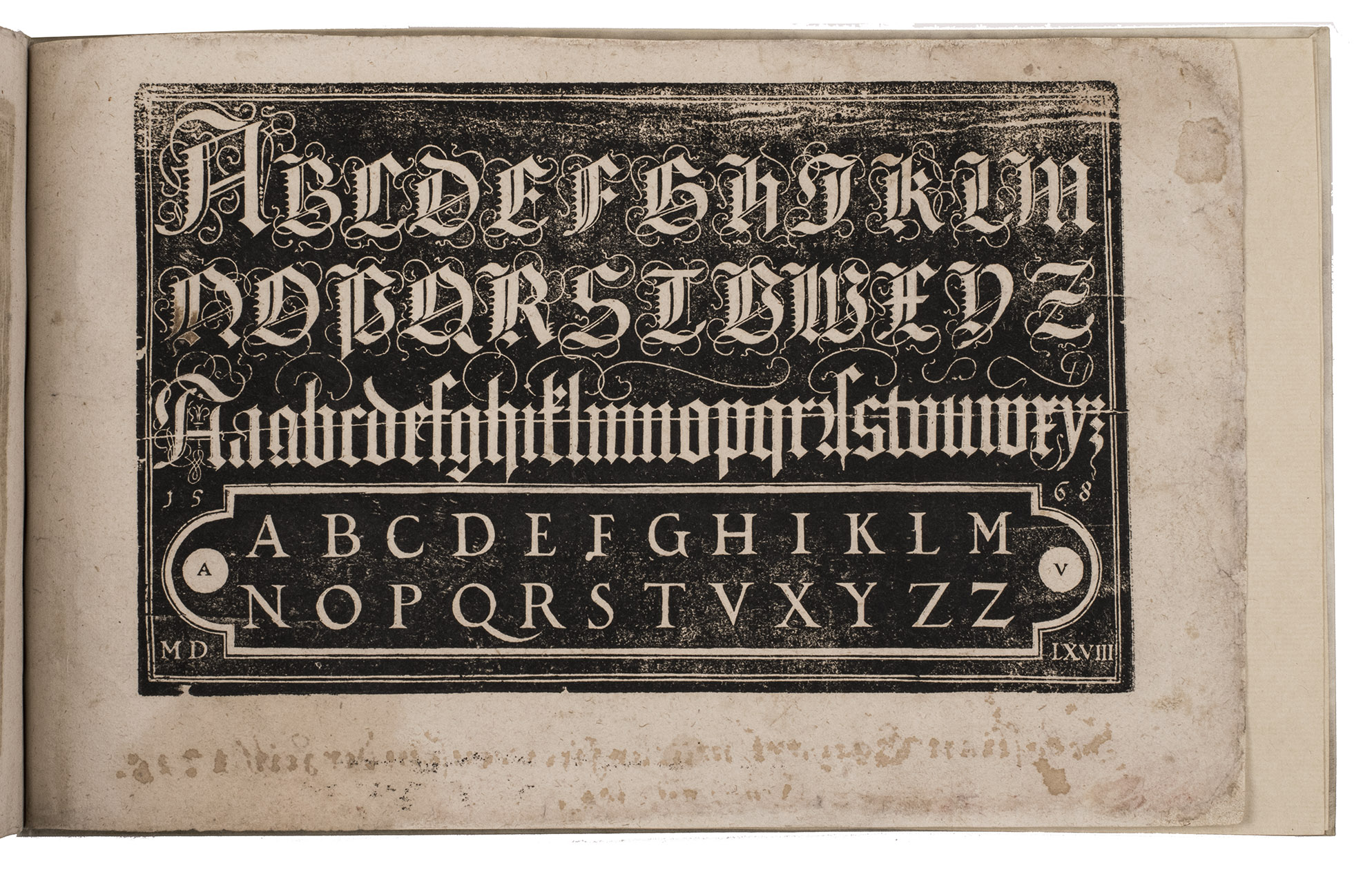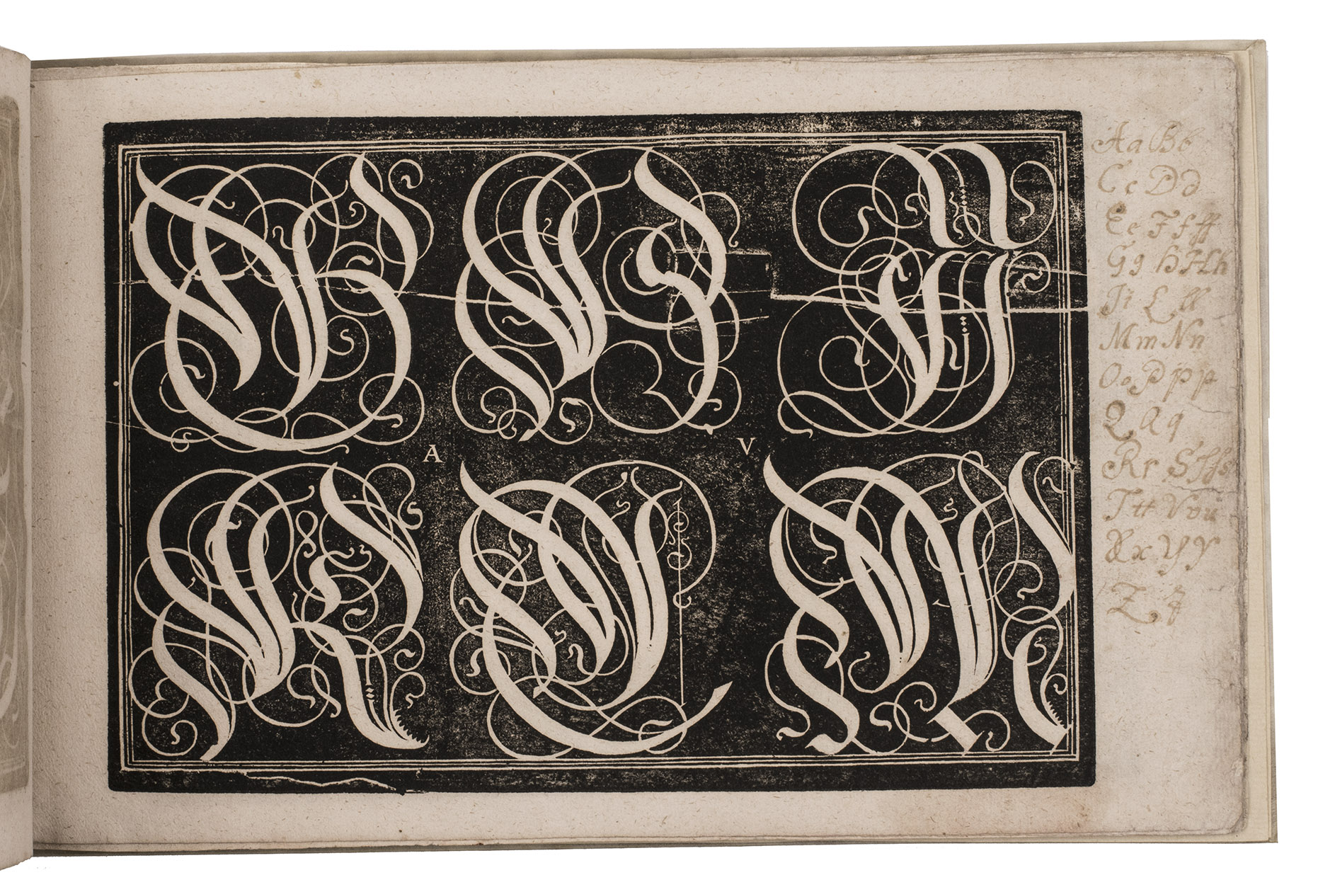 Augsburg, Johann Jacob Schönig, [1680/94, printed from the woodblocks of 1568]. Oblong folio (21 x 34 cm). With a richly calligraphic woodcut title-page (18 x 28 cm), with text in white fraktur lettering on black, with a white panel at the foot with the letterpress imprint in a fraktur type; and 9 (of 10) full-page woodcuts (about 17 x 25.5 cm) showing alphabets in white on black, one dated 1568: 8 with decorated gothic capitals (versals: 22-150 mm) and 1 with textura capitals, textura lowercase and roman capitals, all versos blank. With a small and perhaps fragmentary manuscript on parchment (2 ll., 11.5 x 13.5 cm, written on both sides): a Protestant copybook written (soon?) after 1557, probably in Basle or vicinity, with 7 writing samples, including alphabets of capitals and minuscules, the first two pages in fraktur gothic styles, and the last two in humanistic styles. Vellum (ca. 1985?), in a cloth slipcase. [10 (of 11)] ll.