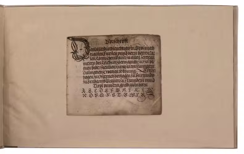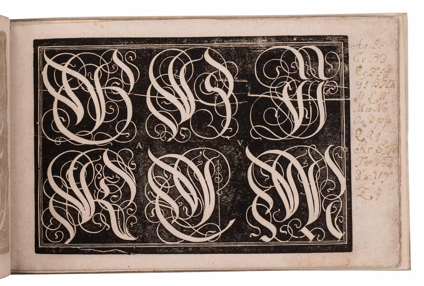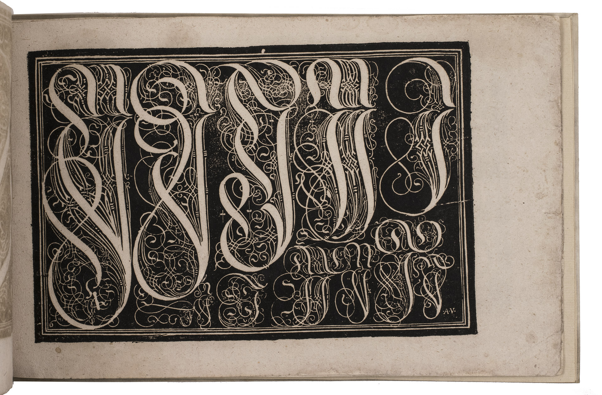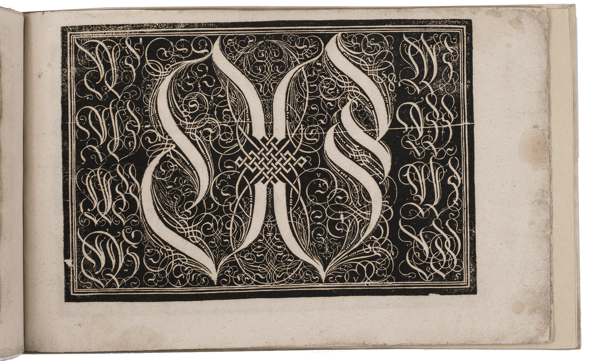 Augsburg, Johann Jacob Schönig, [1680/94, printed from the woodblocks of 1568]. Oblong folio (21 x 34 cm). With a richly calligraphic woodcut title-page (18 x 28 cm), with text in white fraktur lettering on black, with a white panel at the foot with the letterpress imprint in a fraktur type; and 9 (of 10) full-page woodcuts (about 17 x 25.5 cm) showing alphabets in white on black, one dated 1568: 8 with decorated gothic capitals (versals: 22-150 mm) and 1 with textura capitals, textura lowercase and roman capitals, all versos blank. With a small and perhaps fragmentary manuscript on parchment (2 ll., 11.5 x 13.5 cm, written on both sides): a Protestant copybook written (soon?) after 1557, probably in Basle or vicinity, with 7 writing samples, including alphabets of capitals and minuscules, the first two pages in fraktur gothic styles, and the last two in humanistic styles. Vellum (ca. 1985?), in a cloth slipcase. [10 (of 11)] ll.