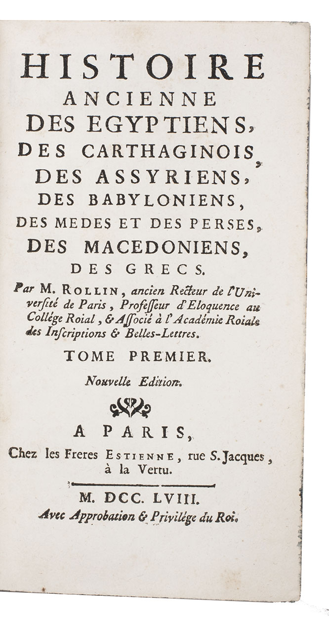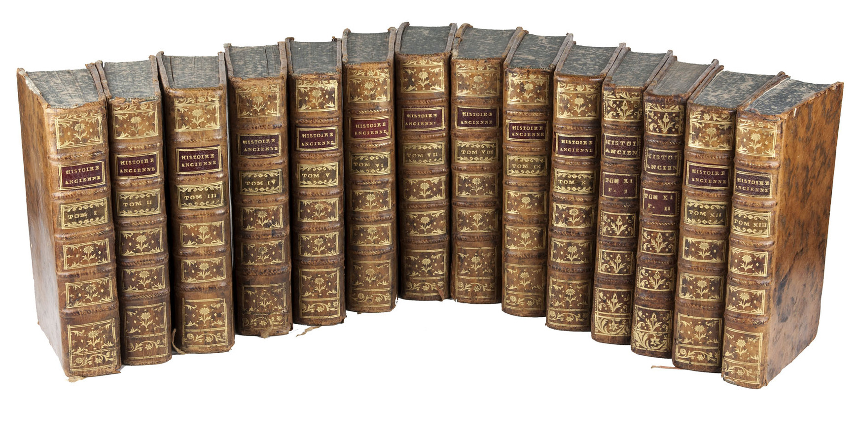 Lovely set, in the original French, of Rollin's very popular Histoire ancienne, which, contrary to its full title, primarily describes ancient Greece (the other ancient peoples are only treated in the first two volumes). It's a mixed set from three editions published by the Estienne family in nice closely matching bindings. After the first volume appeared in 1730, the series grew well beyond its initially planned five volumes and became tremendously popular, appearing in numerous editions and translations well into the 19th century.