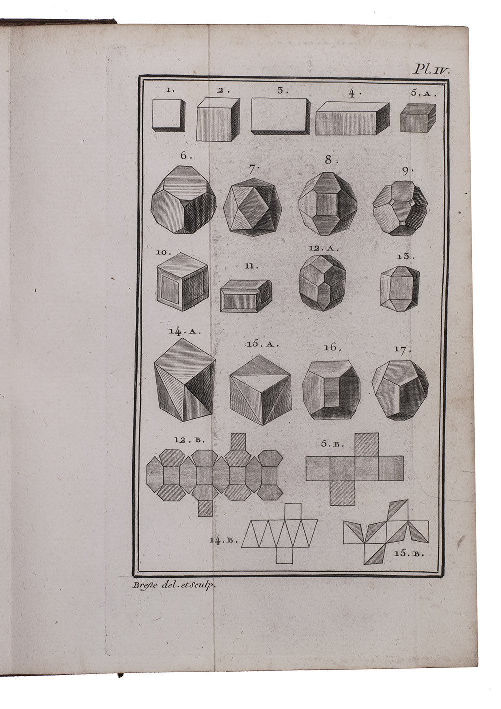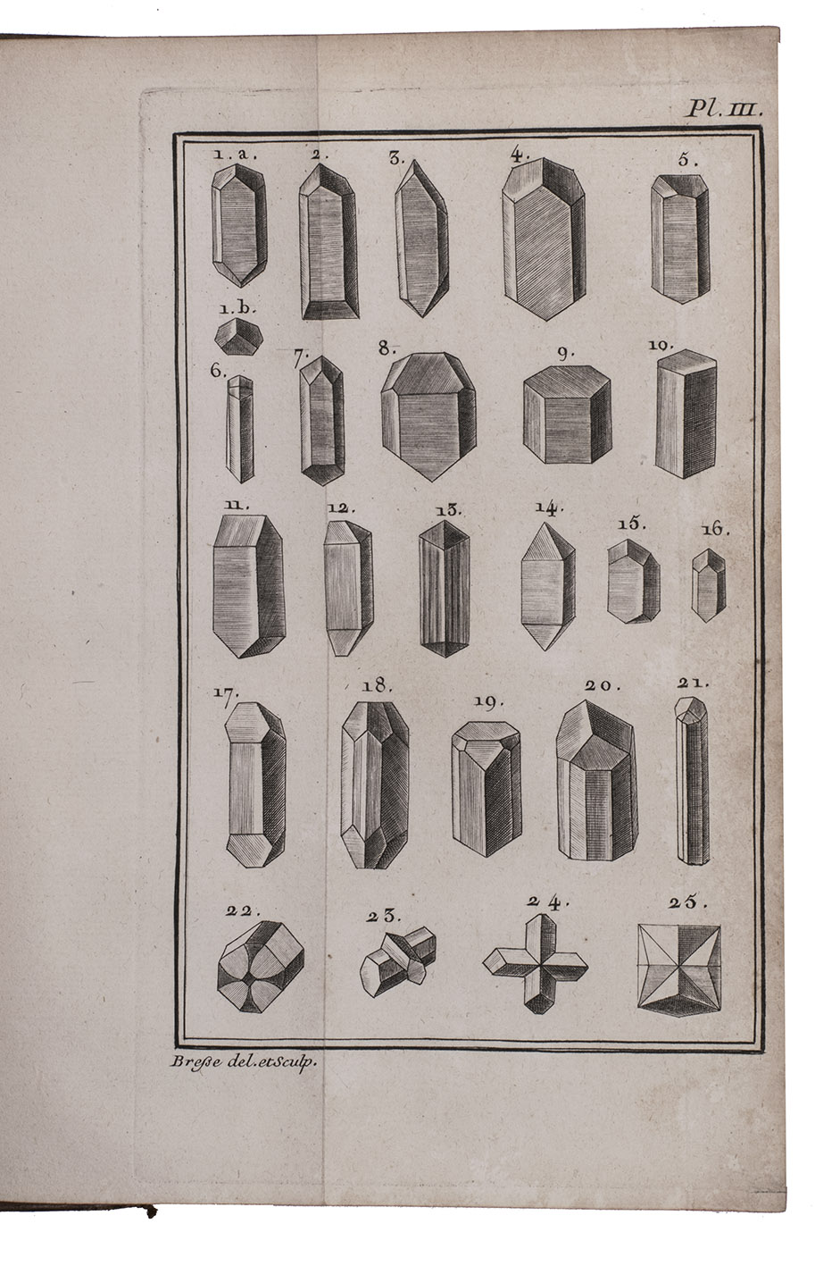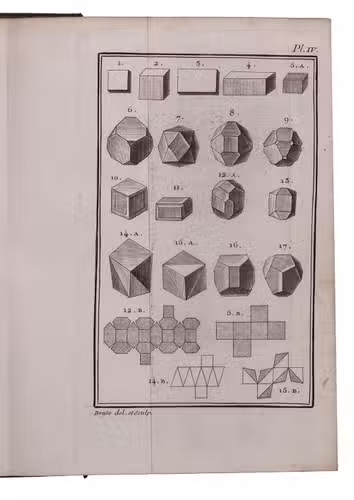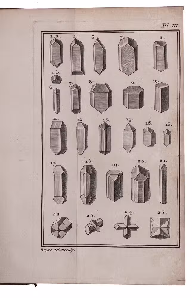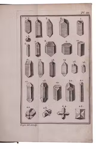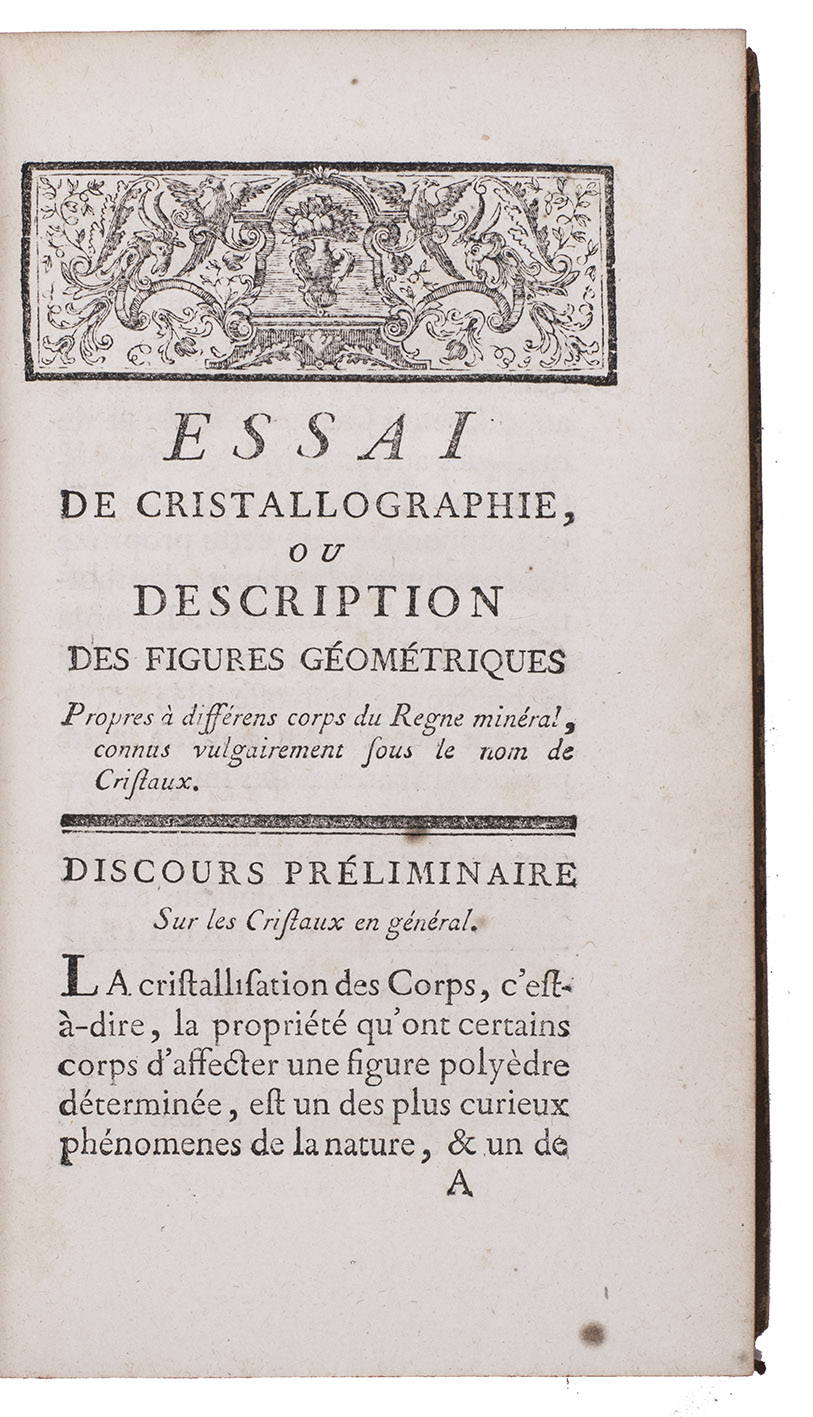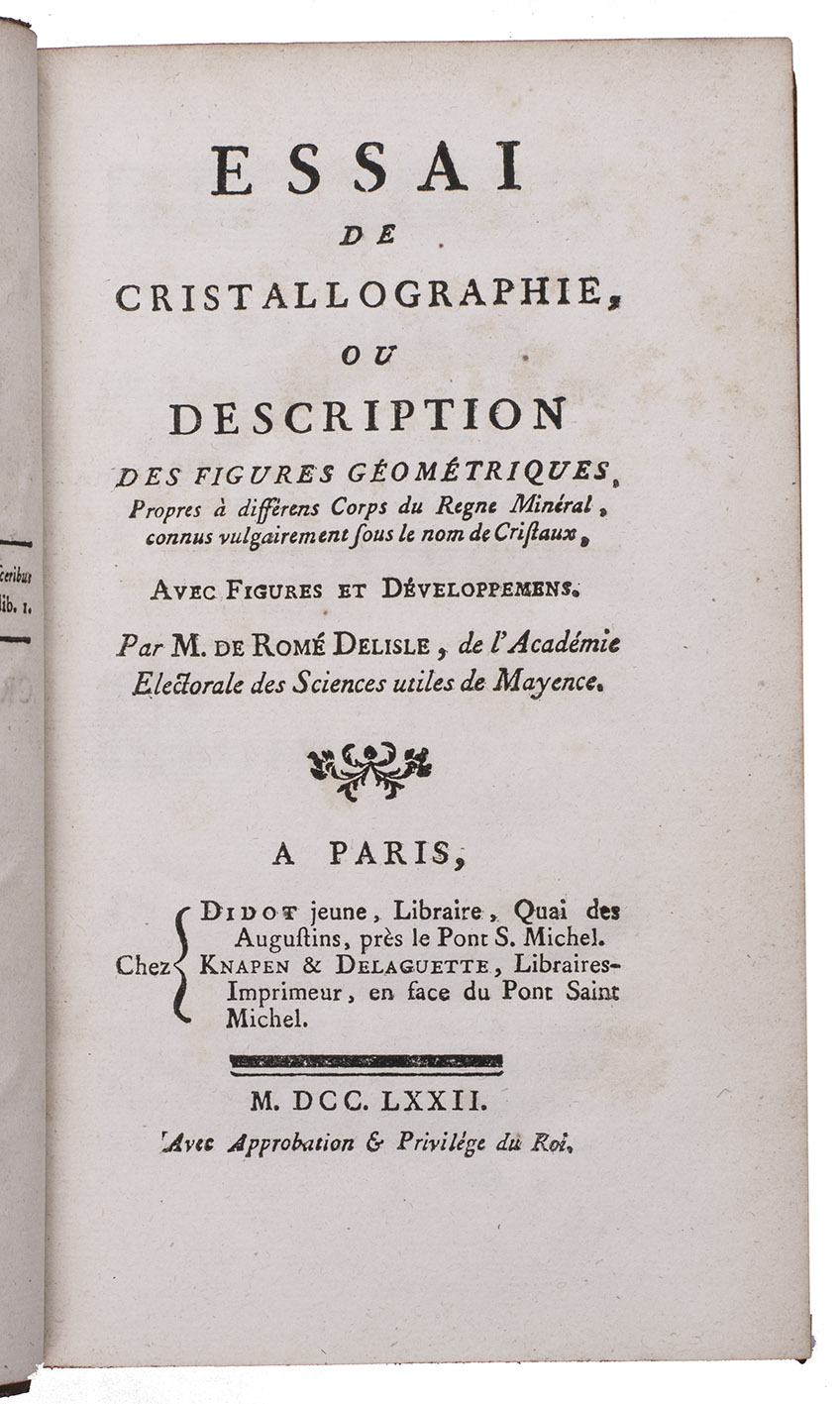 First edition of an influential work on geometrical crystallography by the French mineralogist Jean-Baptiste Louis Romé de l'Isle (1736-1790), one of the founders of modern crystallography. "In 1772 he published his first important technical work, a one volume essay on crystallography in which he identified 110 crystal forms. This was a major expansion upon the work of Linnaeus ... The Essai made Romé de l'Isle a prominent name among Parisian scientists of his day" (Wilson). Romé is best known for his "law of constancy of interfacial angles", now the first law of crystal habit. The preliminaries contain an annotated bibliography by the author of the principal works on crystals. The plates depict numerous crystal forms as well as some geometric figures.