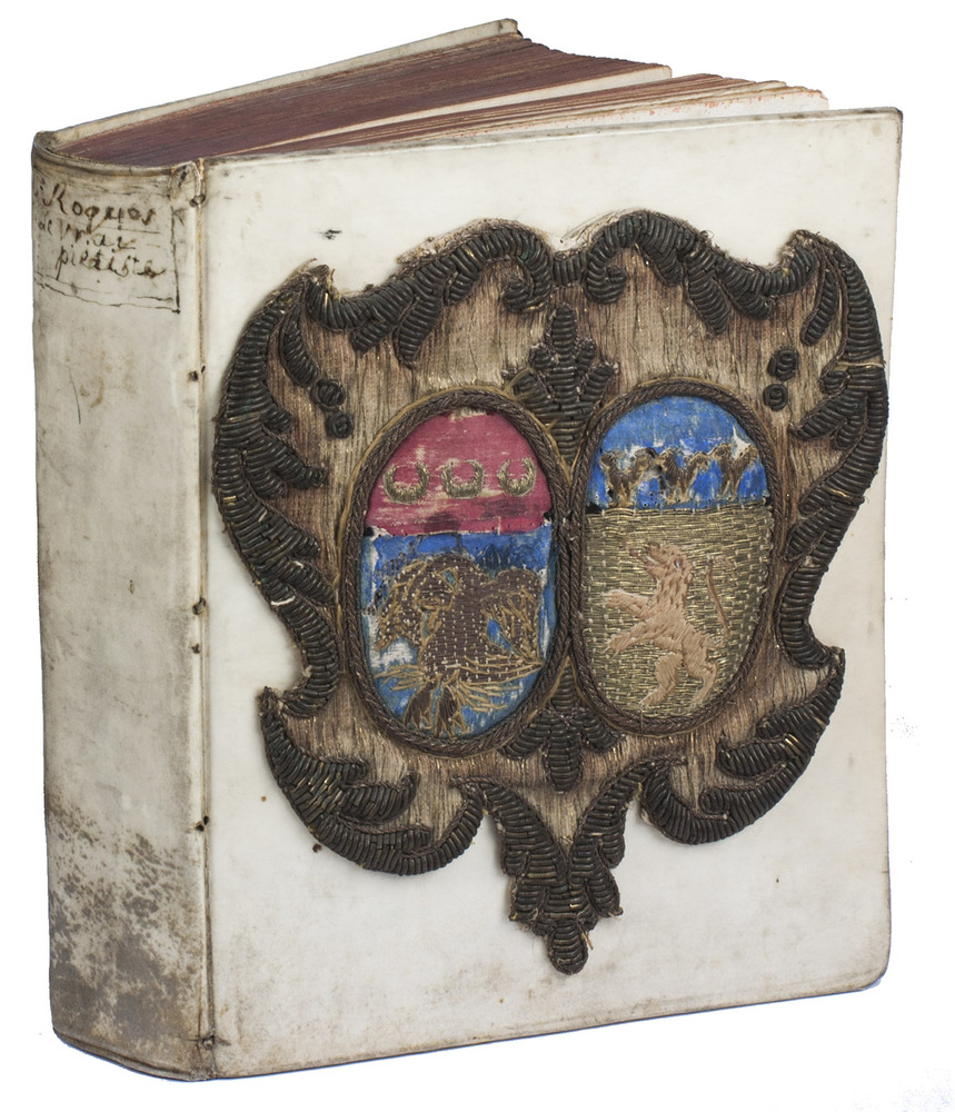 The book is bound in vellum, with an embroidered double coat of arms mounted on the front board. The arms are of Eusèbe-Jacques Chaspoux, marquis de Verneuil (1695-1747) and his wife Louise Françoise Bigres (d. shortly after 1747), the marchioness de Verneuil. Chaspoux de Verneuil was a high-ranking courtier: "the doyen des sécretaires de la chambre du Roi et introducteur des ambassadeurs". His castle is in Verneuil-sur-Indre (Dept. Indre et Loire, arrond. Loches) and still exists. His coat of arms: a golden pelican with its two chicks on an azure field with three golden crescents on a red field; hers: a lion before a golden fence with three roosters on an azure field above.