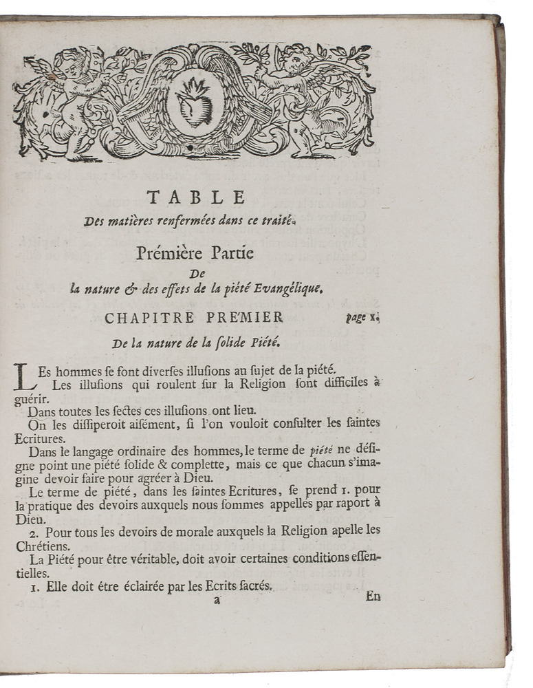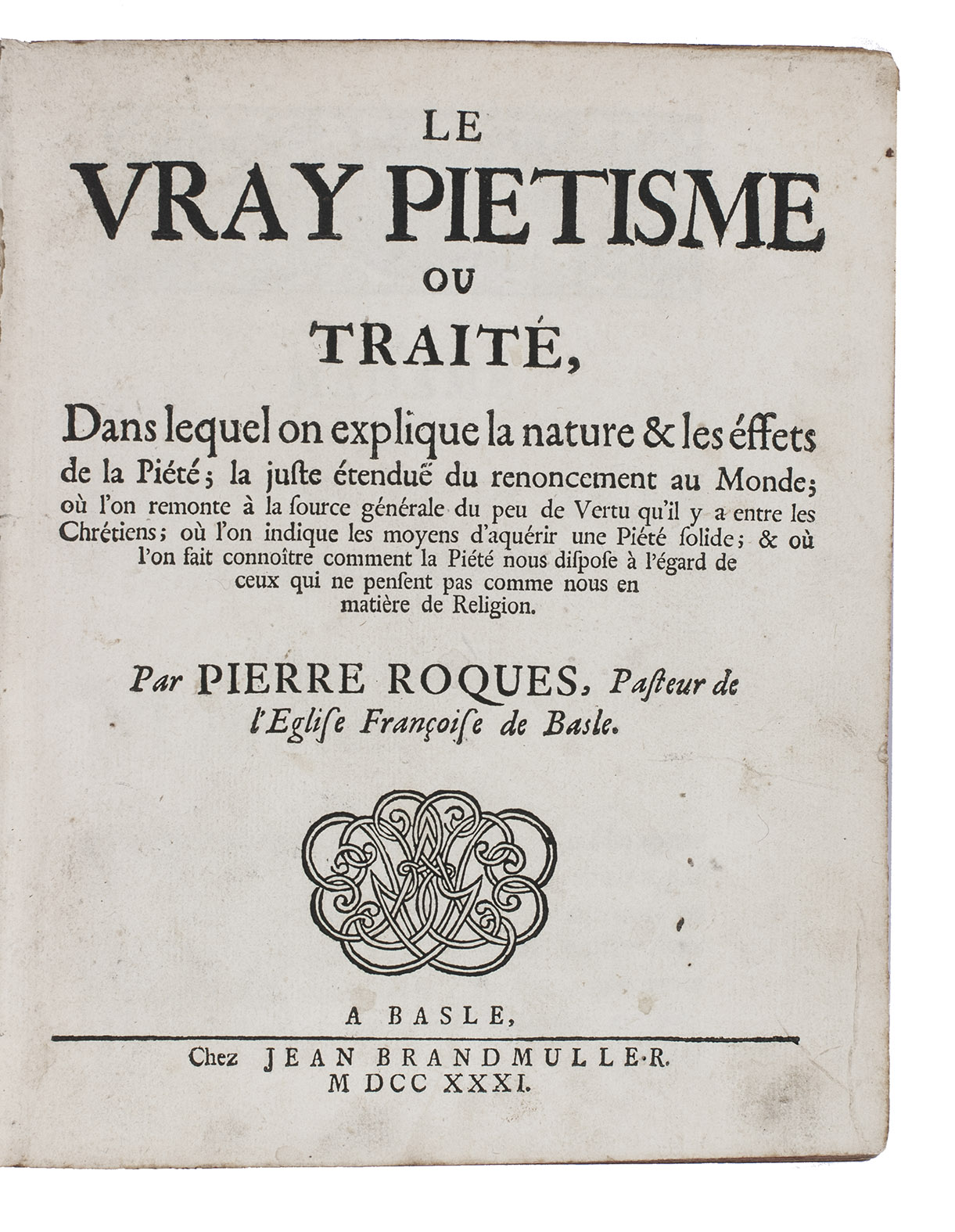 First edition of the main work of Pierre Roques (1685-1748), French Protestant minister in Basel. It is a defence of a "true pietism", i.e. a rational and tolerant form of piety, against liberalism on the one hand and "enthusiasm" on the other. It was translated into German in 1748.