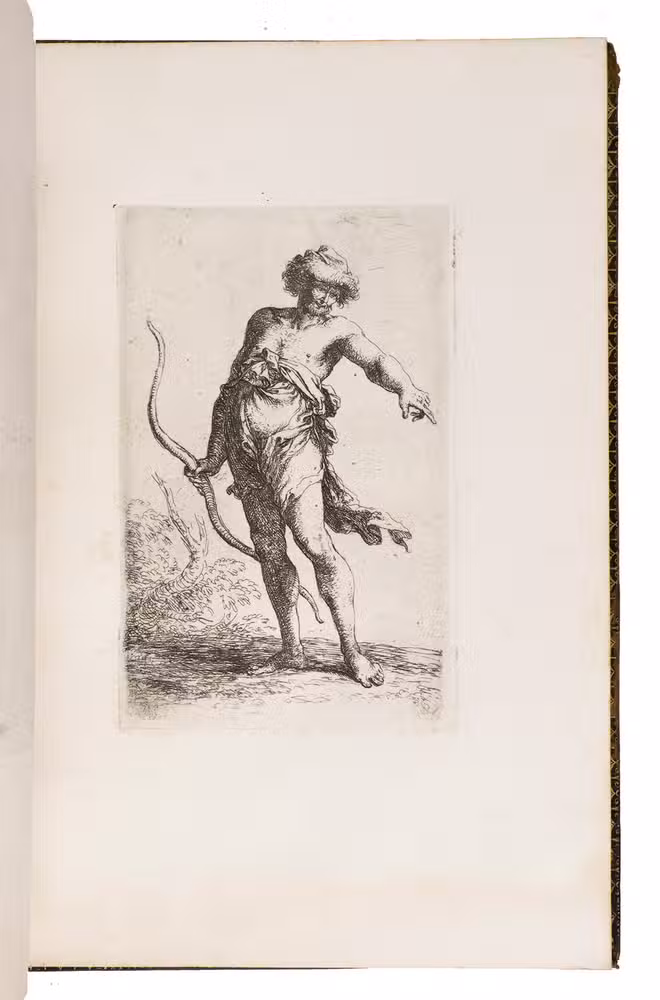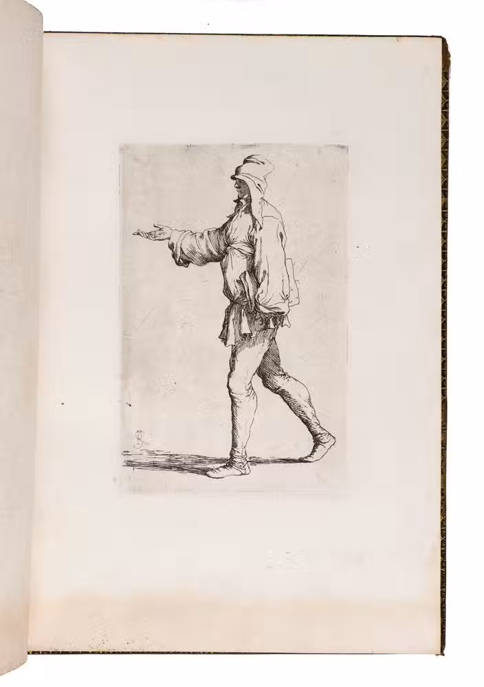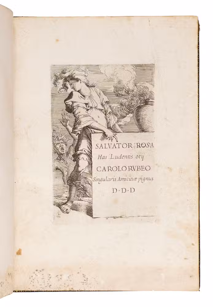 The series became very popular until well into the 19th century, with numerous copies and imitations printed. The most widely known is the German edition, printed by Joachim von Sandrart around 1690 in Nuremberg. This edition is most commonly found on the market and in institutions, and is easily recognisable because the etchings are mirrored. Copies printed from the original copperplates are rare. The present collection was printed in the early 18th century, and likely bought and compiled in Rome by someone taking part in the Grand Tour. It includes 60 etchings from the figurine series, with the famous frontispiece, and 1 duplicate (Wallace 33). All etchings are present in the second and final state (with the exception of the few etchings that only had a first state), as they are identical on both size and image to the examples shown by Wallace. The first state is exceptionally rare, with only one collection known to include them. It appears that Rosa printed the first state only once, and reworked the copperplates directly after when necessary, deepening the lines, adding more contouring, and signing them. Etchings of the second state are therefore more beautifully printed, in much darker impressions, and include Rosa's monogram.