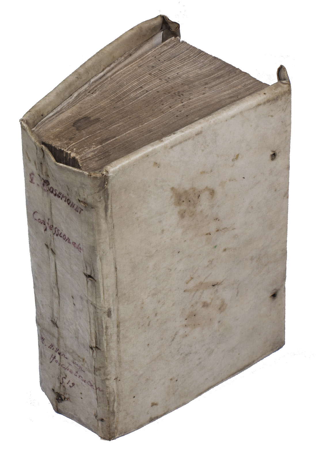 With a contemporary owner's inscription and occasional contemporary marginal notes and underlining. With a transparent stain at the foot of the title-page, the title-page slightly worn, a couple faint marginal stains, and with the margins trimmed, but otherwise in fine condition. The binding is somewhat worn, and its vellum had been previously used for a book that was only about 2.5 cm thick but had slightly larger leaves. BCNI 713; Machiels R267; Netherlandish books 26872; Nijhoff & Kronenberg 1821; USTC 403302 (but one of the links is to the 1st ed.); cf. Adams R782 (2nd ed.); Biogr. nationale de Belgique XX, pp. 102-110 at pp. 107-108 (other eds.); Gistelinck & Sabbe 783 (1525 Hillen van Hoochstraten ed.); C. Coppens, "Het Confessionale van Godschalc Rosemondt, spiegel van een nieuwe maatschappij", in: Ex Officina: Bulletin van de vrienden van de Leuvense Universiteitsbibl. II (1985), pp. 13-36, 94-108; Th.N. Tentler, Sin and confession on the eve of the Reformation (1977), pp. 37-38; for Rosemondt, see also NNBW V, cols. 612-613.