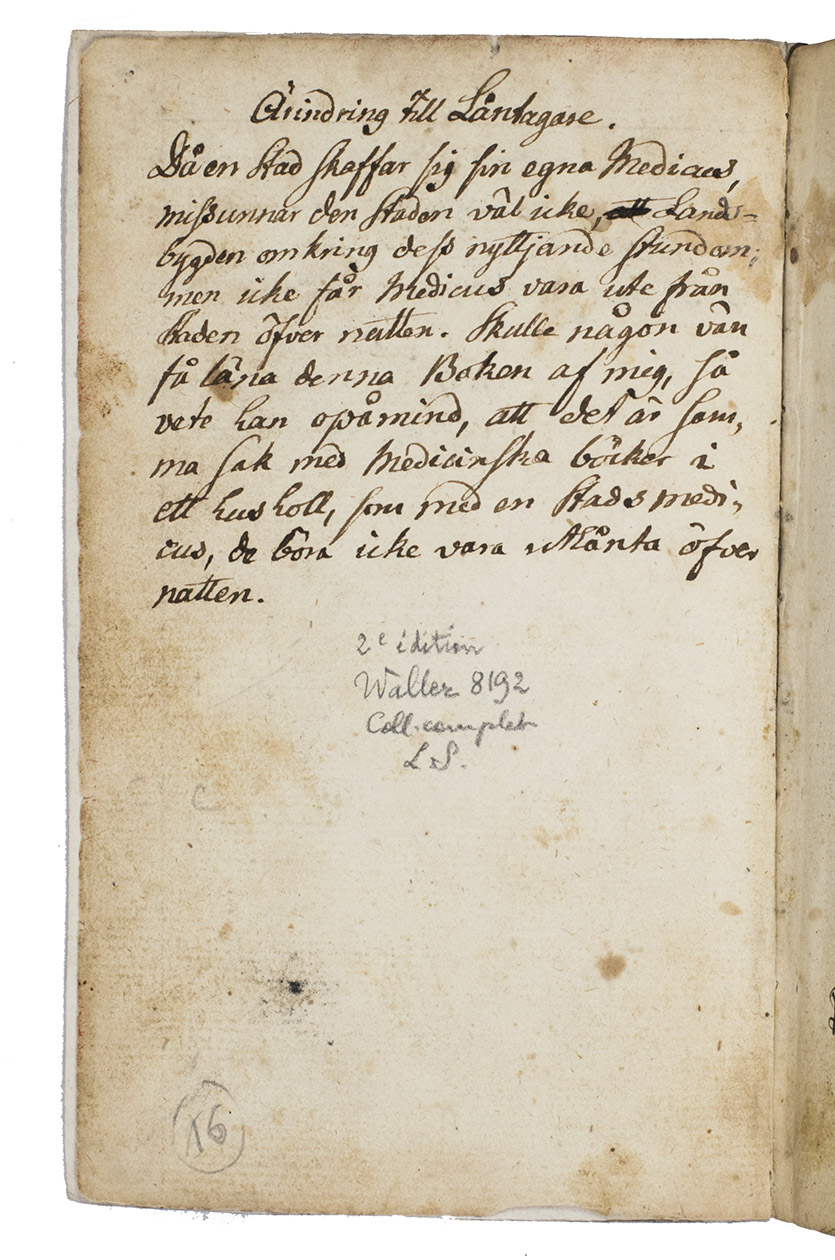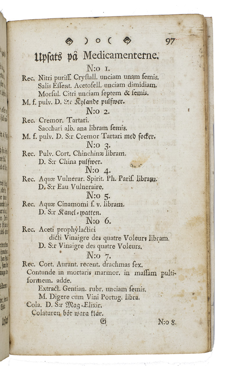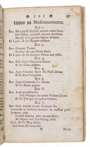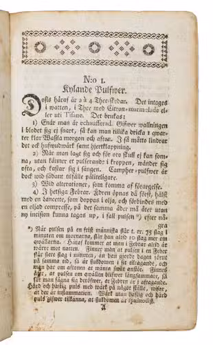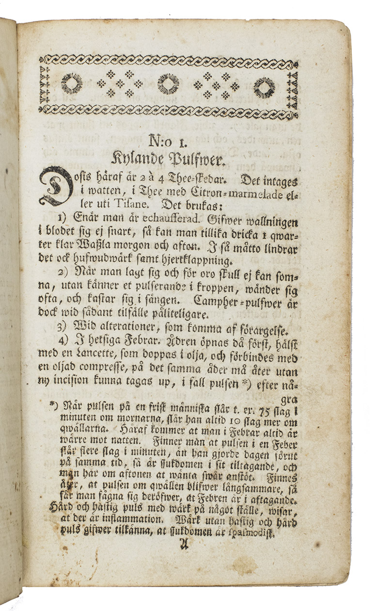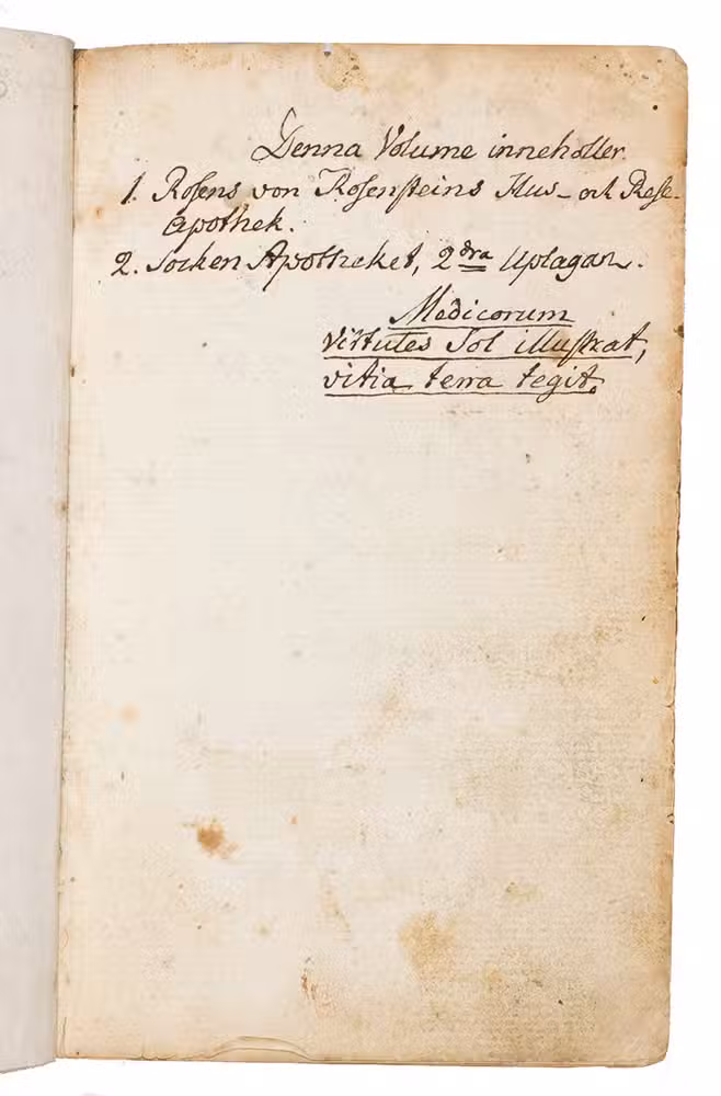 Later edition of a popular Swedish Domestic medicine chest or first-aid kit for travelers of which more than 10 editions appeared between 1765 (first edition) till 1800. The author Nils Rosen von Rosenstein (1706-1773) was a well-known Swedish physician, considered the founder of modern pediatric. His main work, The diseases of children, and their remedies is considered to be the first modern textbook on the subject, with translations in English by Andrew Sparman and Dutch. Rosen was the First physician to the King of Sweden and a Knight of the Polar Star. He studied in Leiden with Herman Boerhaave and Pieter van Musschenbroek.