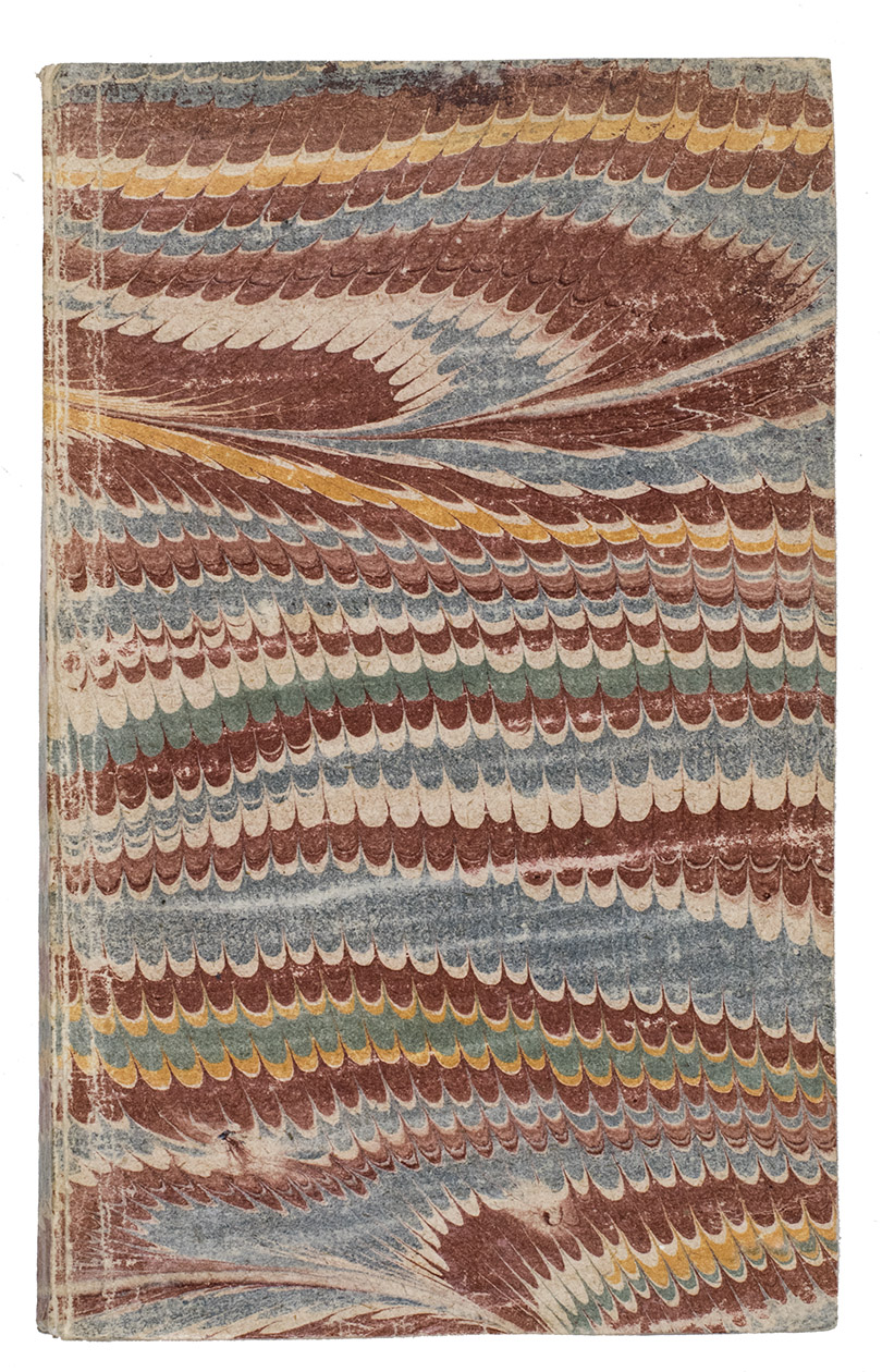 Stockholm, Carl Gottlieb Ulfs, 1772. 8vo. Engraved title-page with calligraphic lettering and vignette: a coach driving through a Swedish landscape. Wrappers covered with marbled paper. (2), 104, (8) pp.