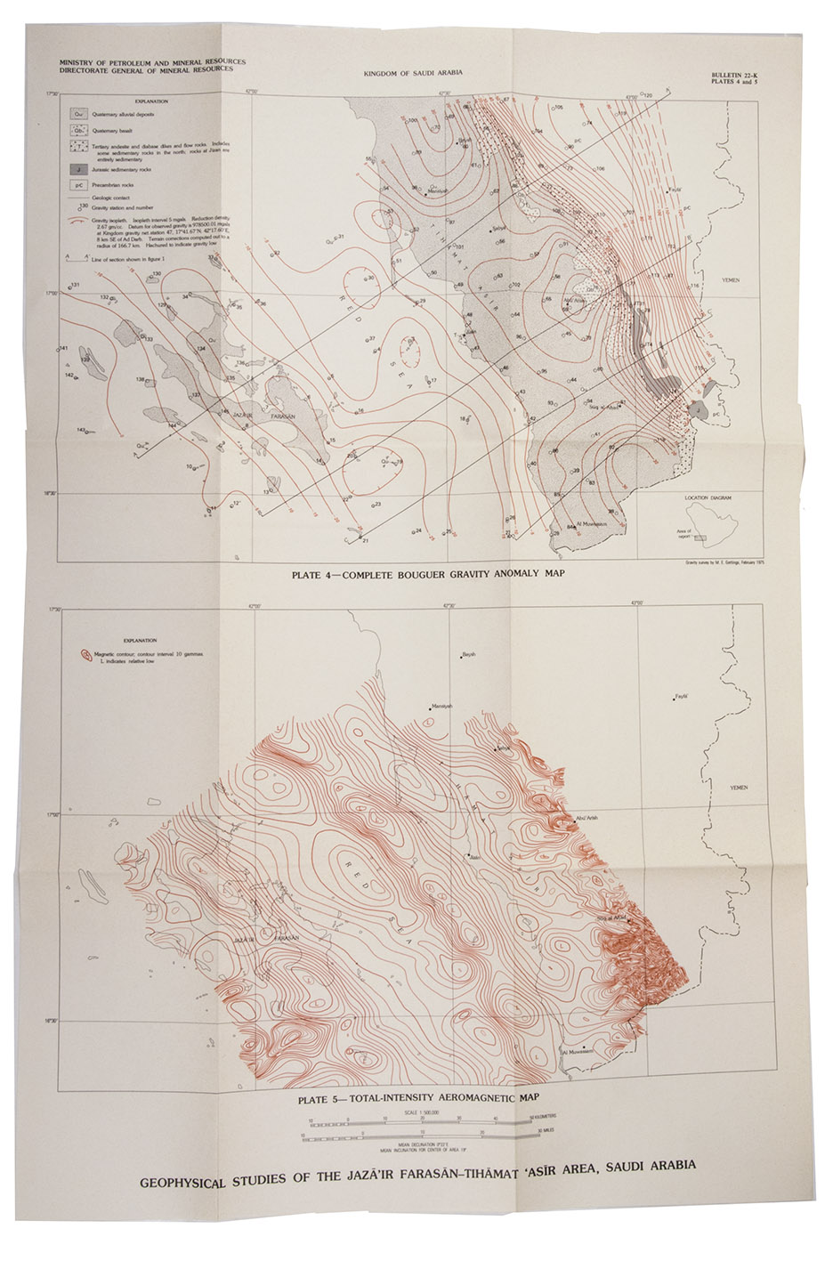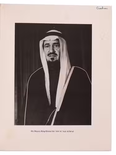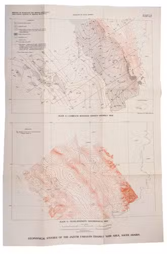 Jeddah, Directorate General of Mineral Resources (colophon: printed by Dar Al Asfahani), 1977. 4to. With a portrait of His Majesty King Khaled Ibn 'Abd Al 'Aziz Al Sa'ud as frontispiece, 6 numbered maps on 5 loosely inserted folding leaves and numerous illustrations in text. Publisher's original green wrappers, decorated front. Ca. 300 pp.