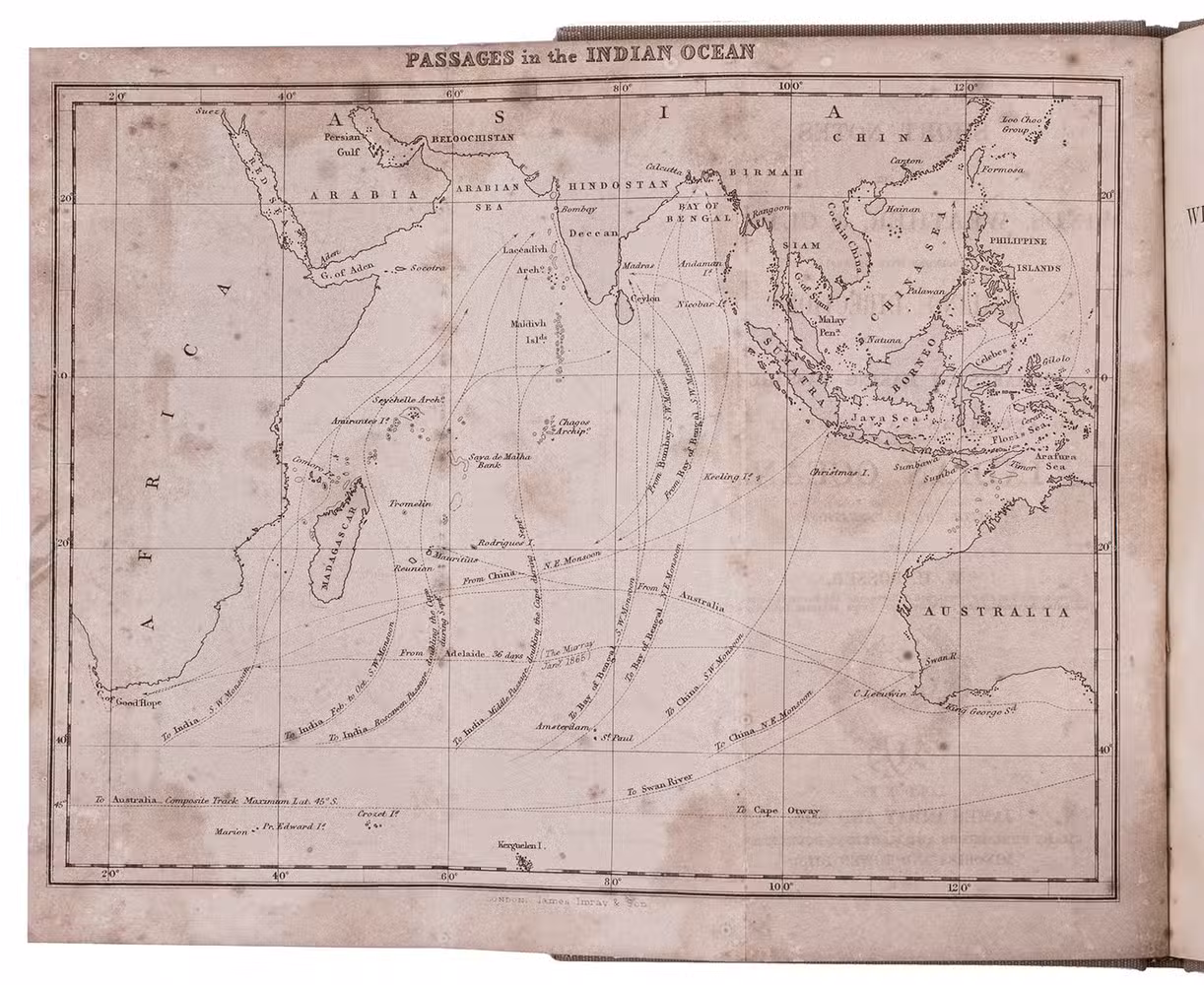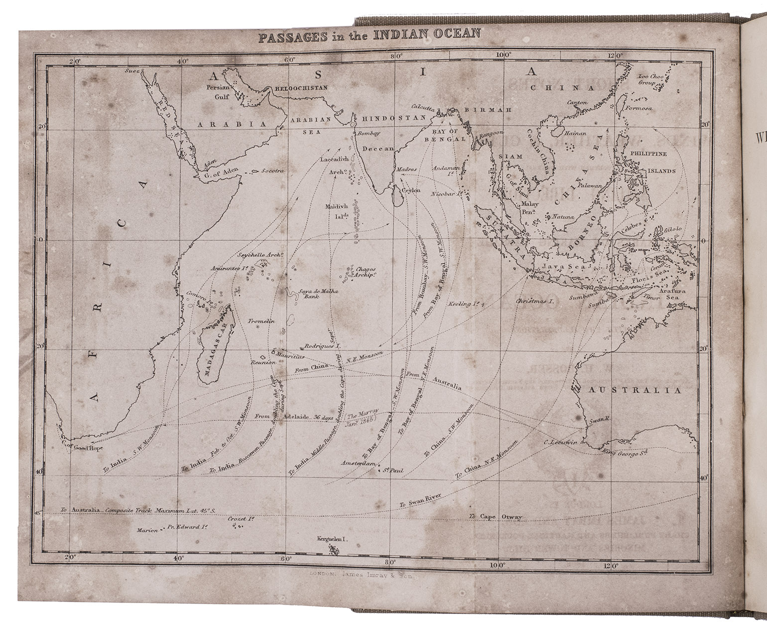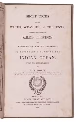 Second copy located of a compendium for sailing the Indian Ocean. As the title indicates it gives short notes on the wind weather and currents and general sailing directions. Including directions to Singapore and the Arabian Sea. For more extended details the author refers to his Indian Ocean directory.