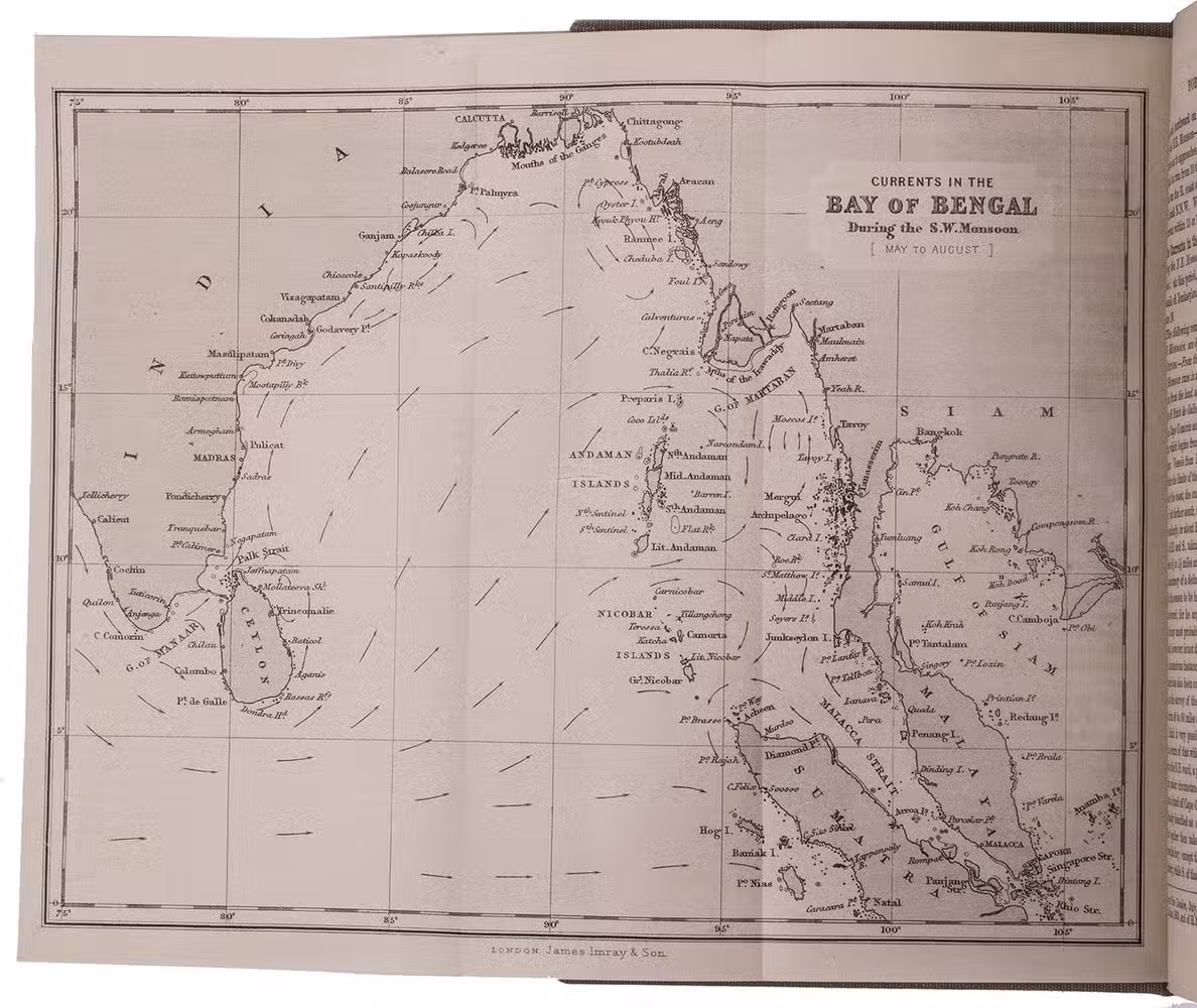 The charts depict the passages in the Indian Ocean (showing the coast of Africa, Arabia, south and south-east Asia and Australia), the currents in the Indian Ocean (idem) and the currents in Bengal (showing the coast of India, Ceylon, Siam, Sumatra, Malaysia and Singapore).