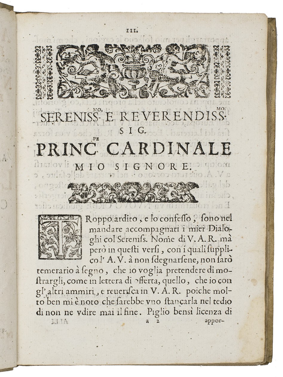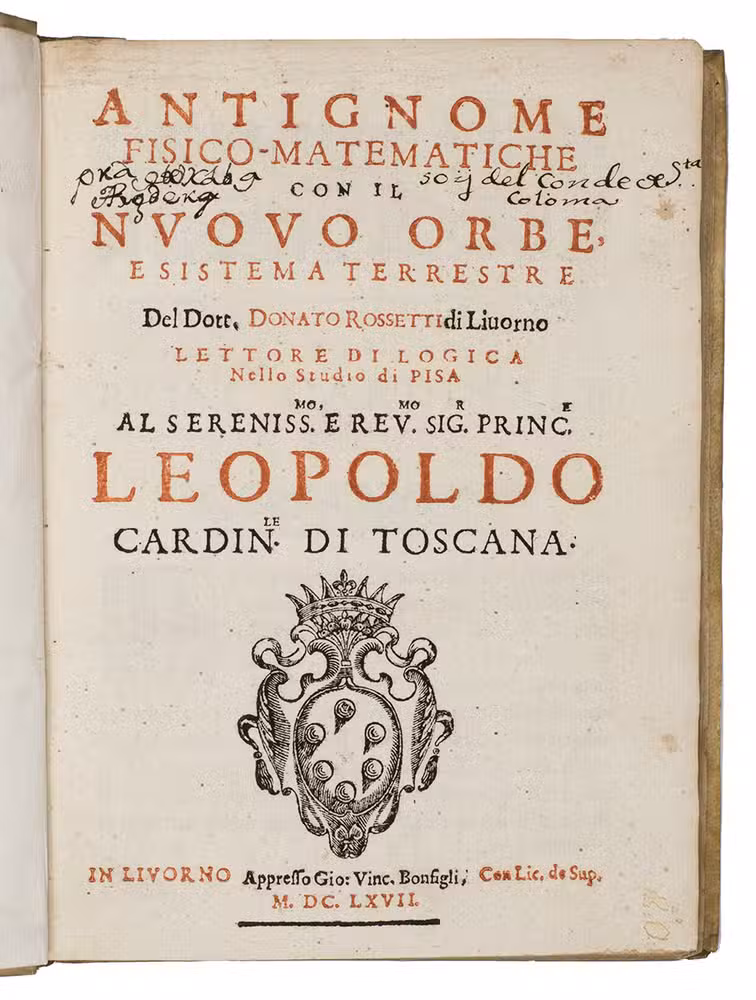 Rare first edition of a handbook of physics, including optics, mechanics, fluid dynamics and cosmography, illustrated with numerous woodcut diagrams and other illustrations in the text. It was written by Donato Rossetti, professor of natural philosophy at Pisa, in the wake of Galileo's 1633 trial for promoting the heliocentric theory of the solar system. Rossetti later became tutor in mathematics to the Duke of Savoy and professor of mathematics at Turin. The book is a refutation of Geminiano Montanari's Pensieri fisico-matematici (Bologna 1667). In the period shortly after Galileo, experimentalists like Montanari (1633-1675) engaged in a battle against the more mystical views of scientists such as Rossetti.