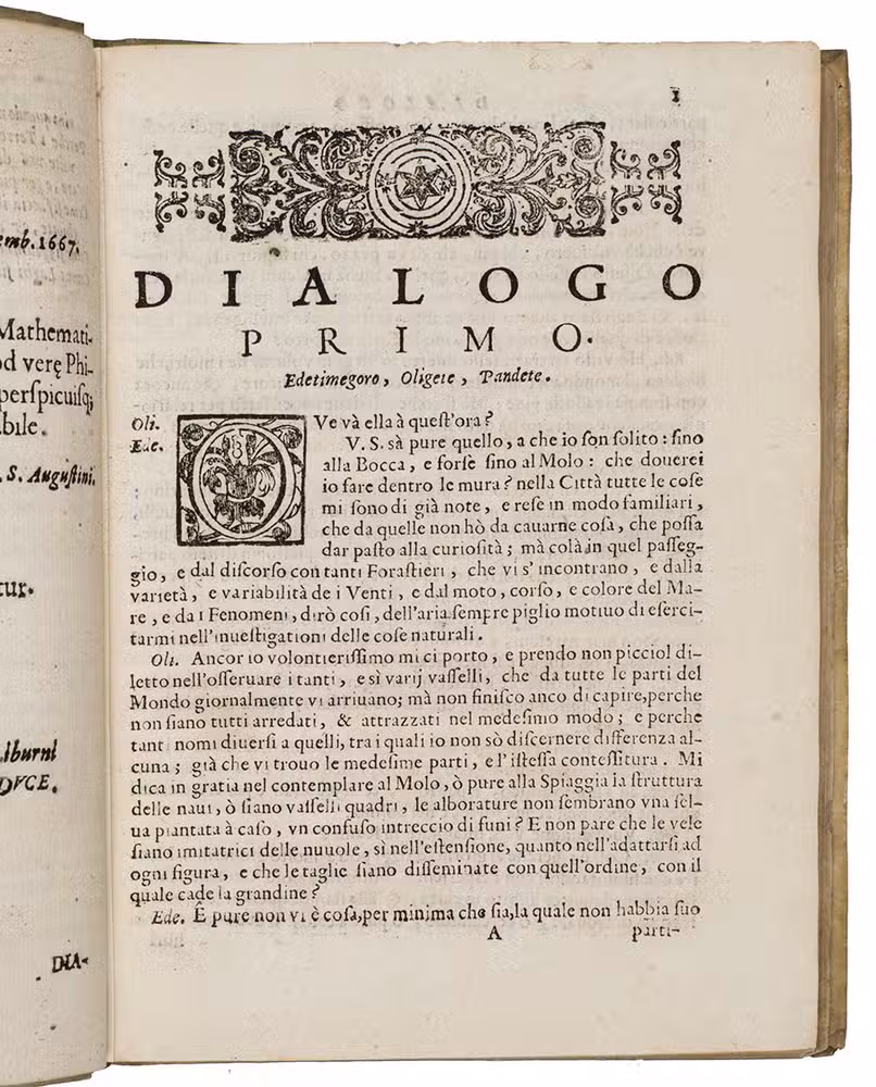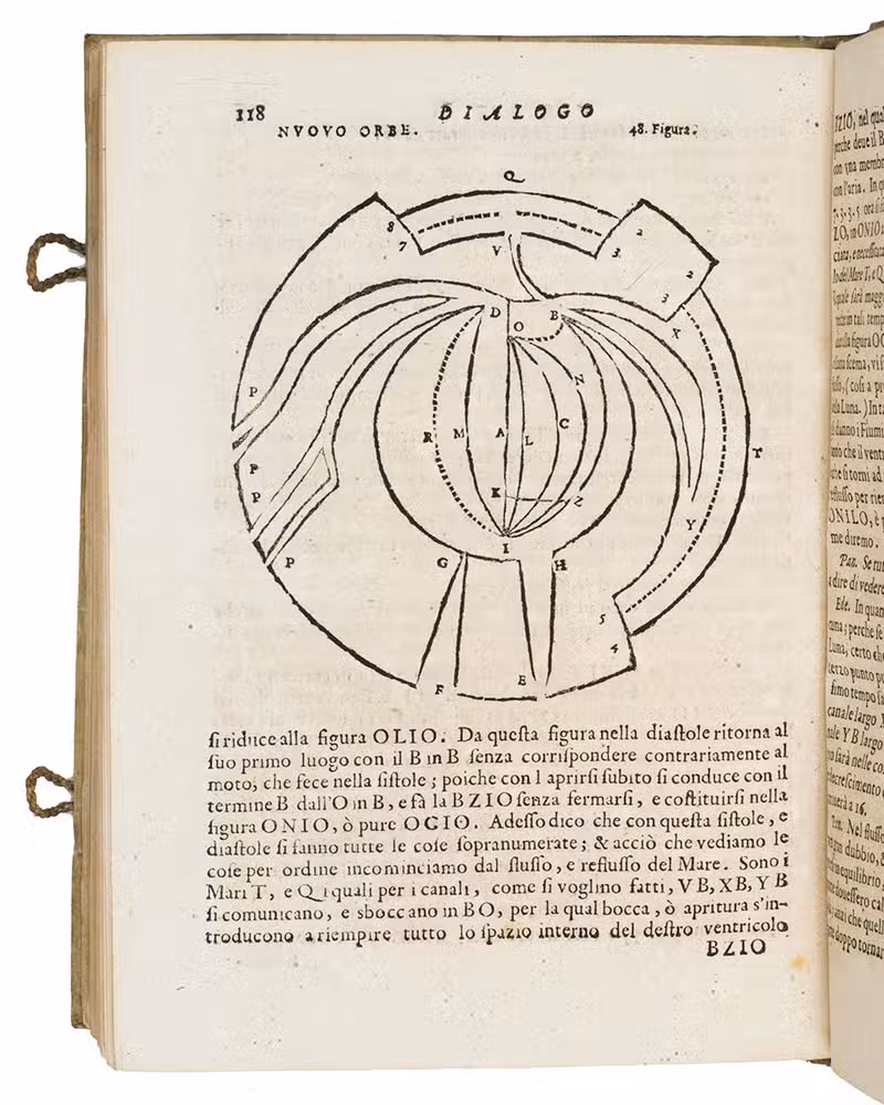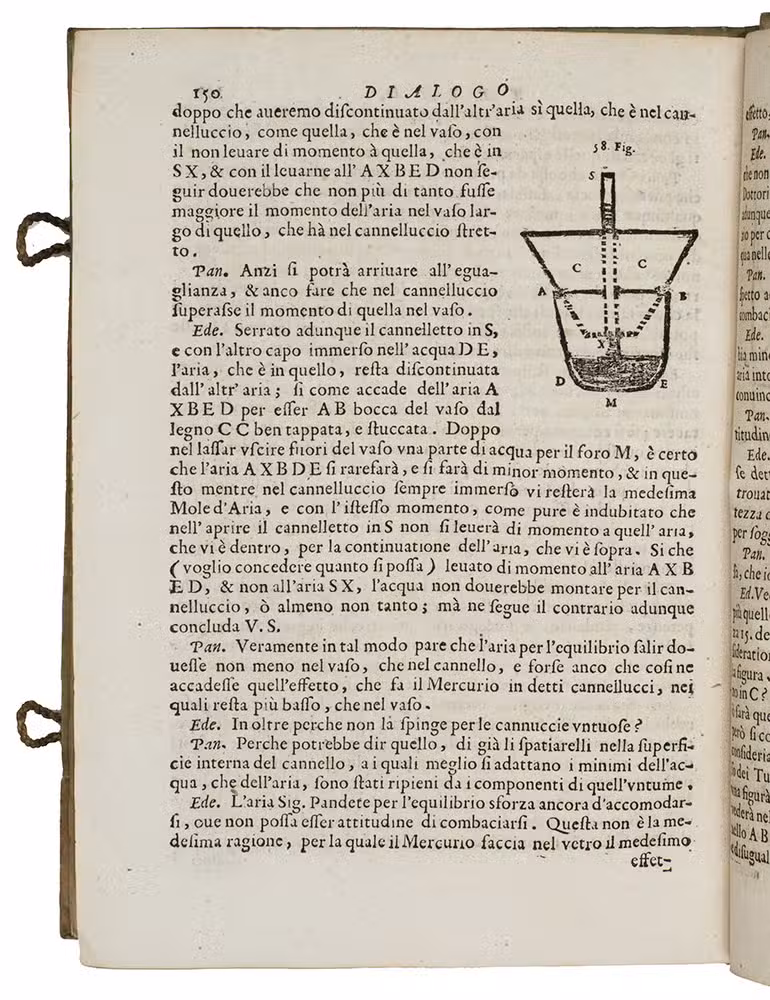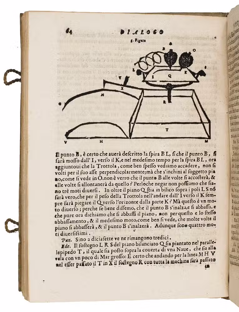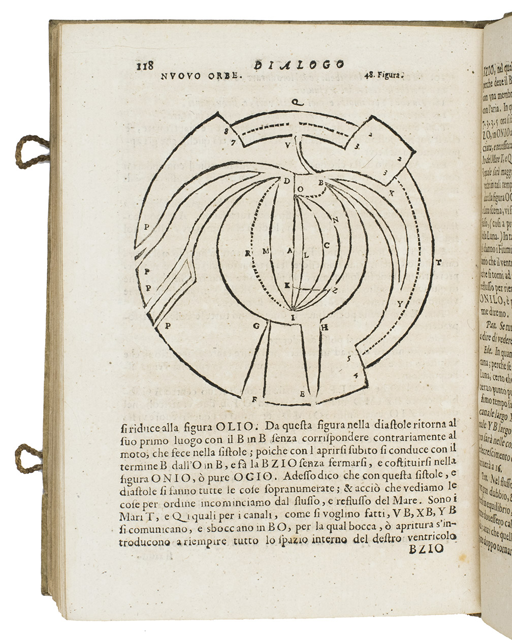 Livorno, Giovanni Vincenzo Bonfigli, 1667. 4to. With 66 woodcut diagrams and other illustrations in text. Contemporary limp sheepskin parchment, with 2 fastenings made from loops of braided cord on the front cover but only traces of thongs on the back. XII, 179, [1] pp.