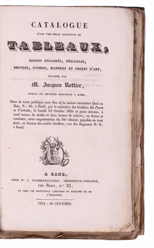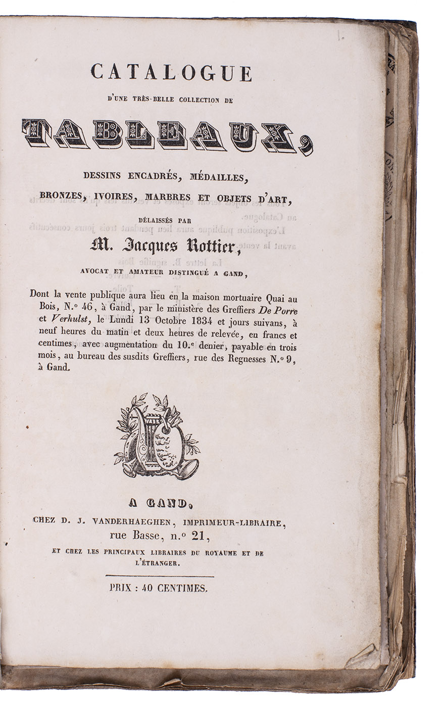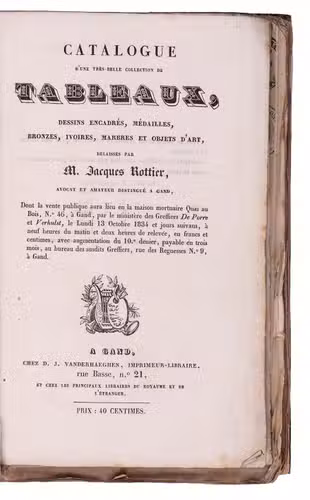 Catalogue d'une très-belle collection de tableaux, dessins encadrés, médailles, bronzes, ivoires, marbres et objets d'art, délaissés par M. Jacques Rottier, avocat et amateur distingué a Gand.