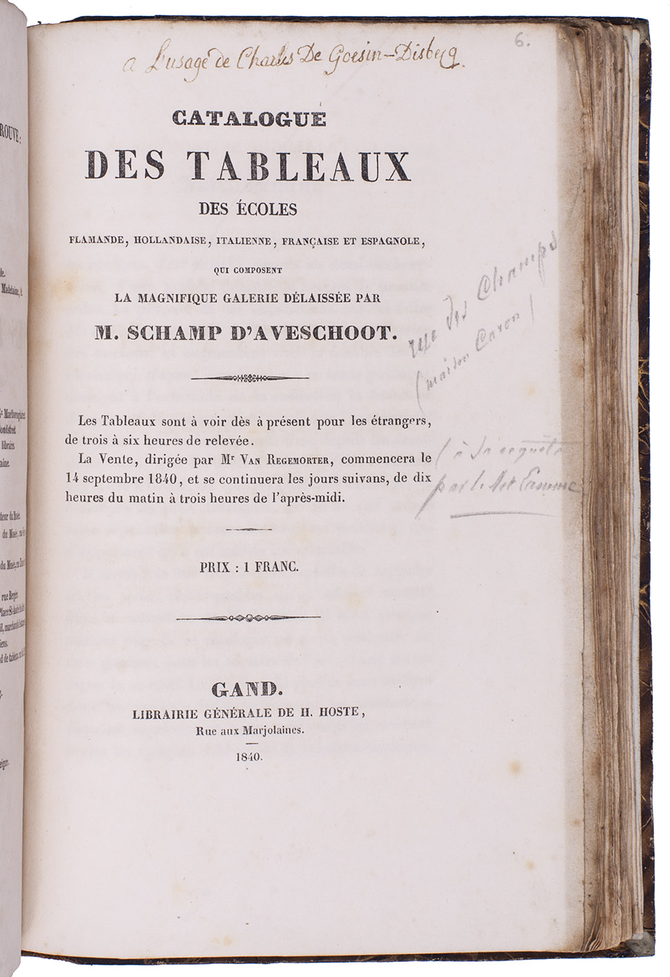 (6) SCHAMP D'AVESCHOOT, Jean. Catalogue des tableaux des écoles Flamande, Hollandaise, Italienne, Française et Espagnole, qui composent la magnifique galerie délaissée par M. Schamp d'Aveschoot.